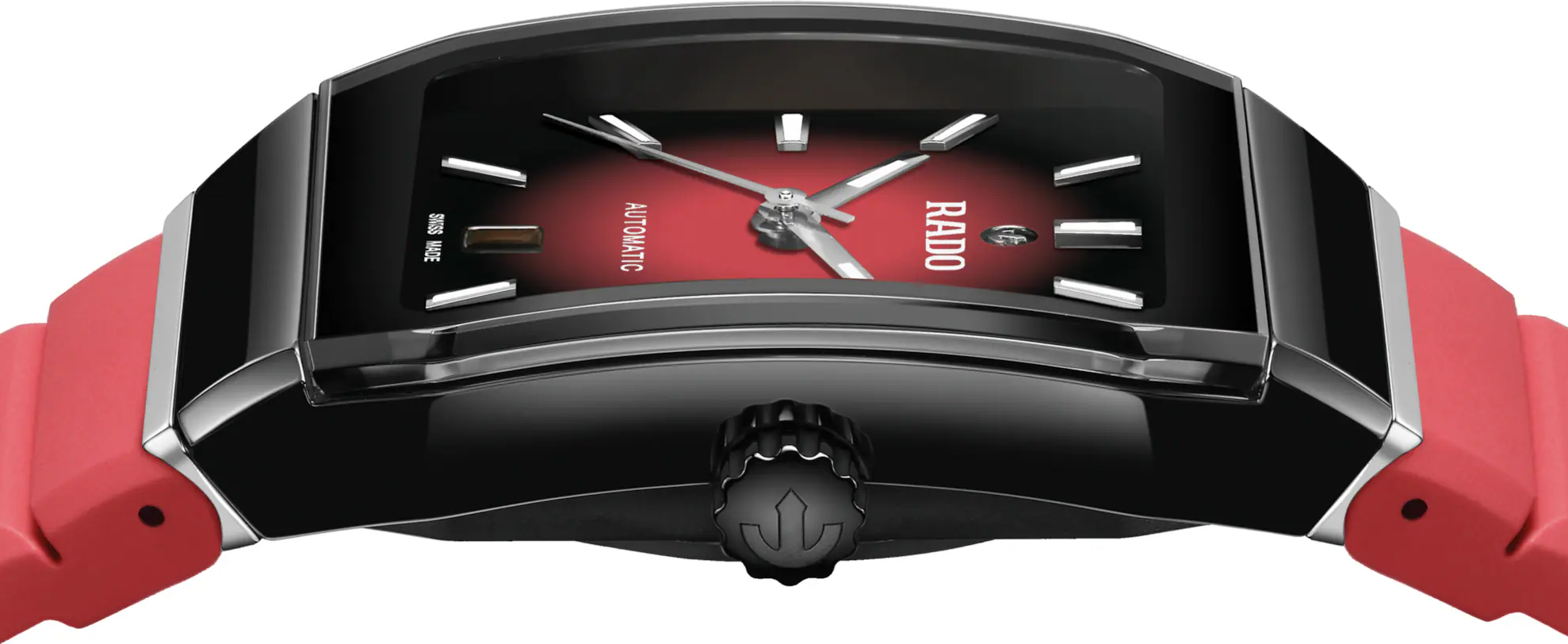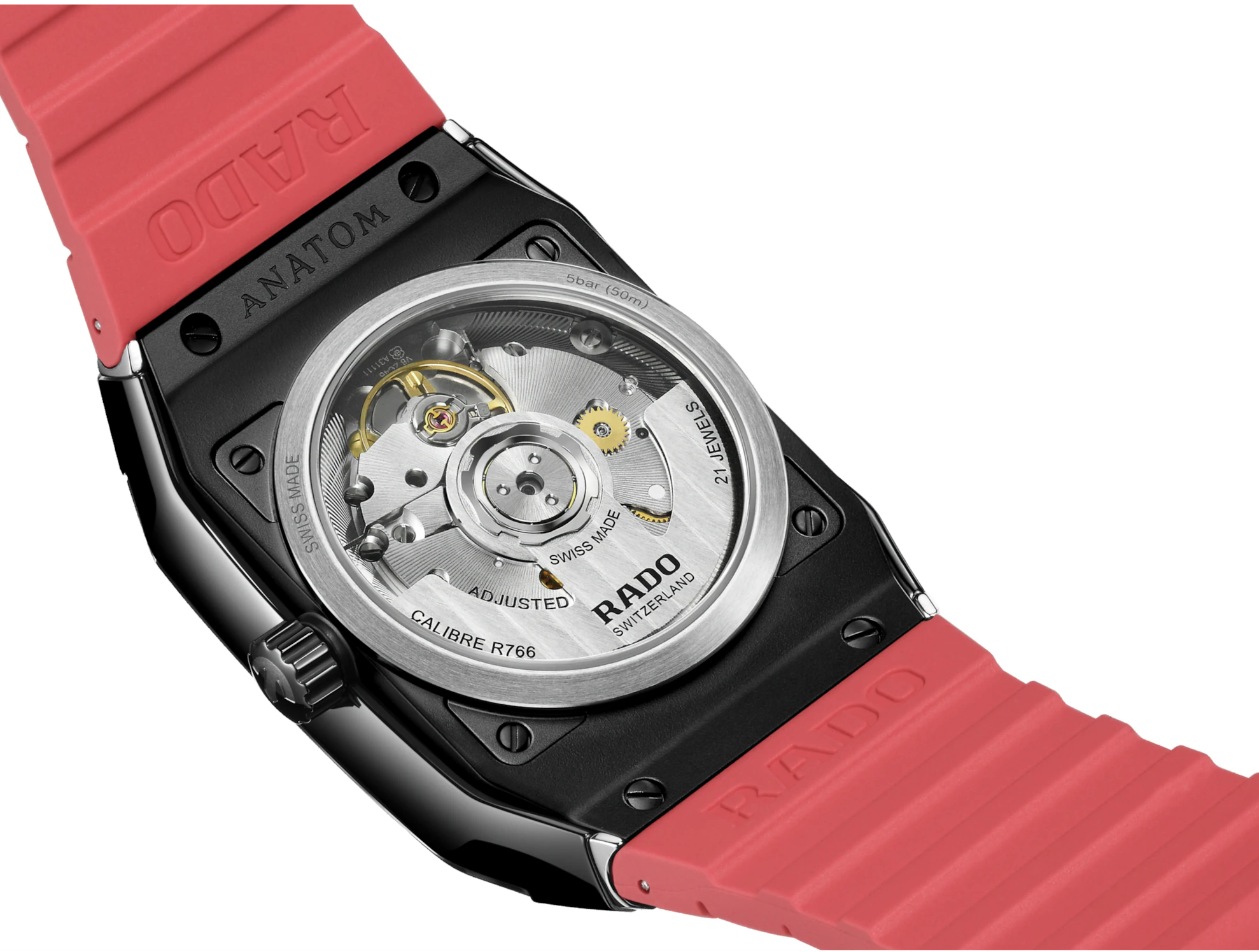 Hodinky Rado Anatom, uvedené poprvé v roce 1983, si získaly pověst ikon díky spojení průkopnického designu a mimořádného pohodlí. Jejich typickým znakem je válcovitě tvarované, metalizované safírové sklo, které je na obou stranách symetricky zkosené. Toto zkosení plynule navazuje na leštěné high-tech keramické pouzdro, pokračuje přes leštěné koncové články z nerezové oceli a přechází do řemínku z grapefruitově červeného kaučuku