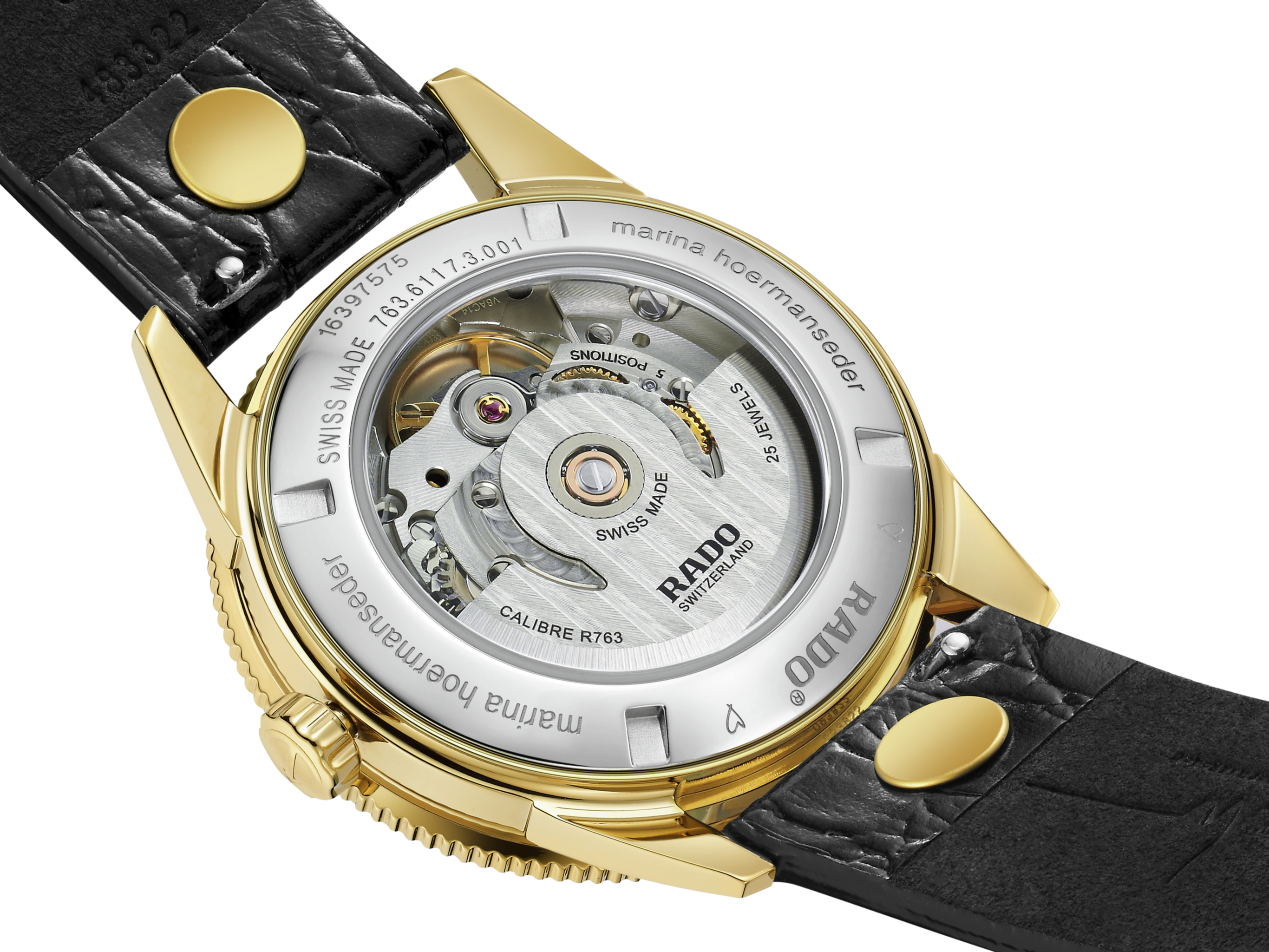 • Funkce a popis:Čas, datum, strojek Swiss Rado Automatic Caliber 763 (25 kamenů), rezerva chodu 80 hodin, krokové ústrojí ocel/kámen, polokmity setrvačky 21.600/h (3 Hz) = přesnost chodu (diference) 3 - 5 vteřin denně (vysoké přesnosti stroje je docíleno jemnou regulací šroubky na ramínkách věnce setrvačky + regulací stroje v dalších dvou polohách navíc a to devítkou dolů a víčkem pouzdra nahoru), patentová sestava jemné regulace, automatický nátah (hodinky se natahují pohybem ruky) + ruční nátah (hodinky lze natáhnout/dotáhnout dle potřeby i ručně korunkou, rotor samonátahu disponuje funkcí oboustranného nátahu