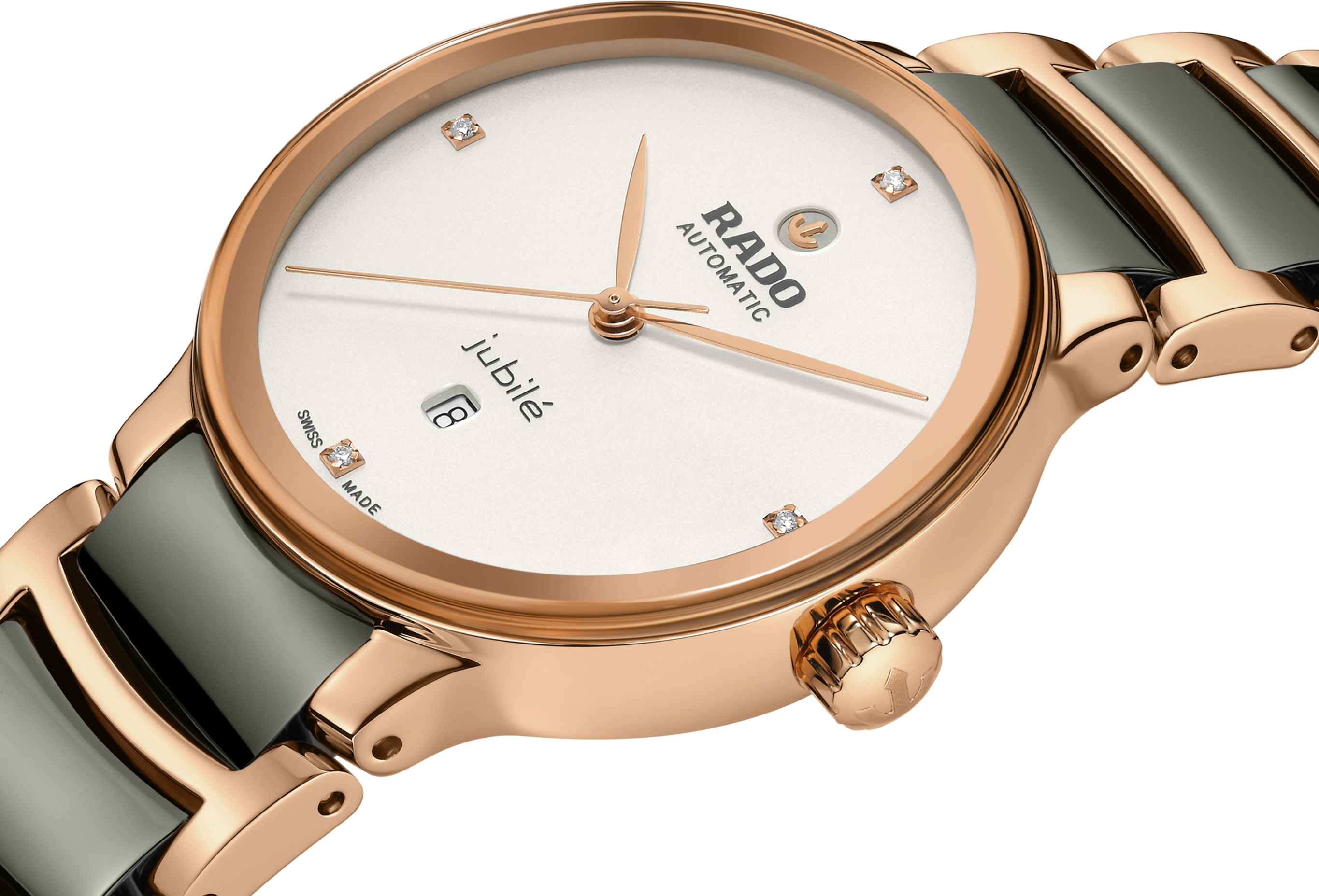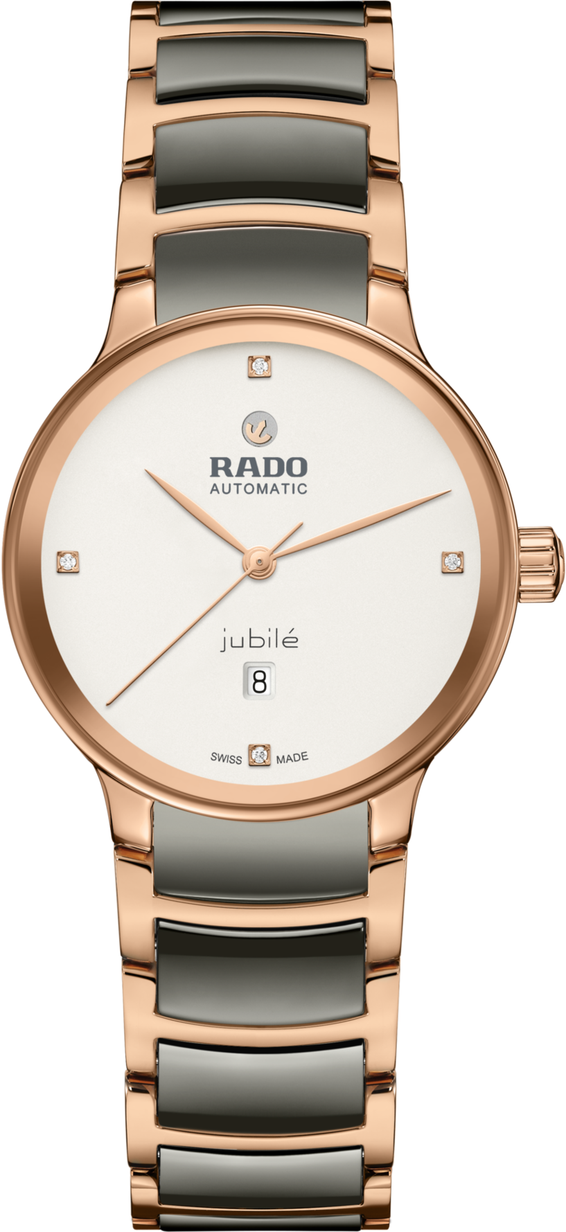 Kolekce Rado Centrix Automatic Diamonds představuje nejlepší design hodinek Rado s použitím inovovaných materiálů a se silným smyslem pro styl. Tento nejnovější přírůstek R30019722 do švýcarské řady má pouzdro a náramek z leštěné nerezové oceli s PVD povlakem v barvě růžového zlata s plazmovými high-tech keramickými středními články. Bílý číselník se 4 diamanty zdůrazněný tištěným logem „jubilé“ dokonale ladí s ručkami v barvě růžového zlata. ...