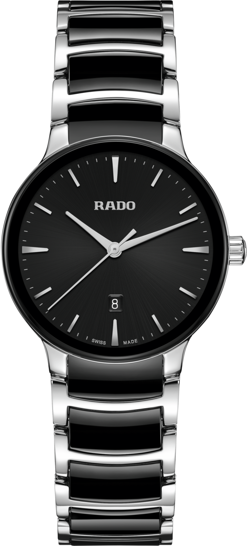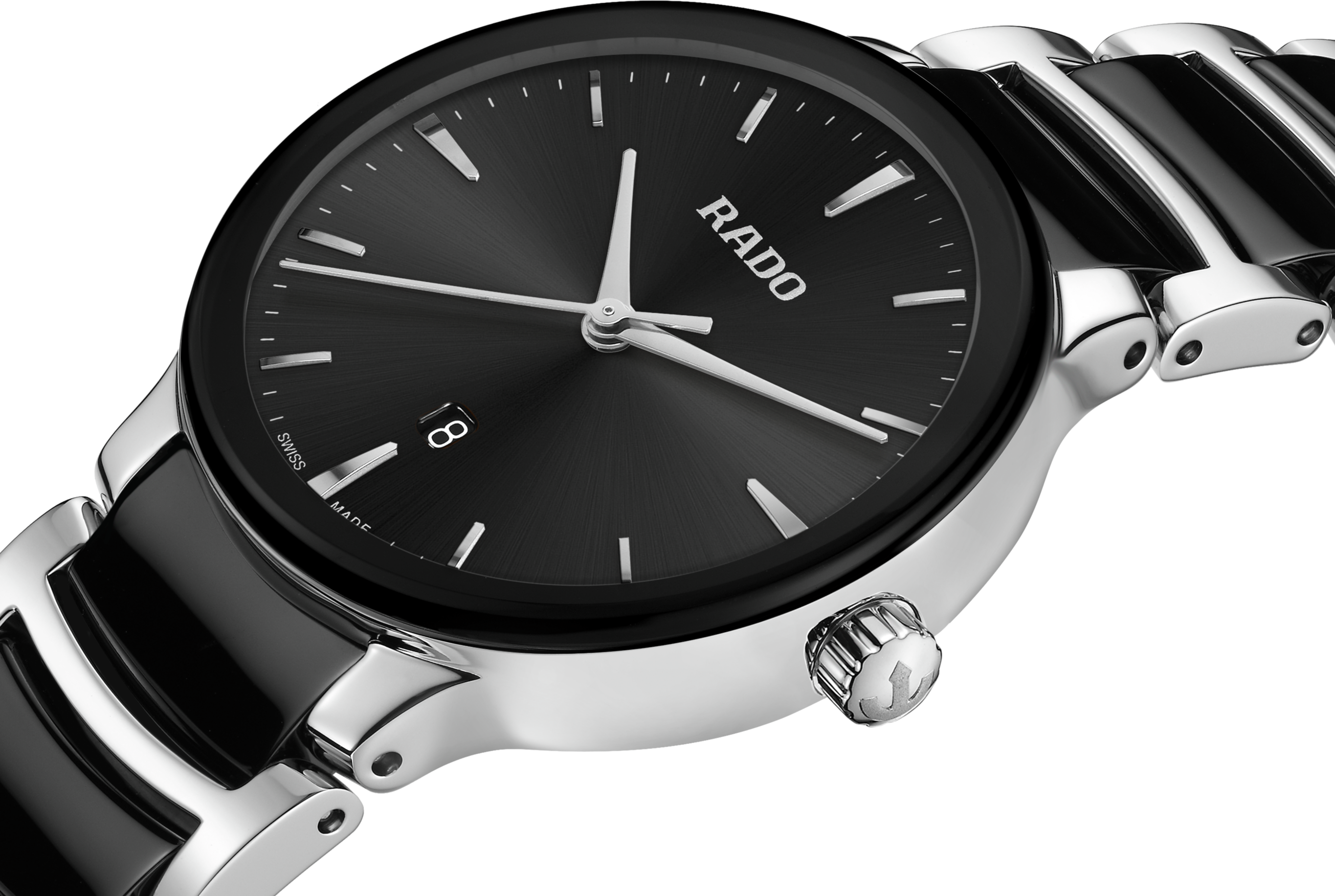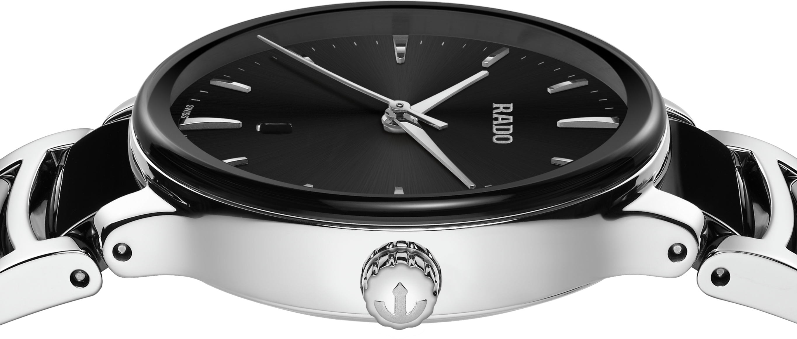 Klasický Centrix Quartz byl přepracován nejen technicky, ale i esteticky. Upravený model R30026152 má zaoblené safírové sklíčko, které zasahuje až k okraji, a zakřivené pouzdro splývající se zakřiveným okrajem krystalu. Upravené ouška pouzdra a náramek z leštěné nerezové oceli s černými high-tech keramickými středními články dotvářejí celkový vzhled těchto ikonických hodinek. Černý sluneční číselník s aplikovanými indexy v barvě rhodia dokonale ladí s ručičkami v barvě rhodia.