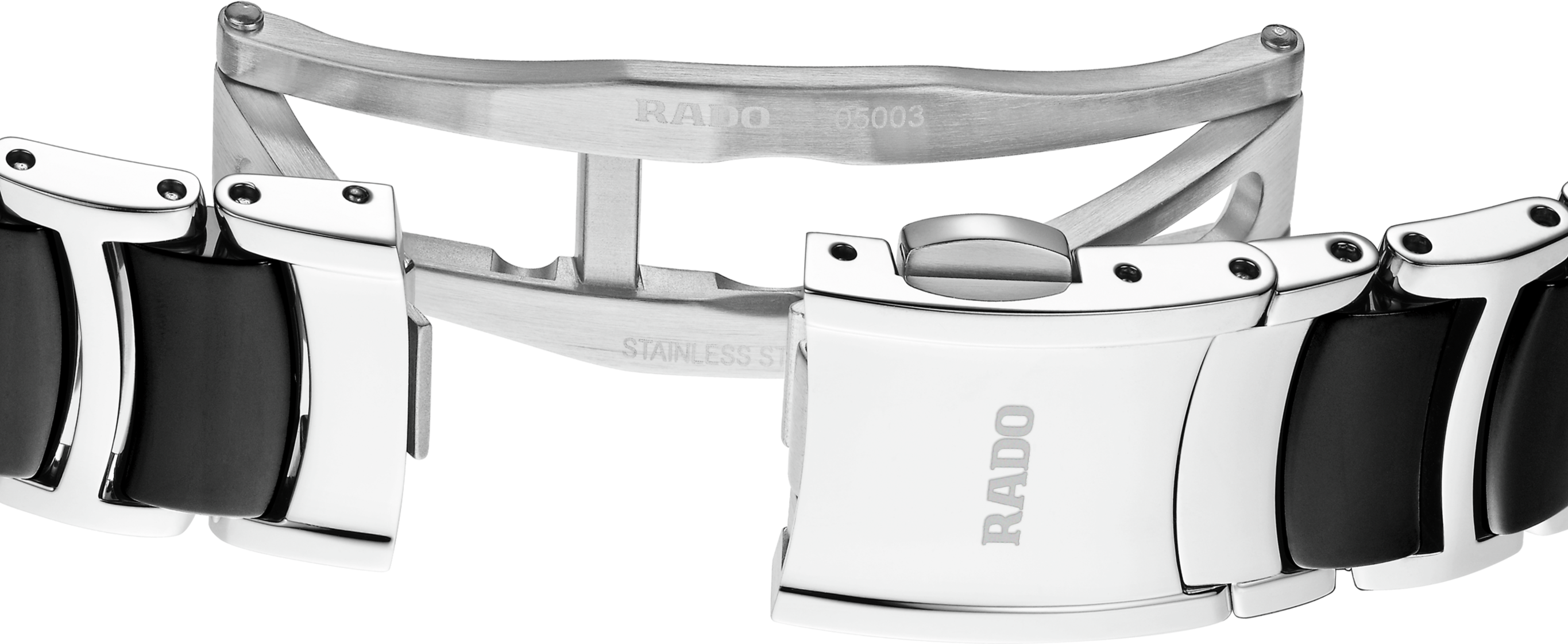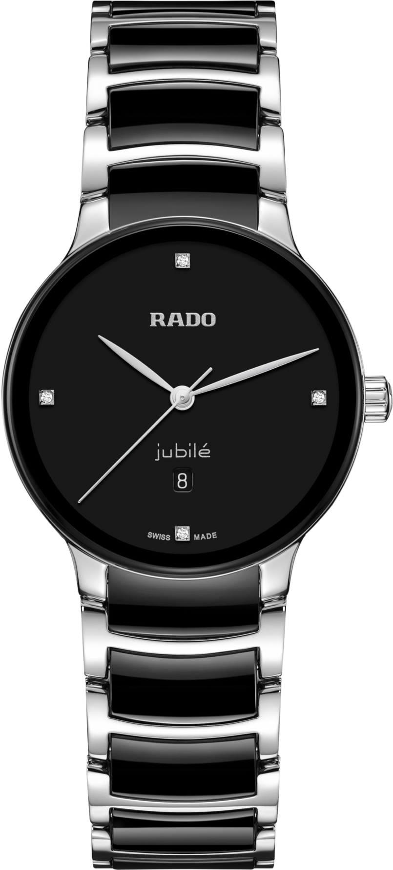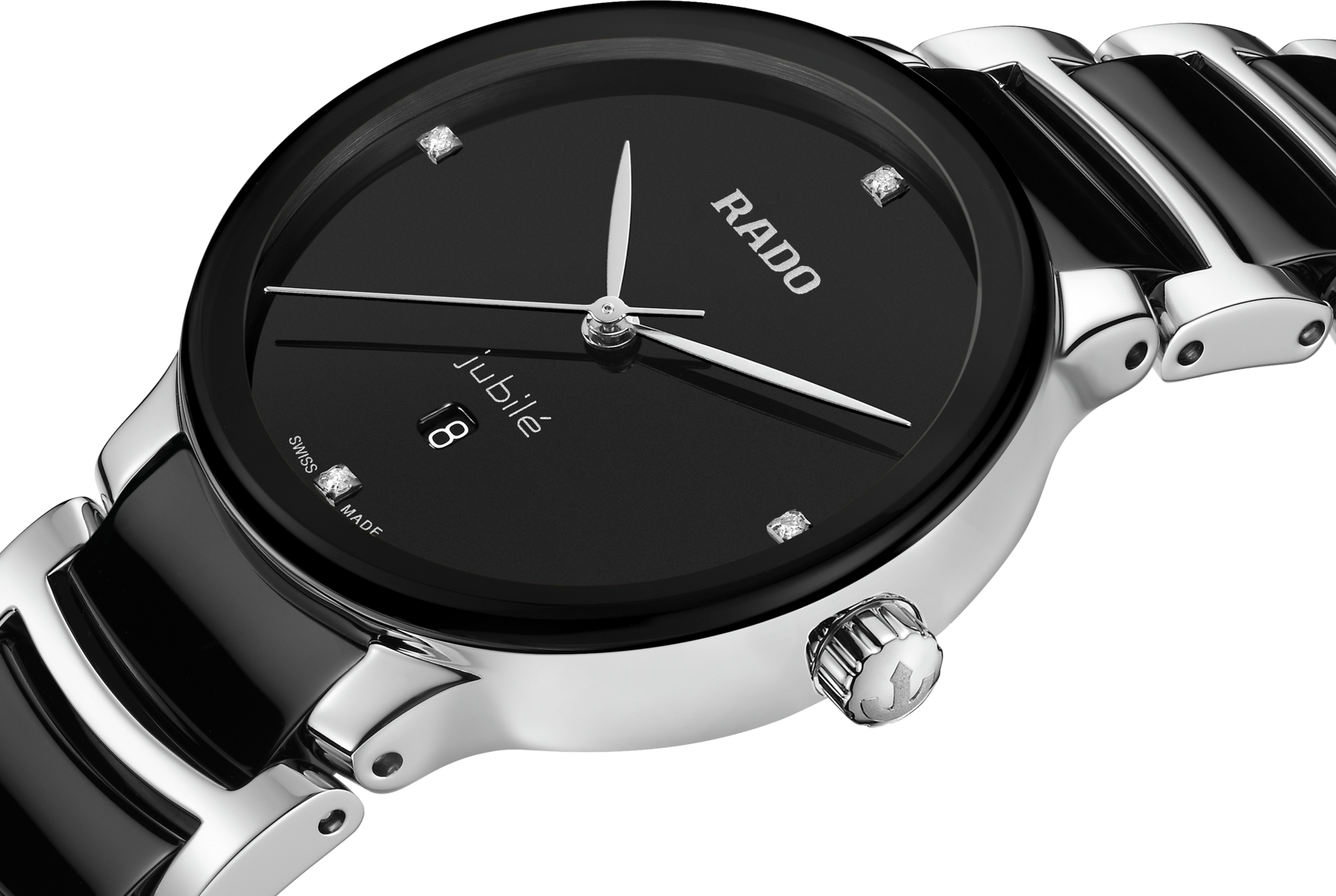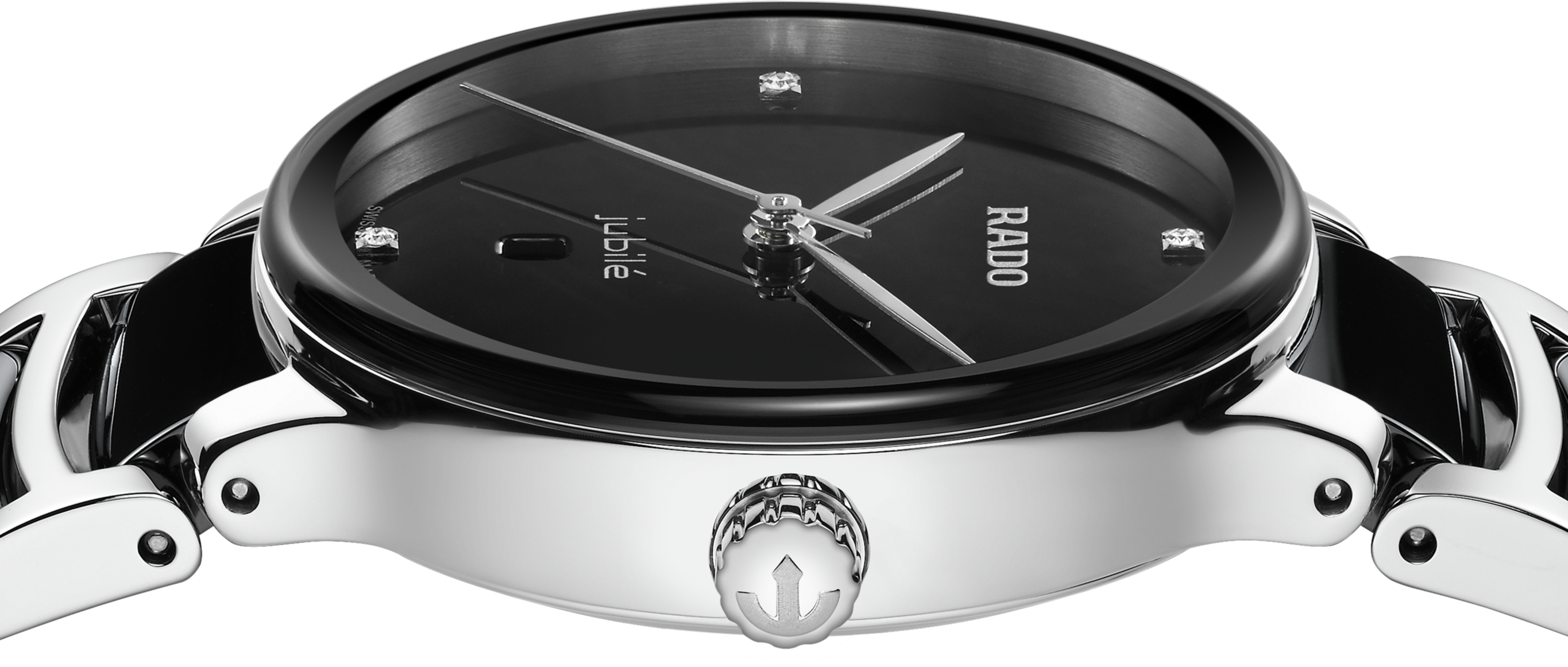 Klasické hodinky Centrix Quartz Diamonds byly přepracovány nejen technicky, ale i esteticky. Upravený model R30026712 má zaoblené safírové sklíčko, které zasahuje až k okraji, a také zakřivené pouzdro splývající se zakřiveným okrajem sklíčka. Upravené ouška pouzdra a náramek z leštěné nerezové oceli s černými high-tech keramickými středními články dotvářejí celkový vzhled těchto ikonických hodinek. Černě lakovaný číselník se 4 diamanty, zdůrazněný tištěným logem „jubilé“, dokonale ladí s ručkami v barvě rhodia.