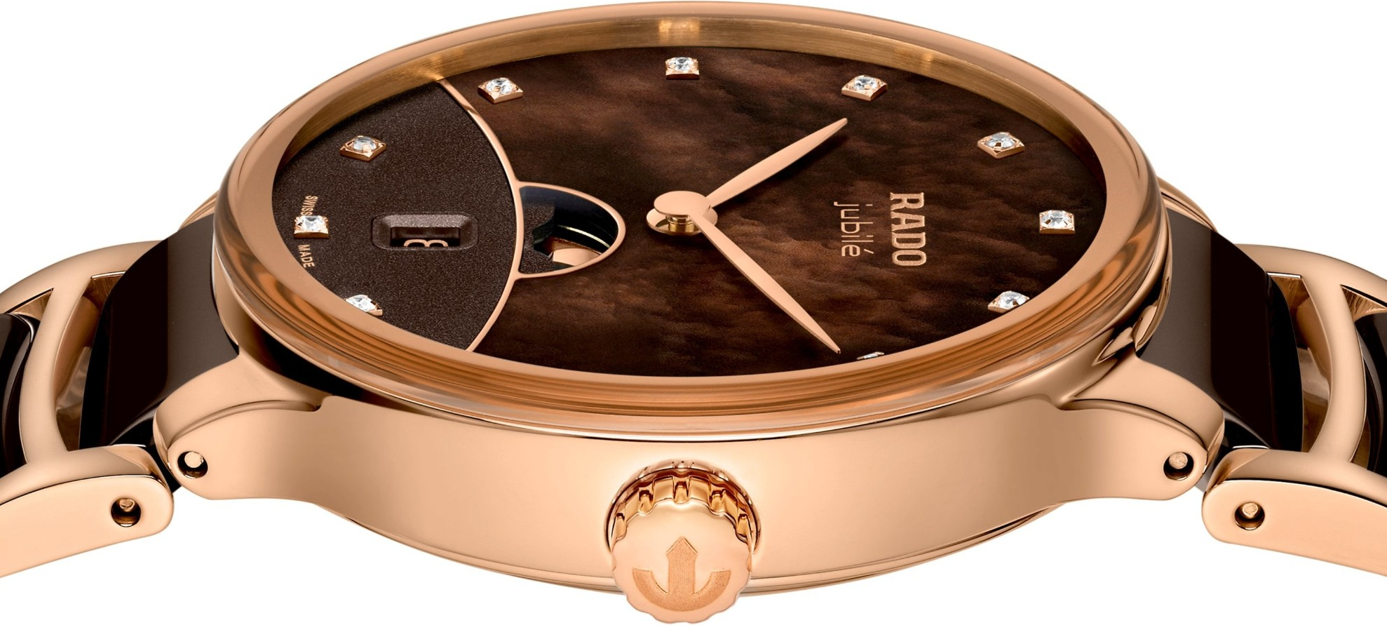 Rado Centrix Diamonds R30232902 jsou mimořádně elegantní švýcarské hodinky, které osloví především zákaznici hledající spojení jemného luxusu, moderně přepracované klasiky a vysoké každodenní praktičnosti. Tento model z řady Centrix Moonphase Diamonds působí velmi kultivovaně a už na první pohled zaujme poetickým zpracováním číselníku, hnědými keramickými články tahu a teplými detaily v odstínu růžového zlata. Hnědý číselník nepůsobí obyčejně - Rado jej pojalo jako ...