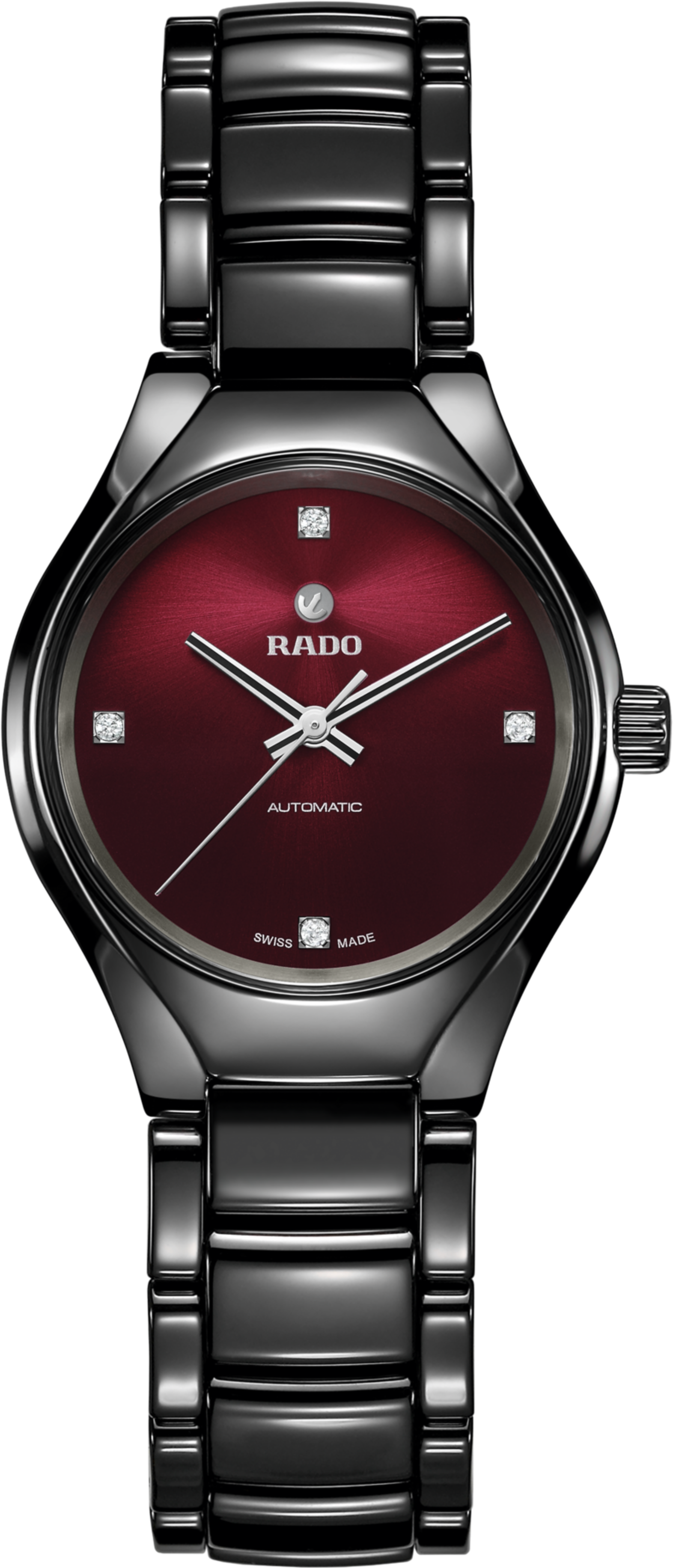 Dnes večer jsem si nasadila červené hodinky – sebevědomé ženy považují Rado True s třešňově červeným číselníkem a čtyřmi třpytivými diamanty za hodinky, které dodají každému večerním šatům nádech půvabu. Kulaté pouzdro plynule přechází do náramku a se sametovým leskem černé high-tech keramiky dotváří elegantní vzhled hodinek o průměru 30 mm.