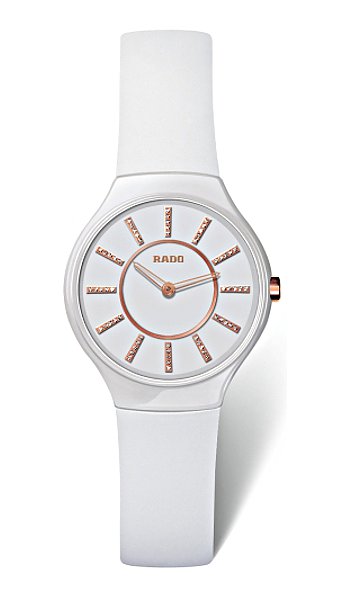 • Funkce a popis:Čas, strojek swiss ETA quartz - přesnost chodu 0 - 0,4 vteřiny denně, materiál HTC (High-tech Ceramic) - velmi tvrdý materiál odolný vůči otěru o tvrdosti 1.200 - 1.900 Vickers (velmi lehký,velmi příjemný na nošení - ihned získává teplotu Vašeho zápěstí, patent Rado), nejtenčí keramické hodinky na světě, váha pouhých 35 gramů, kaučukový řemínek s keramickou sponou,, číselník zdobí 60 diamantů o o váze 0,036 karátů