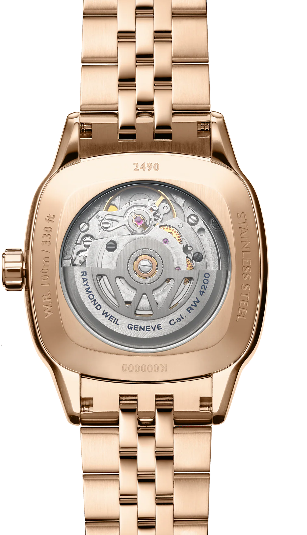 • Funkce a popis:Čas, datum, strojek Swiss Raymond Weil 4200 (základ Sellita SW200-1) = rezerva chodu 41 hodin, 26 kamenových uložení, polokmity setrvačky 28.800/h (4 Hz)  = diference 2 - 4 vteřiny denně,  automatický nátah (hodinky se natahují pohybem ruky) + ruční nátah (hodinky lze natáhnout/dotáhnout i ručně korunkou), oboustranný nátah rotoru, korunka pouzdra s logem RW (Raymond Weil), průhledné zadní víčko pro náhled na strojek, číselník - gradientně zelený ciferník s charakteristickým gilošovaným vzorem ve tvaru písmene W a ručičky a indexy zušlechtěné bílou luminiscencí Super-Luminova®