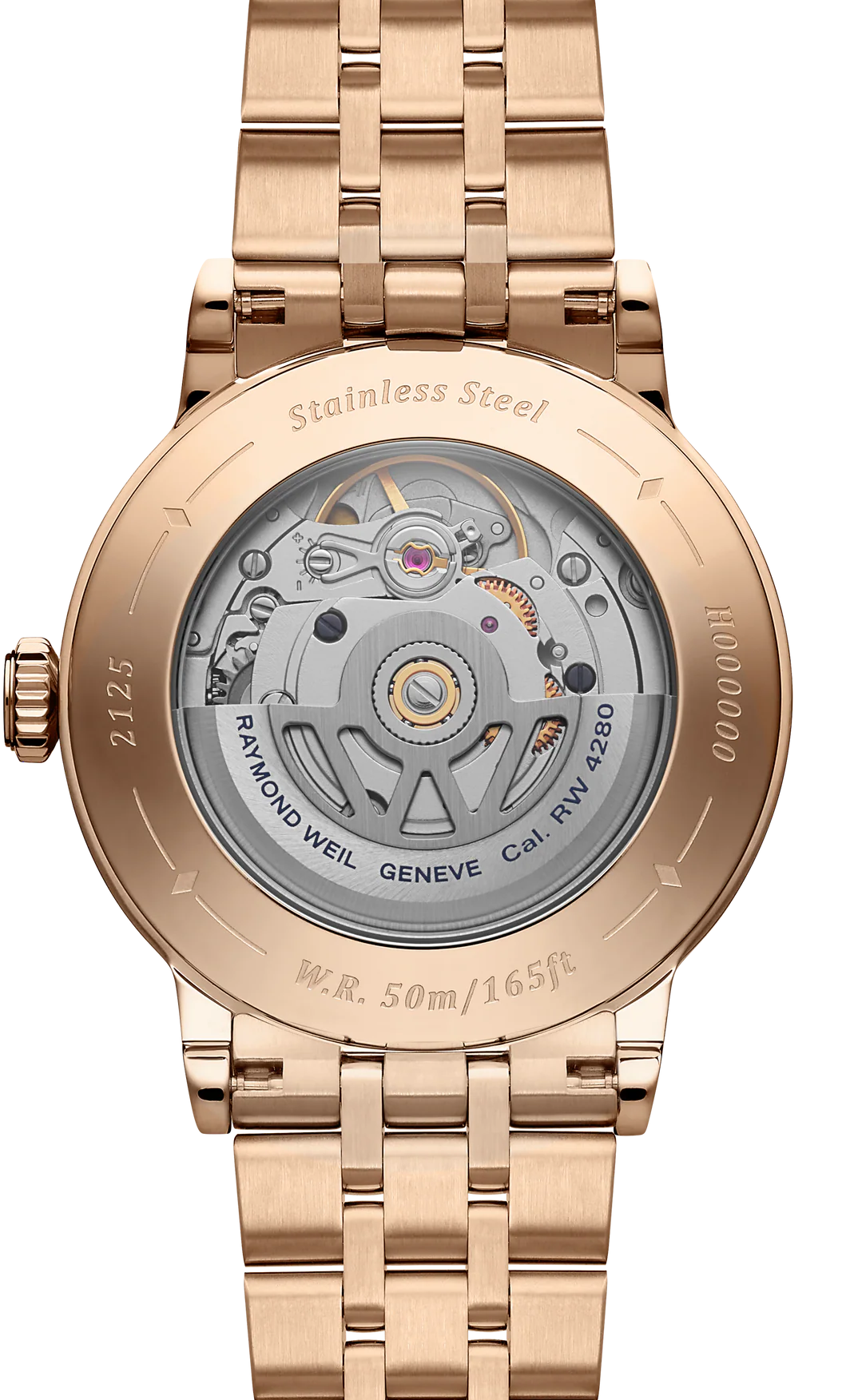 • Funkce a popis:Čas, strojek Swiss Raymond Weil RW4200 = rezerva chodu 41 hodin, 26 kamenových uložení, polokmity setrvačky 28.800/h (4 Hz)  = diference 2 - 4 vteřiny denně,  automatický nátah (hodinky se natahují pohybem ruky) + ruční nátah (hodinky lze natáhnout/dotáhnout i ručně korunkou), oboustranný nátah rotoru, korunka pouzdra s logem RW (Raymond Weil), průhledné zadní víčko pro náhled na strojek