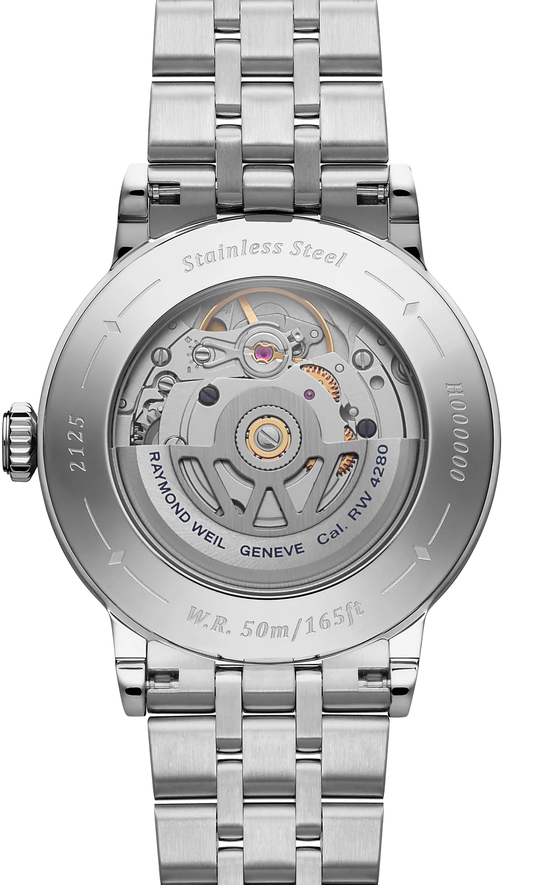 • Funkce a popis:Čas, strojek Swiss Raymond Weil RW4200 = rezerva chodu 41 hodin, 26 kamenových uložení, polokmity setrvačky 28.800/h (4 Hz)  = diference 2 - 4 vteřiny denně,  automatický nátah (hodinky se natahují pohybem ruky) + ruční nátah (hodinky lze natáhnout/dotáhnout i ručně korunkou), oboustranný nátah rotoru, korunka pouzdra s logem RW (Raymond Weil), průhledné zadní víčko pro náhled na strojek