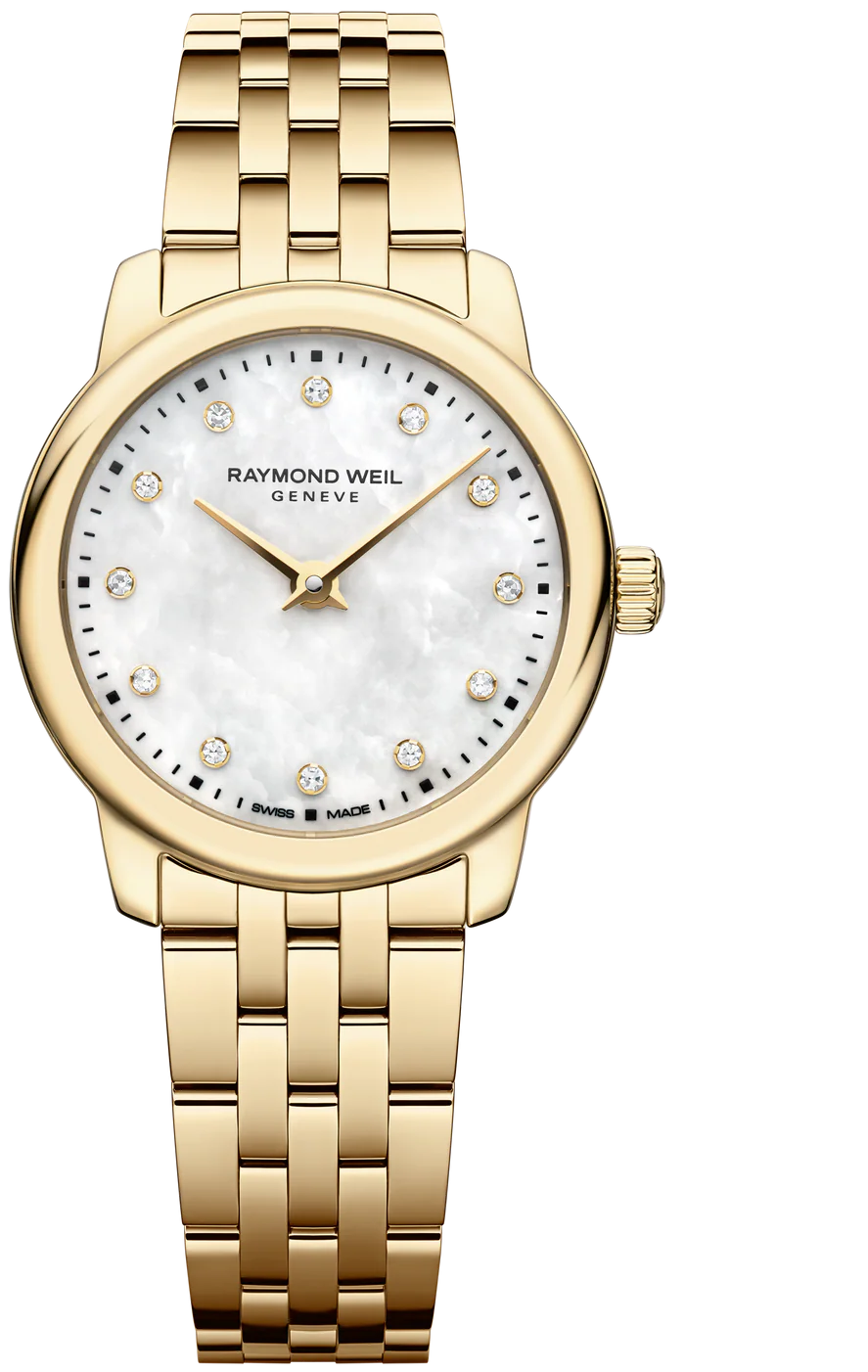 Raymond Weil Toccata 5024-P-97081 jsou dámské švýcarské hodinky, které nabízejí velmi elegantní spojení jemných rozměrů, zlatého tónu a perleťového číselníku s diamantovými indexy. Oproti bohatěji osazeným variantám působí tato reference o něco střídměji, a právě v tom tkví její kouzlo. Bílý perleťový číselník dodává hodinkám lehkost, ženskost a vizuální hloubku, zatímco 12 laboratorně pěstovaných diamantů na pozicích hodin vytváří decentní a velmi ...
