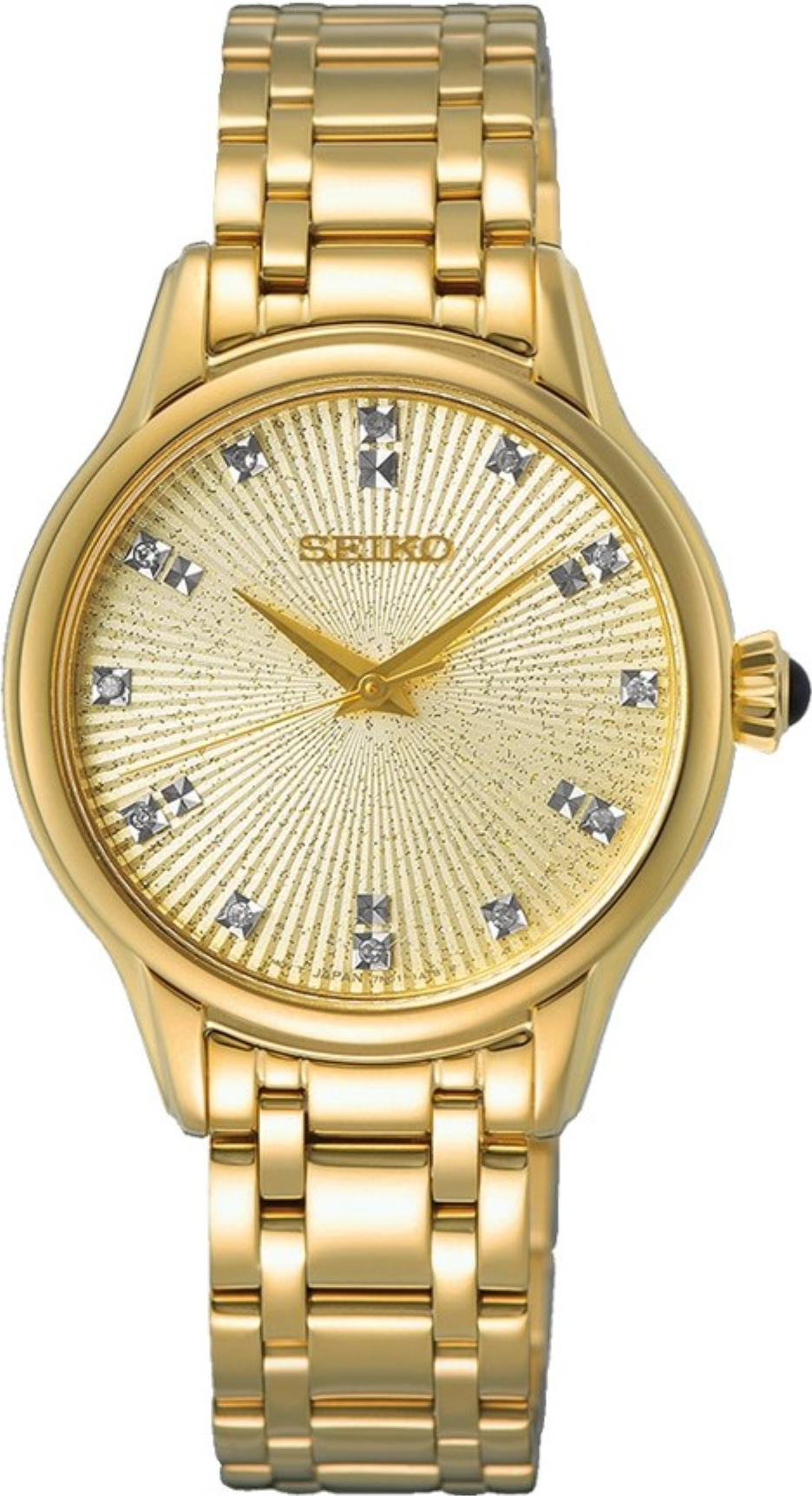 Elegantní dámské hodinky Seiko SRZ552P1 s číselníkem barvy šampaň s paprskovitou strukturou jsou doplněny zlatými dauphine ručkami a diamanty zasazenými na pozici hodinových indexů. Díky quartzovému strojku 7N01 jsou tyto Seika spolehlivé a přesné, safírové sklíčko ...