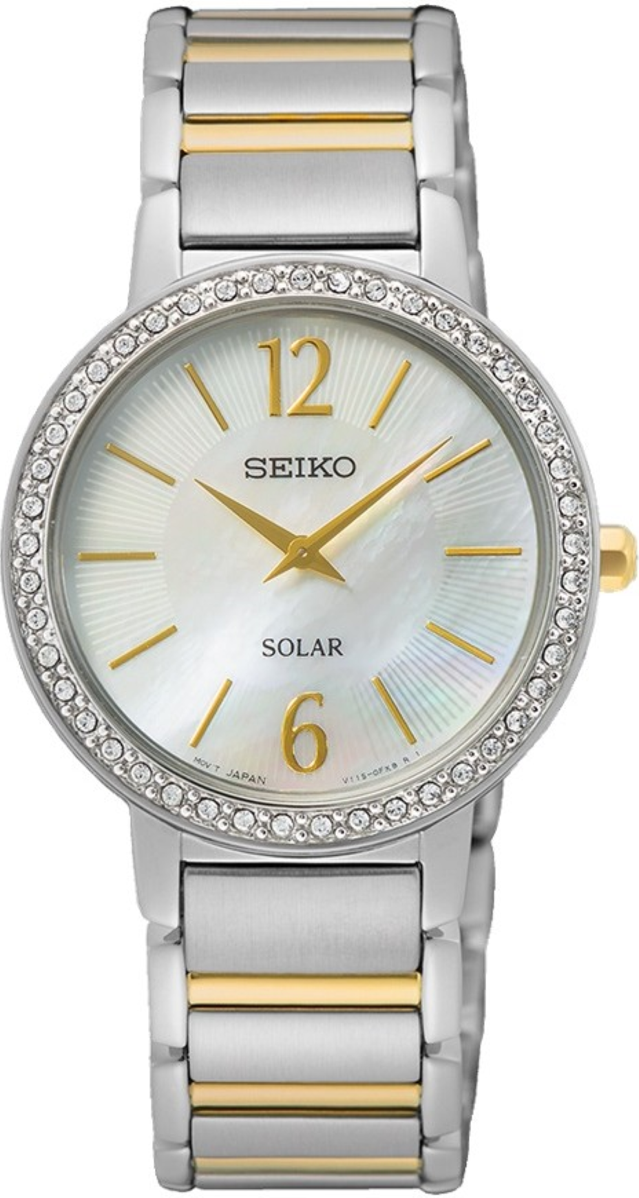 • Funkce a popis:Čas, solární nabíjení, strojek quartz Seiko Caliber V115 = rezerva chodu až 12 měsíců při plném nabití, luneta je osázená zirkony