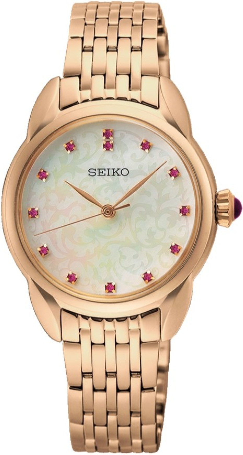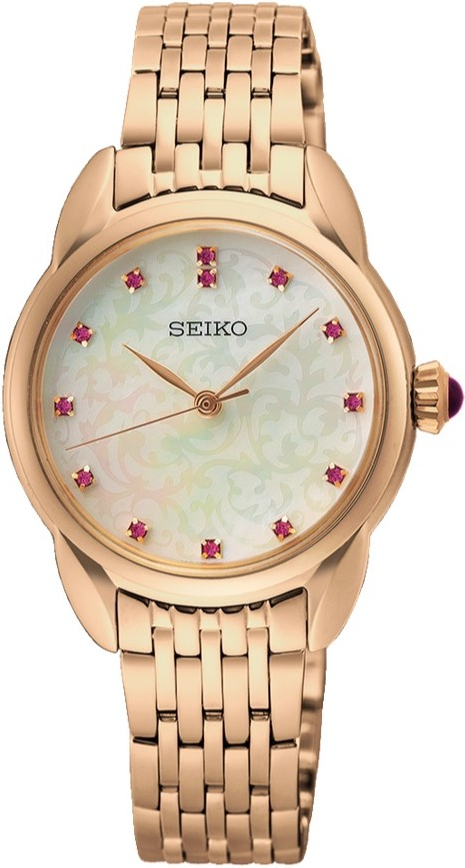 Hodinky Seiko SUR564P1 jsou díky svému zpracování a designu vhodným doplňkem do společnosti, ale také pro každodenní nošení. Pouzdro i náramek hodinek jsou vyrobené z nerezové oceli v PVD úpravě růžového zlata. Zákaznicemi velice oblíbený jemný motivu na číselníku je vhodně doplněn elegantními dauphine ručkami, celek dotváří dobře čitelné kamínky na hodinových pozicích. Číselník je chráněn tvrzeným minerálním sklíčkem Hardlex ...