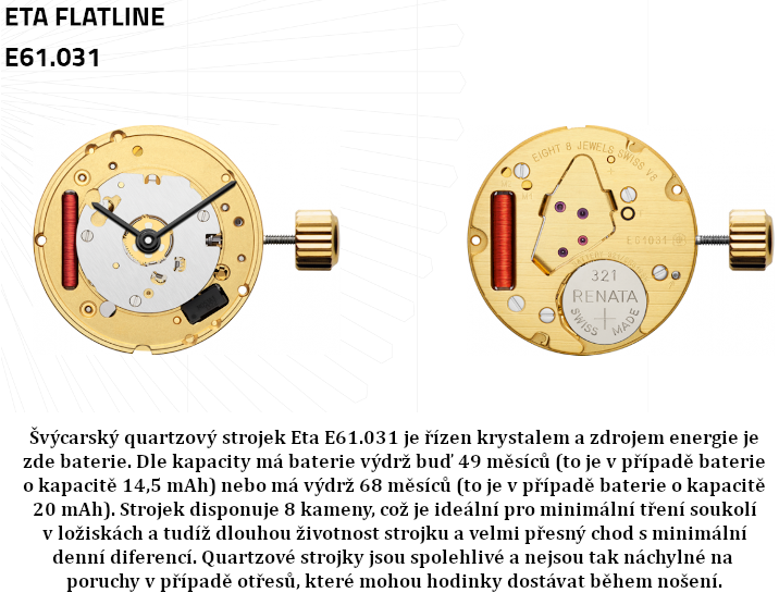 Švýcarský quartzový strojek Eta E61.031 je řízen krystalem a zdrojem energie je zde baterie. Dle kapacity má baterie výdrž buď 49 měsíců (to je v případě baterie o kapacitě 14,5 mAh) nebo má výdrž 68 měsíců (to je v případě baterie o kapacitě 20 mAh). Strojek disponuje 8 kameny, což je ideální pro minimální tření soukolí v ložiskách a tudíž dlouhou životnost strojku a velmi přesný chod s minimální denní diferencí. Quartzové strojky jsou spolehlivé a nejsou tak náchylné na poruchy v případě otřesů, které mohou hodinky dostávat během nošení.