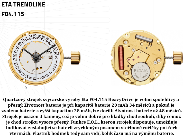 Quartzový strojek švýcarské výroby Eta F04.115 HeavyDrive je velmi spolehlivý a přesný. Životnost baterie je při kapacitě baterie 20 mAh 34 měsíců a pokud je zvolena baterie s vyšší kapacitou 28 mAh, lze docílit životnosti baterie až 48 měsíců. Strojek je osazen 3 kameny, což je velmi dobré pro hladký chod soukolí, díky čemuž je chod strojku vysoce přesný. Funkce E.O.L., kterou strojek disponuje, umožňuje indikovat zeslabující se baterii zrychleným posunem vteřinové ručičky po třech vteřinách. Vlastník hodinek tedy sám vidí, kolik času má na výměnu baterie.
