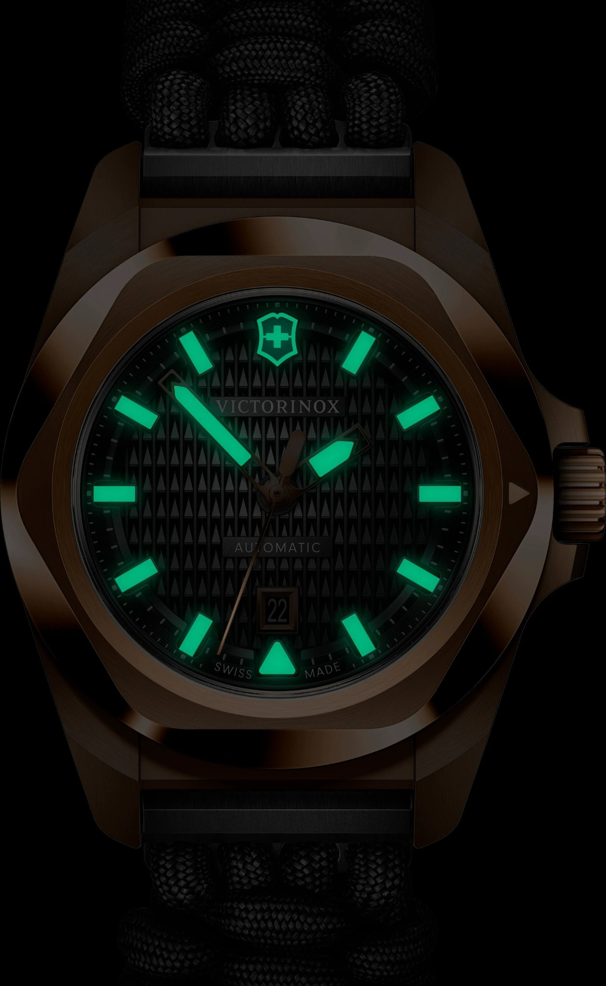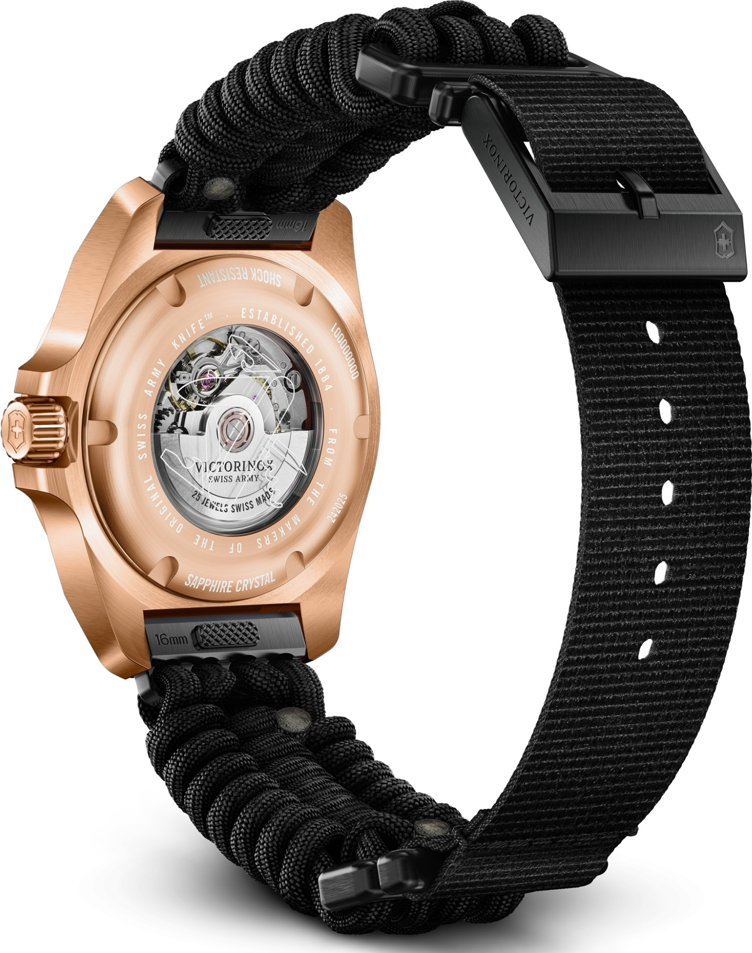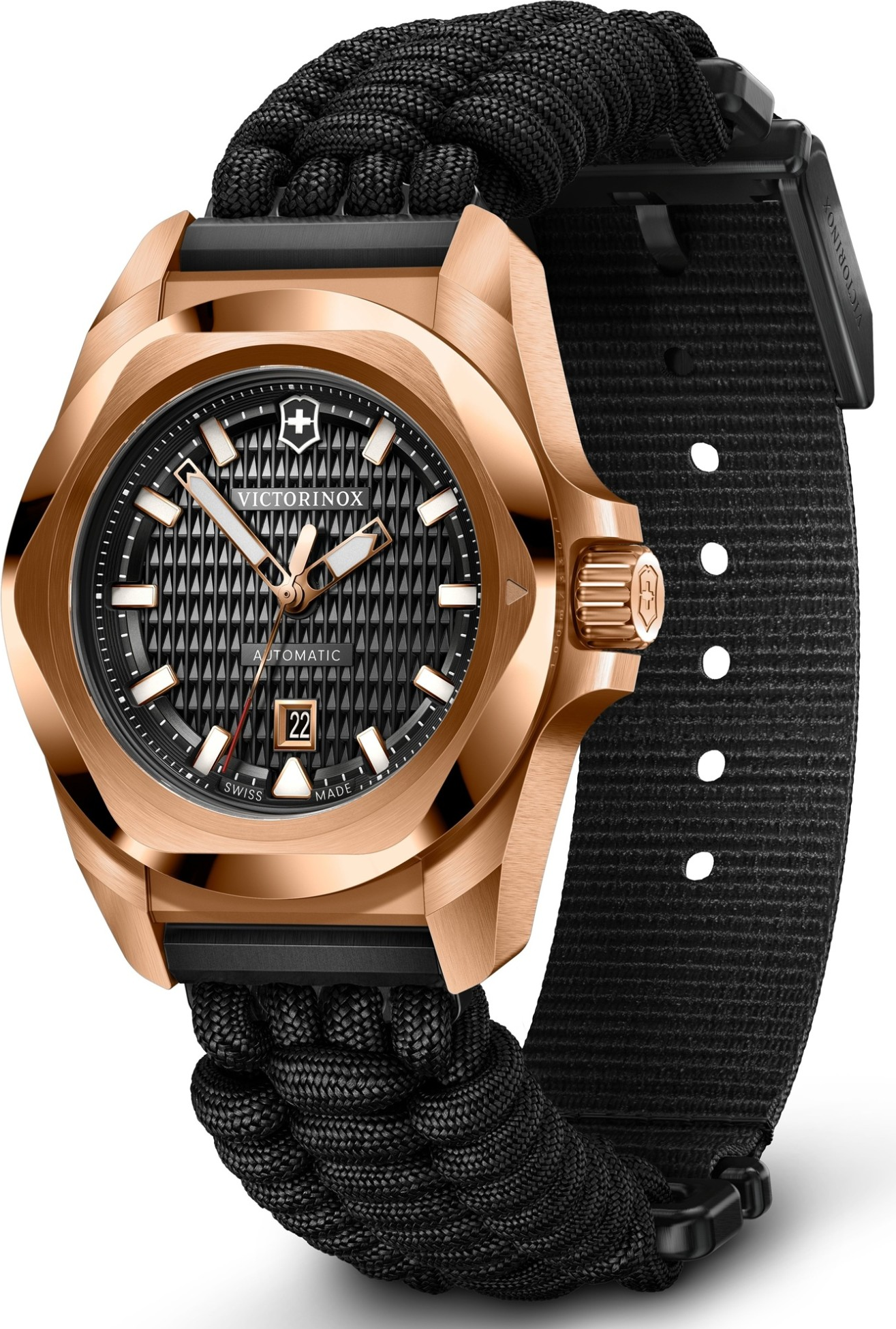 Victorinox I.N.O.X. Small Automatic 242025.1 je dámský mechanický model, který kombinuje technickou kulturu řady I.N.O.X. s elegantněji laděným, výrazně sofistikovaným vzhledem. Tato reference zaujme na první pohled kombinací pouzdra v tónu růžového zlata, černého číselníku s guilloché strukturou a černého paracordu. Jde o velmi neobvyklé a současně velmi promyšlené spojení, které hodinkám dodává charakter luxusnějšího, ale stále funkčního sportovně elegantního modelu. Victorinox ...