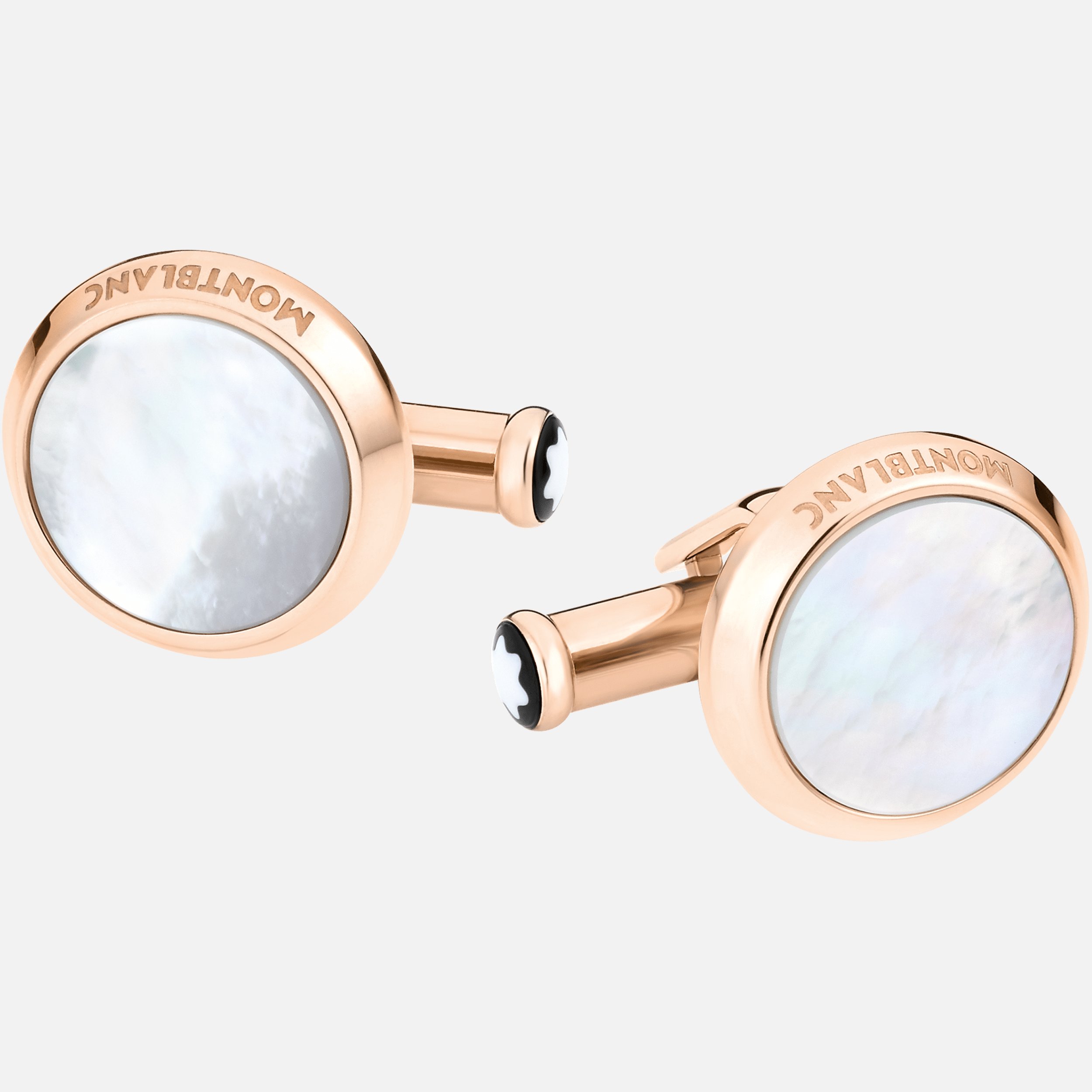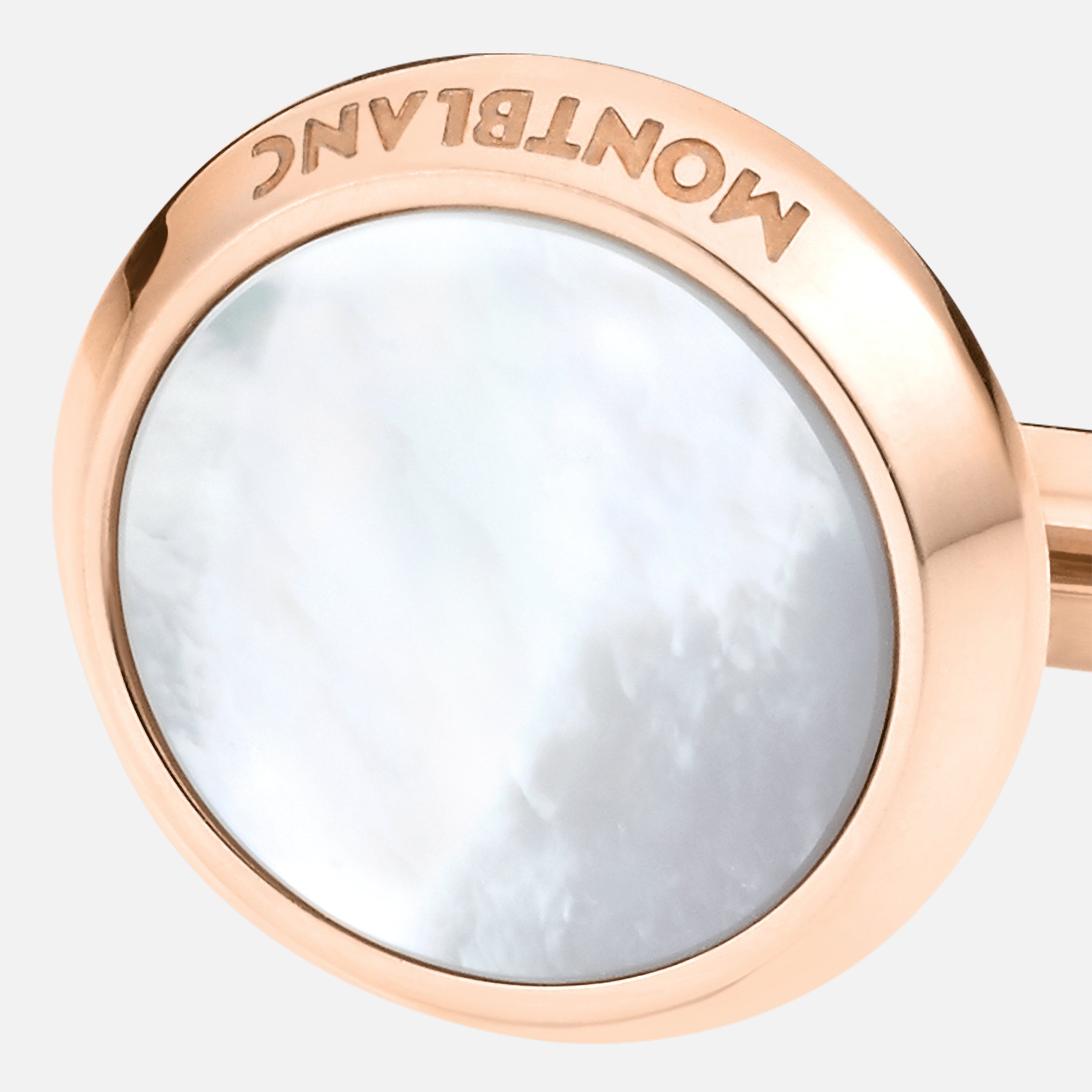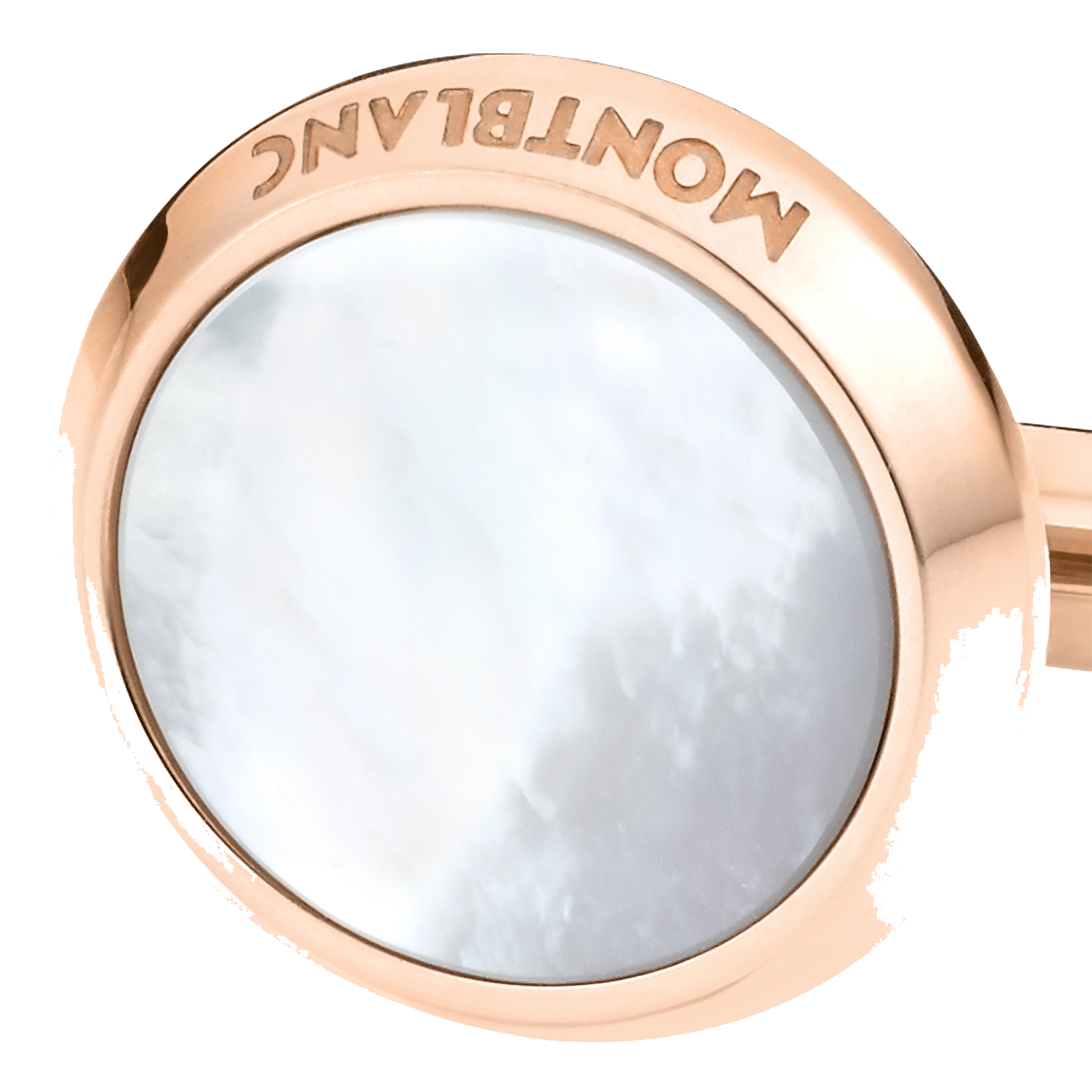 Manžetové knoflíčky Meisterstück MB116662 oslavují nadčasový styl. V souvislosti s psacím nástrojem Montblanc Meisterstück vytváří nadčasový kulatý tvar z nerezové oceli s povrchovou úpravou PVD v barvě růžového zlata a perleťovou vložkou klenot se silným podpisem Montblanc.