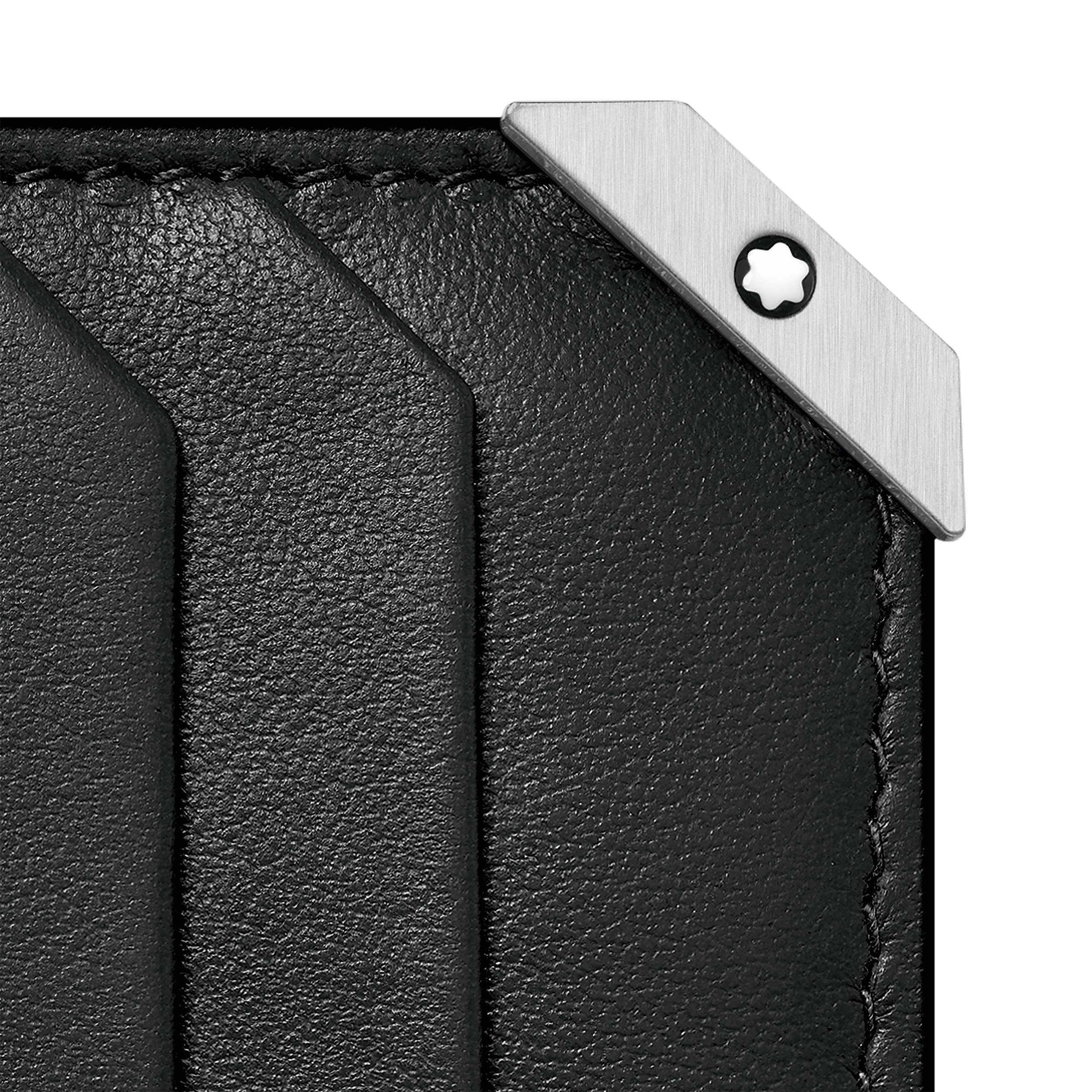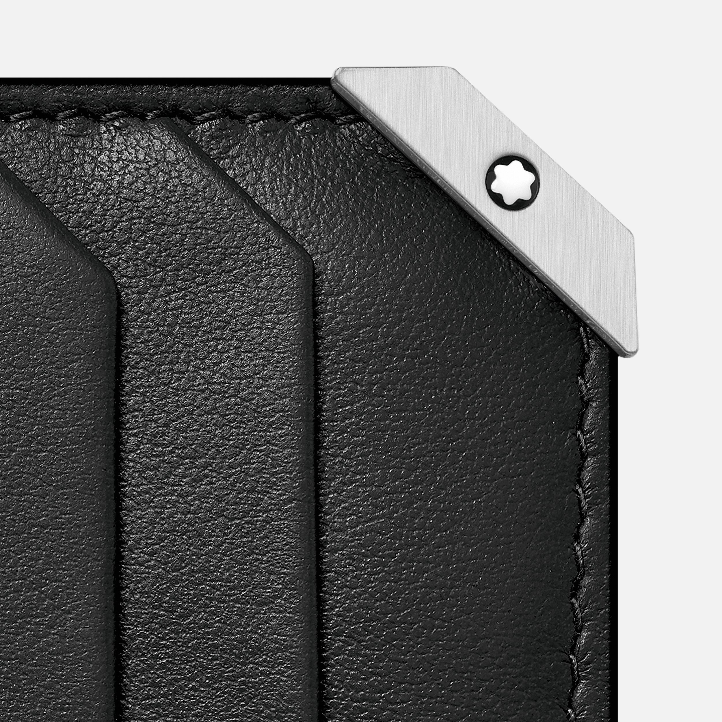 V měkké kůži s podpisovým kovovým rohem z kartáčovaného palladia má peněženka MB124089 2 přední kapsy, 6 přihrádek pro kreditní karty, 2 přihrádky na bankovky a 2 další kapsy. Navíc obložení blokující RFID na interních přihrádkách pro kreditní karty.