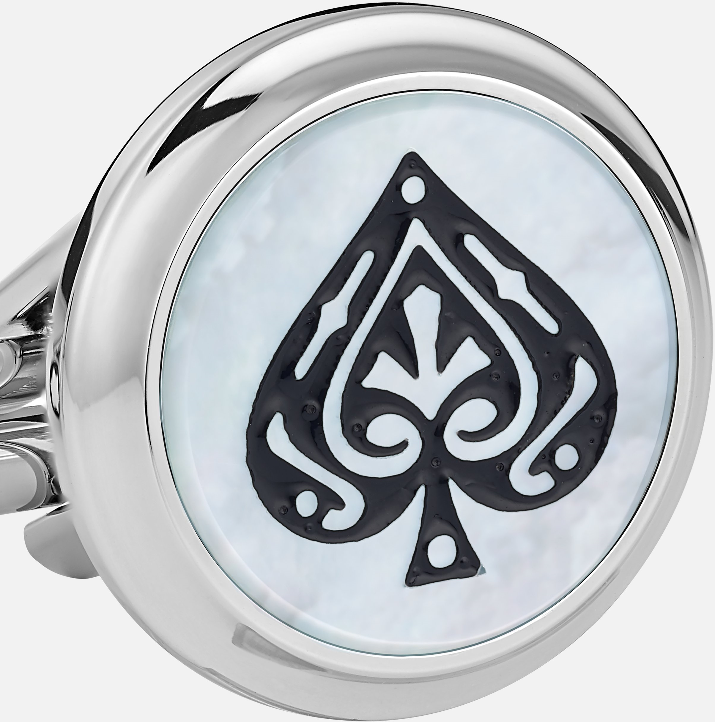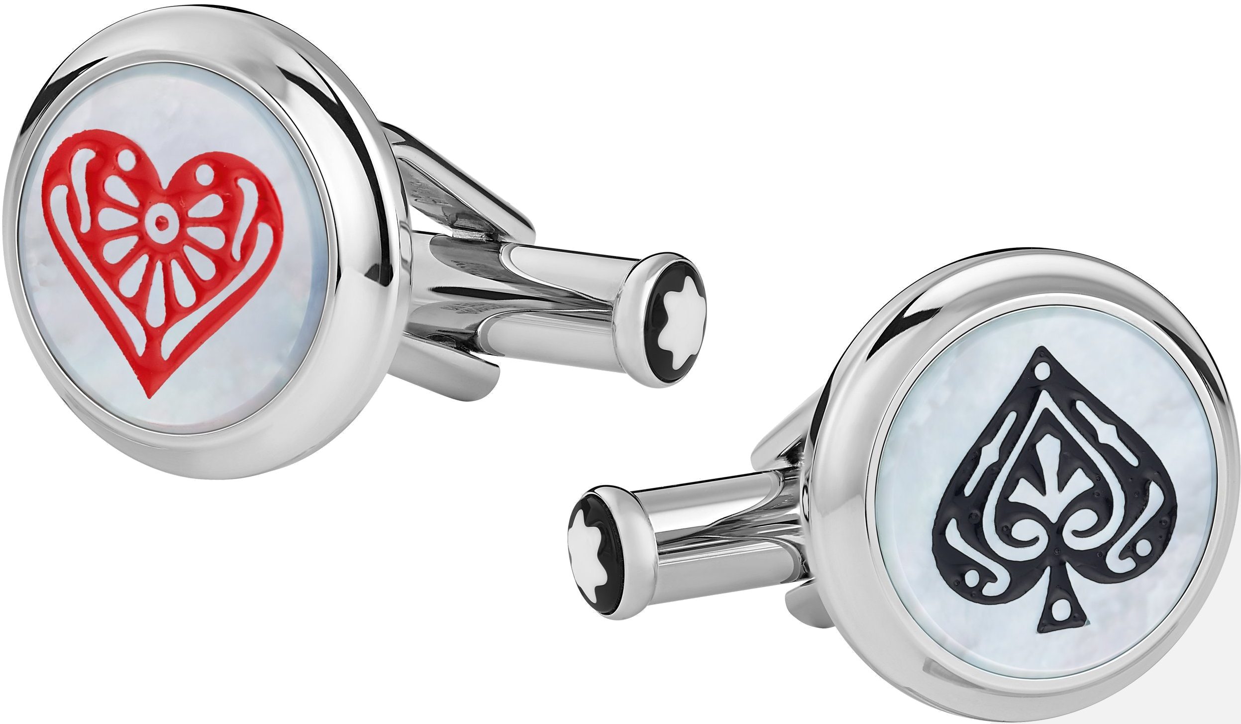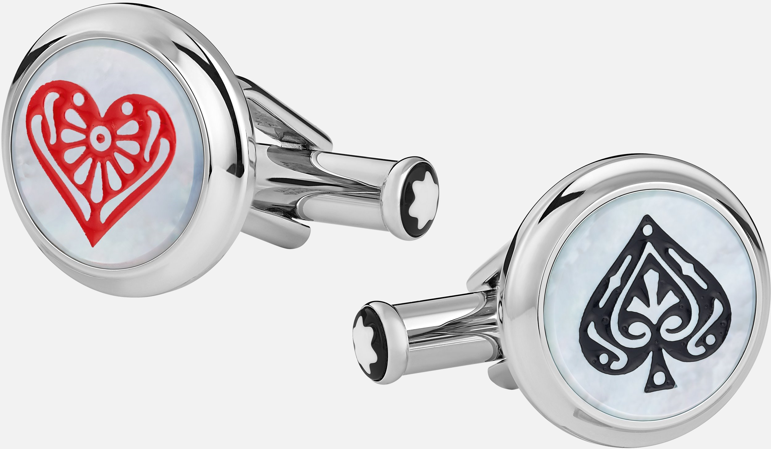Manžetové knoflíčky Montblanc Meisterstück MB128386 jsou poctou knize Cesta kolem světa za 80 dní. Tento kousek je vyroben z nerezové oceli s perleťovou vložkou a je vyražen symboly pikového a srdcového esa, které čerpají inspiraci z jednoho z klíčových prvků románu: hracích karet. Lze do páru s koženými náramky MB12834460MB12834660.