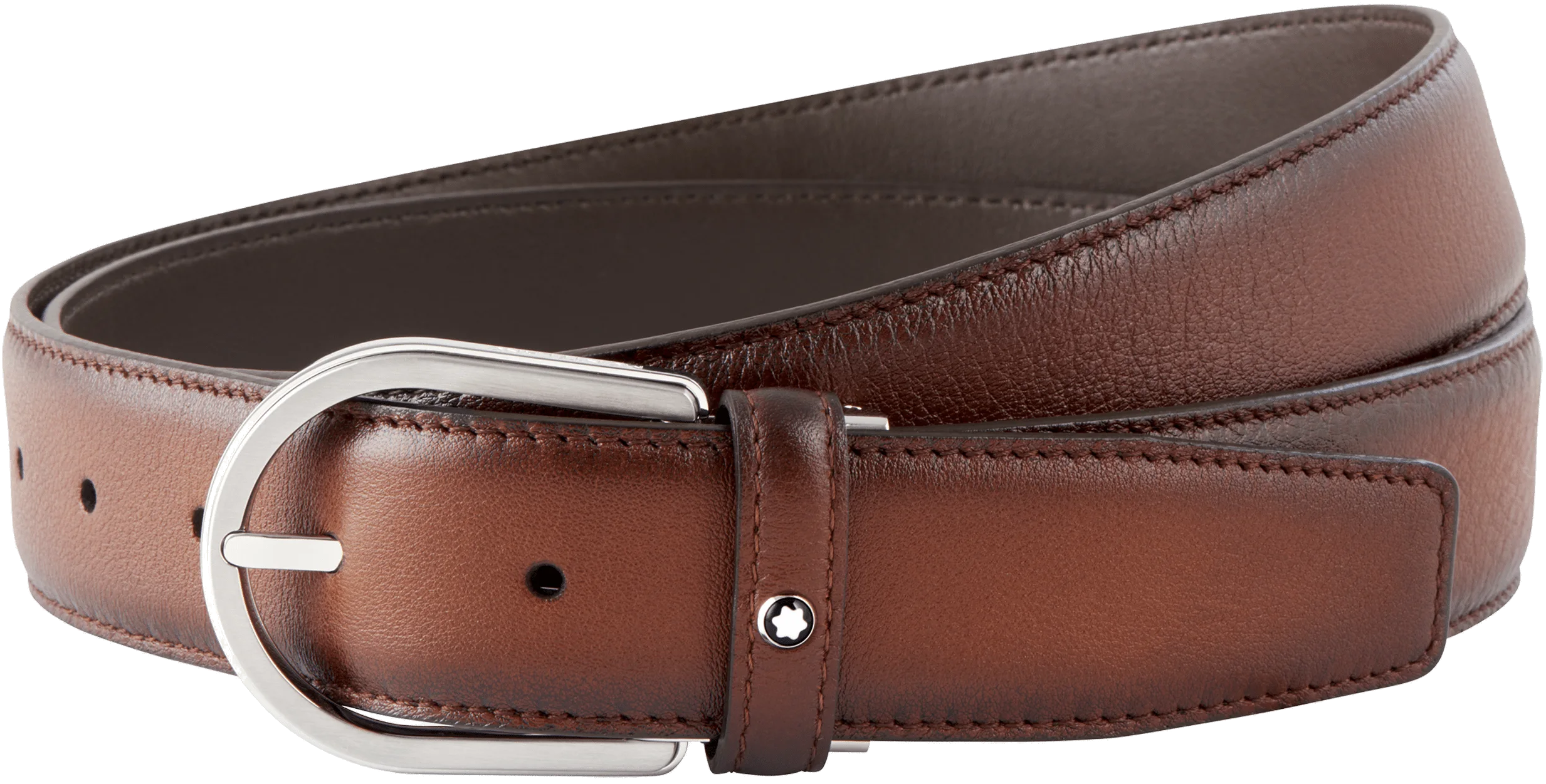 Lesklá a matná spona ve tvaru podkovy z nerezové oceli. Nastavitelný hnědý pásek z hladké kůže MB118413 3,5 cm x 120 cm s patinou ručně malované kůže s jemnou barevnou gradací.