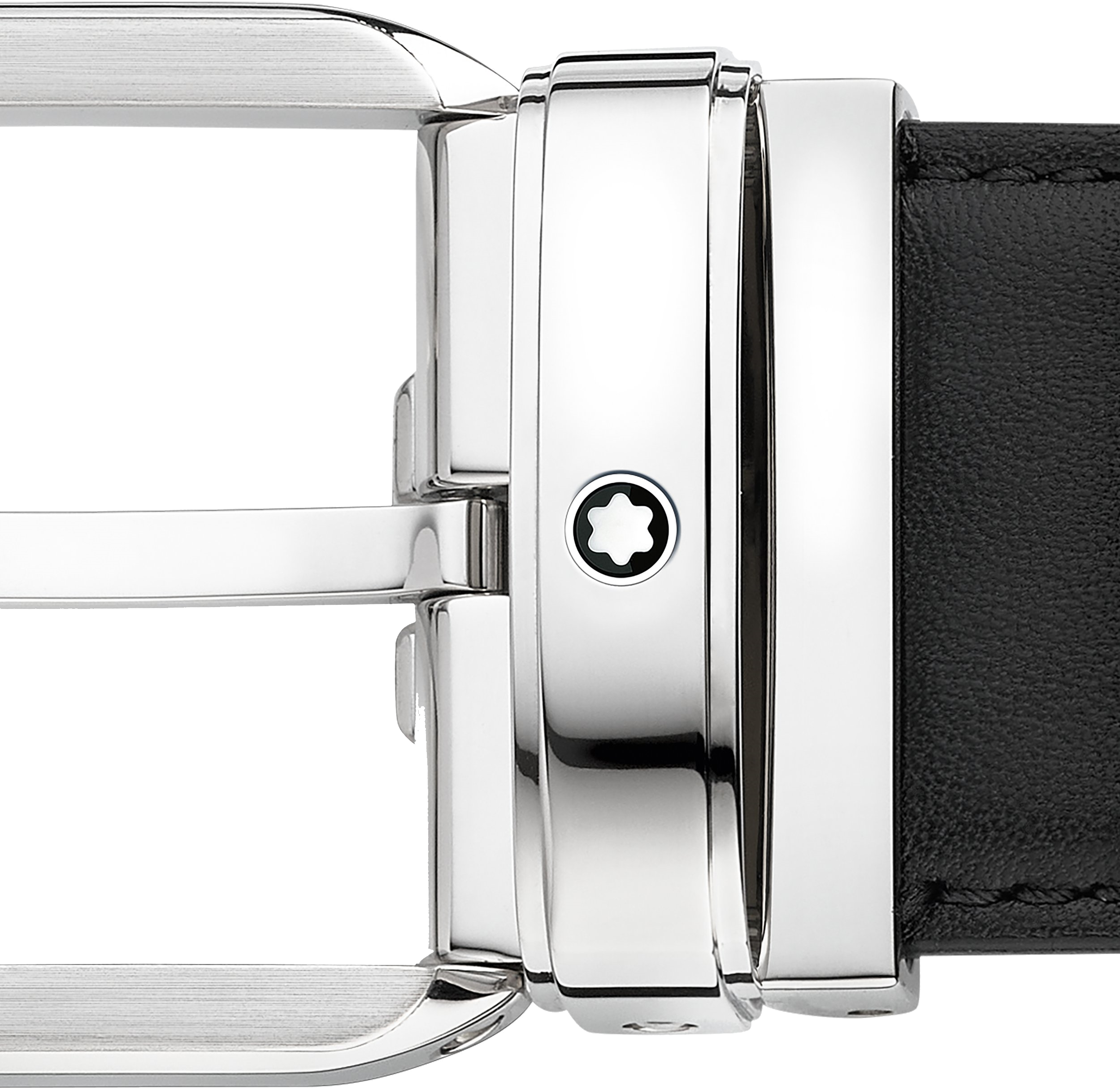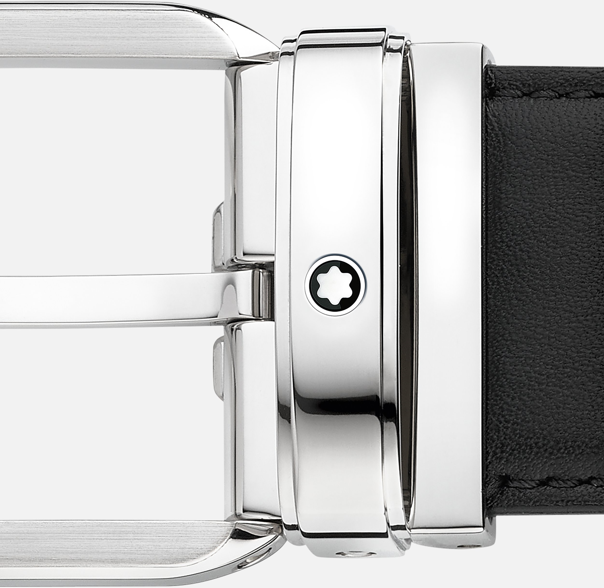 Obdélníková spona z nerezové oceli. Samonastavitelný, 3,5 cm x 120 cm, pásek MB129455 z černé hladké kůže. Tento opasek se hodí jak k obchodním jednáním, tak k modernímu vzhledu.