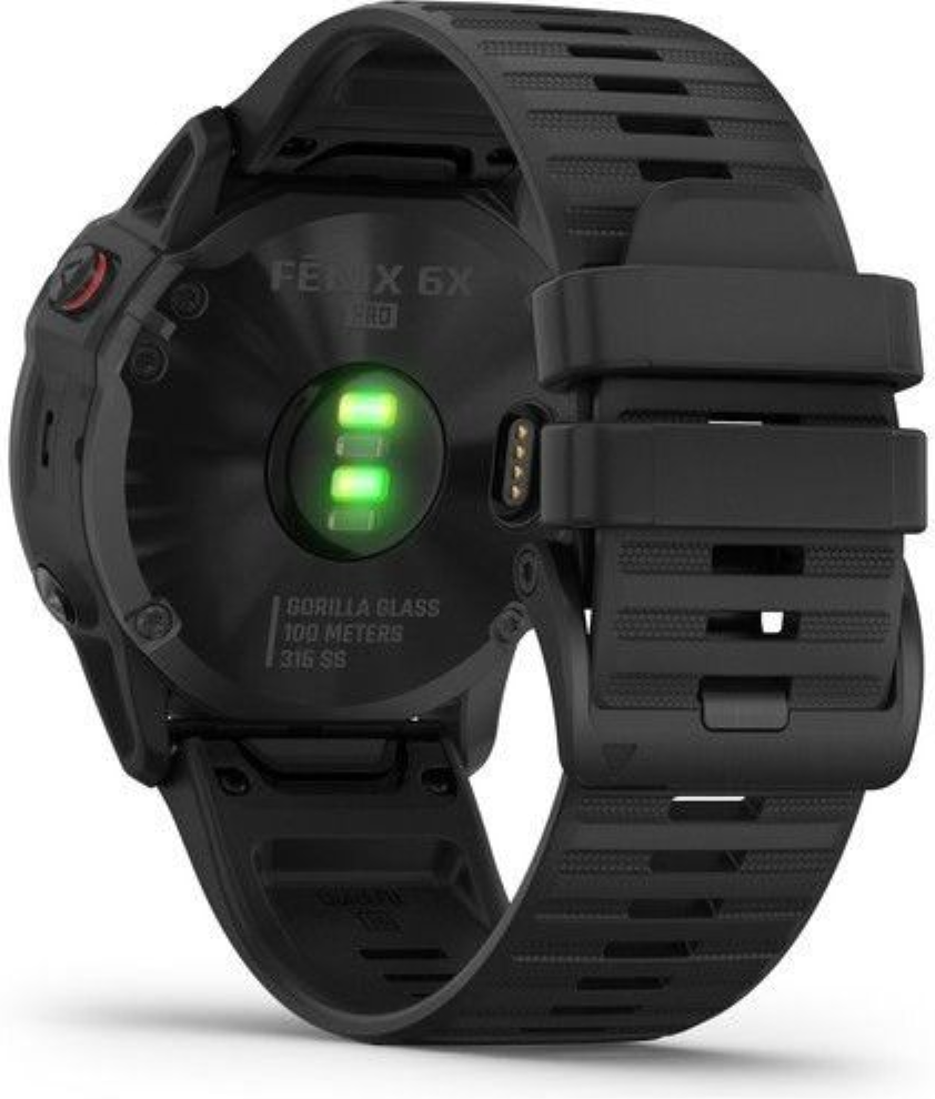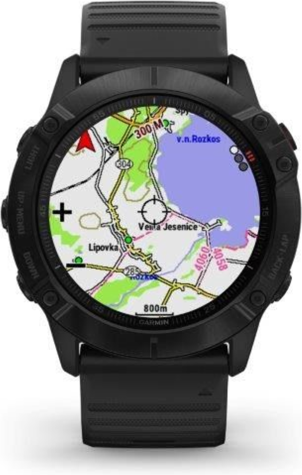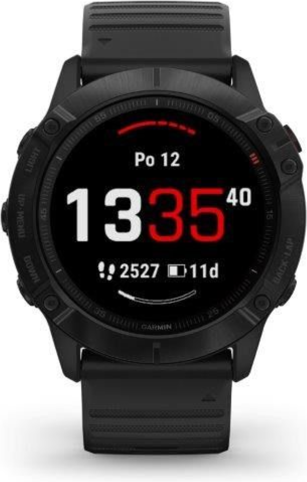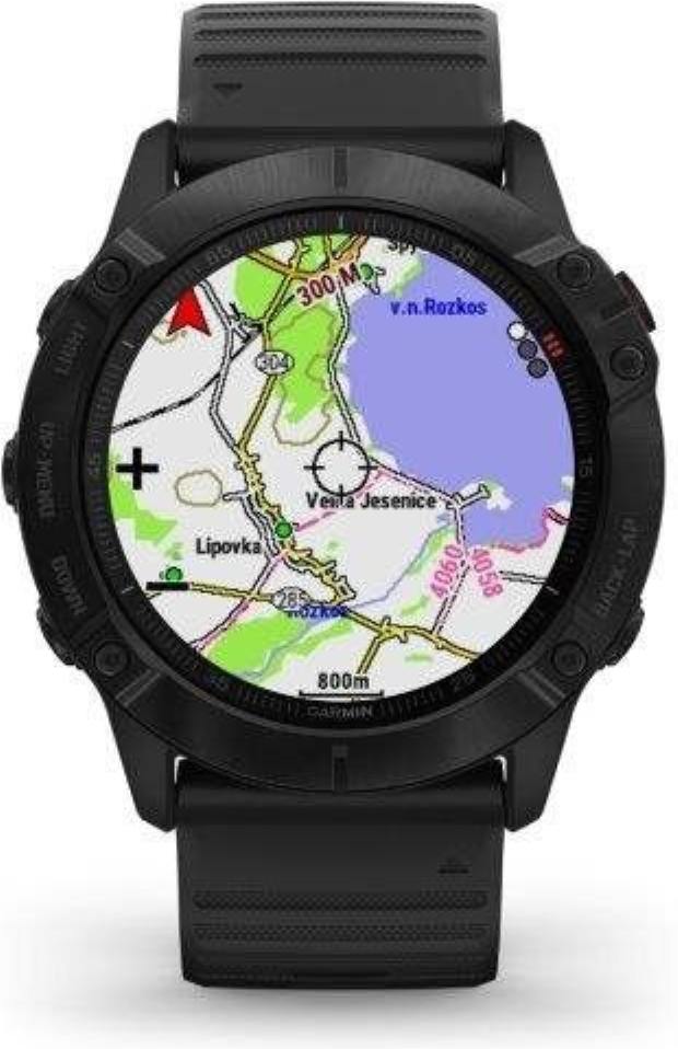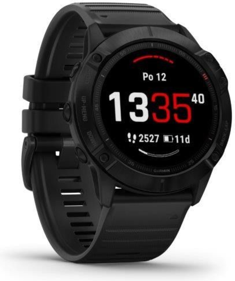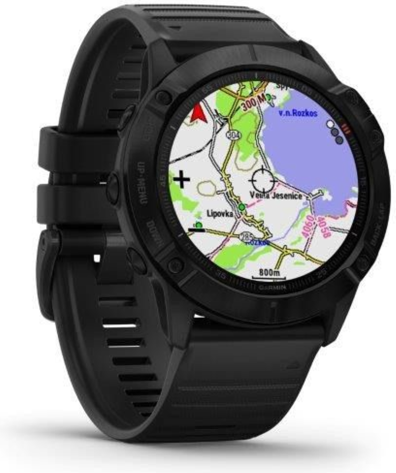 Garmin fenix6X Glass, Black/Black Band (MAP/Music) je model s největší velikostí těla (Fénix6X) a displeje. Průměr displeje je 1,4“ (oproti předchozí generaci Fénix5X Plus došlo o zvětšení plochy displeje o 36%). Hodinky jsou chráněné tvrzeným sklíčkem Gorilla Glass 3. Černá luneta je vyrobena z ušlechtilé oceli. Hodinky mají černý, měkký silikonový řemínek vhodný jak na sport, tak i na běžné nošení. Hodinky mají v paměti předinstalované mapy s možností automatické navigace, jsou vybavené WiFi konektivitou a nabízejí přehrávání hudby z vlastní paměti (32GB), do které je možné nahrát jak vlastní hudební soubory, tak i seznamy skladeb ze streamovacích hudebních služeb, jako je Spotify nebo Deezer. Vestavěný LiIon akumulátor nabízí extrémně dlouhou výdrž hodinek na 1 nabití.
