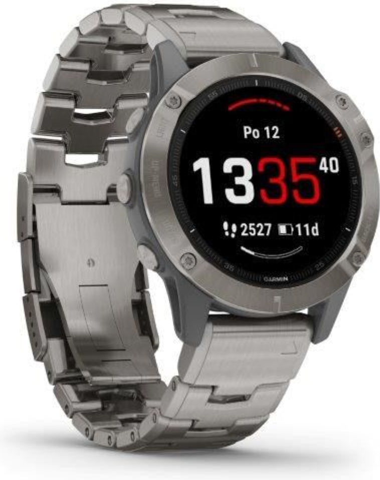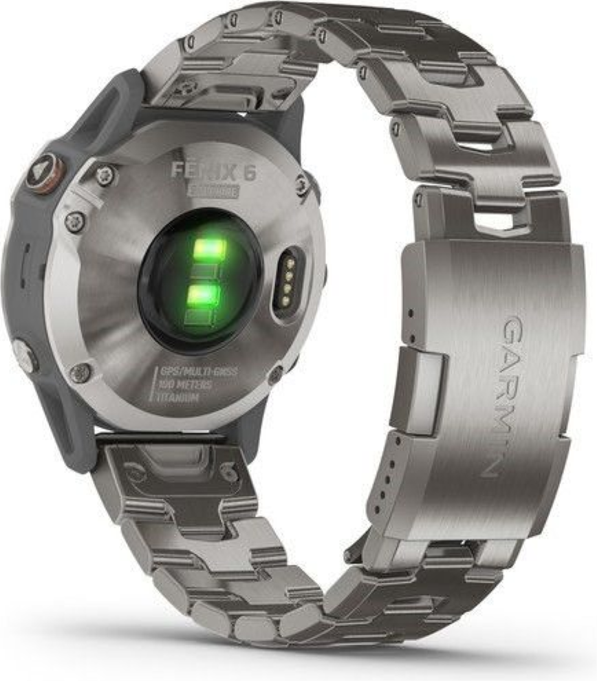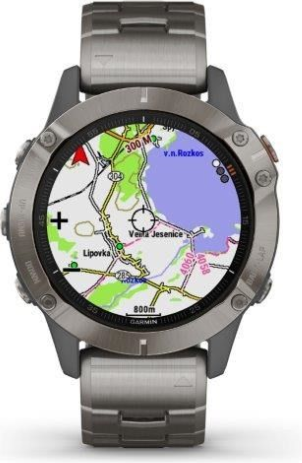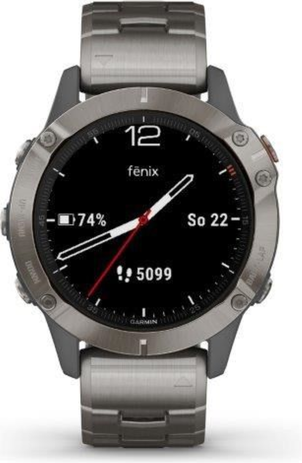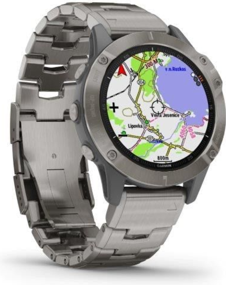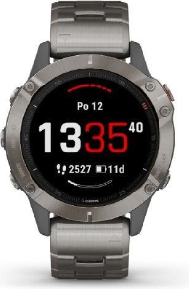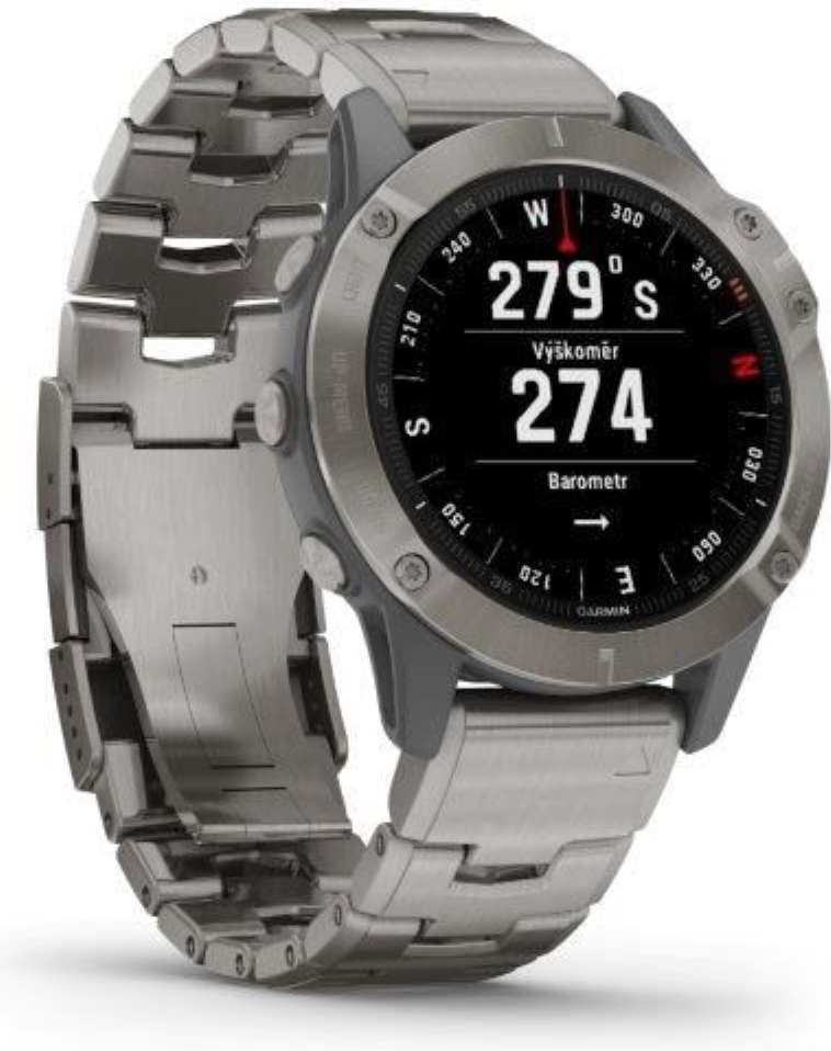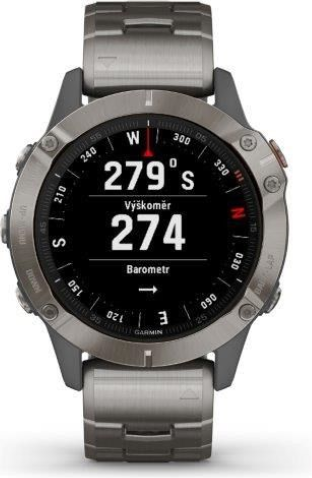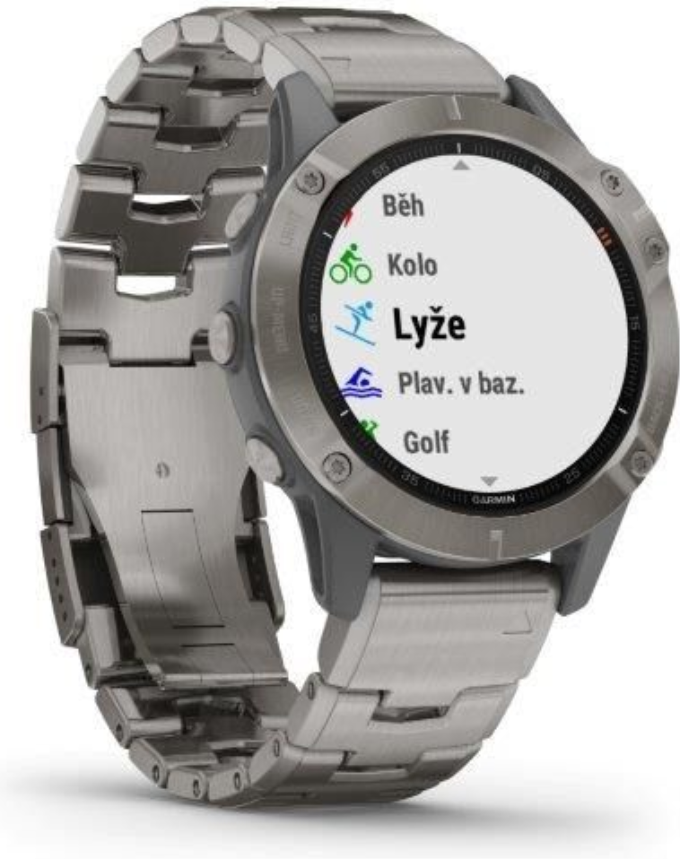 Garmin fenix6 Sapphire, Titanium/Titanium Band (MAP/Music) je model se střední velikostí těla (Fénix6) a displeje. Průměr displeje je 1,3“ (oproti předchozí generaci Fénix5 Plus došlo ke zvětšení plochy displeje o 18%). Hodinky jsou chráněné odolným safírovým sklíčkem. Stříbrně šedá luneta je vyrobena z lehkého titanu. Hodinky mají černý, měkký silikonový řemínek vhodný jak na sport, tak i na běžné nošení, plus navíc celokovový titanový řemínek v barvě poudra hodinek. Hodinky mají v paměti předinstalované mapy s možností automatické navigace, jsou vybavené WiFi konektivitou a nabízejí přehrávání hudby z vlastní paměti (32GB), do které je možné nahrát jak vlastní hudební soubory, tak i seznamy skladeb ze streamovacích hudebních služeb, jako je Spotify nebo Deezer. Vestavěný LiIon akumulátor nabízí extrémně dlouhou výdrž hodinek na 1 nabití: