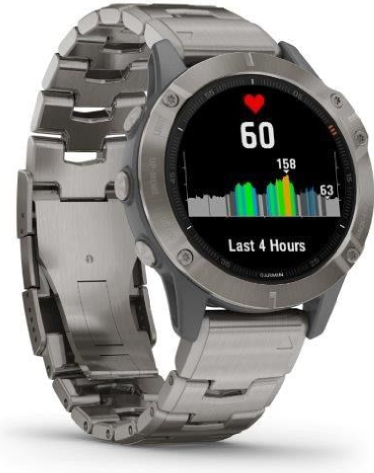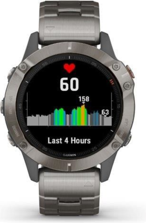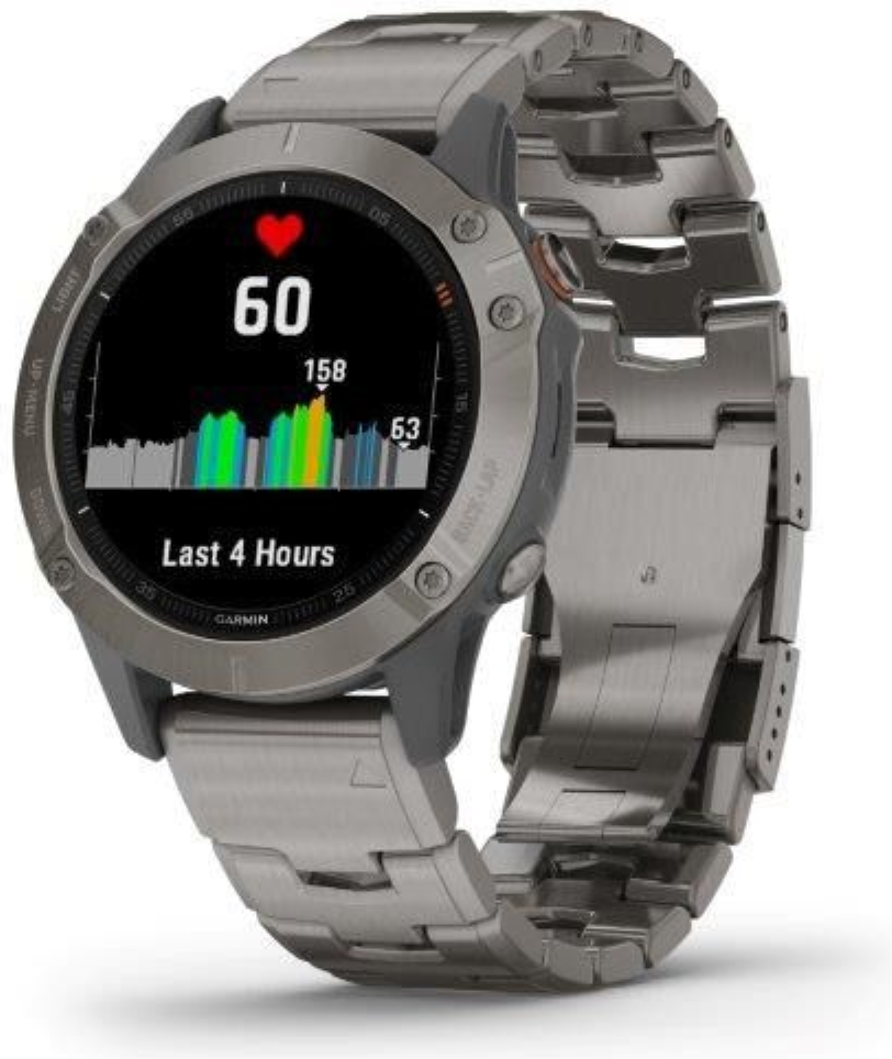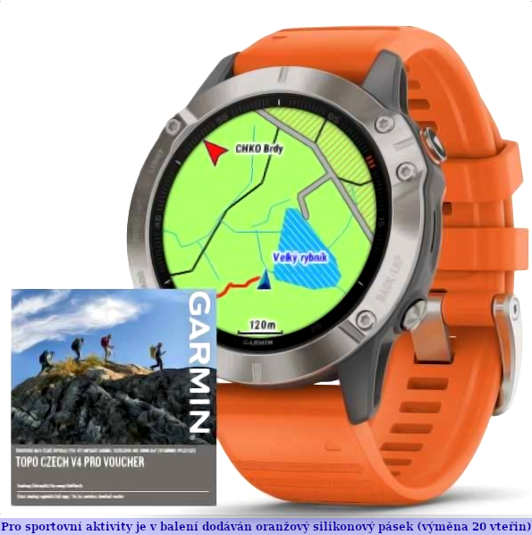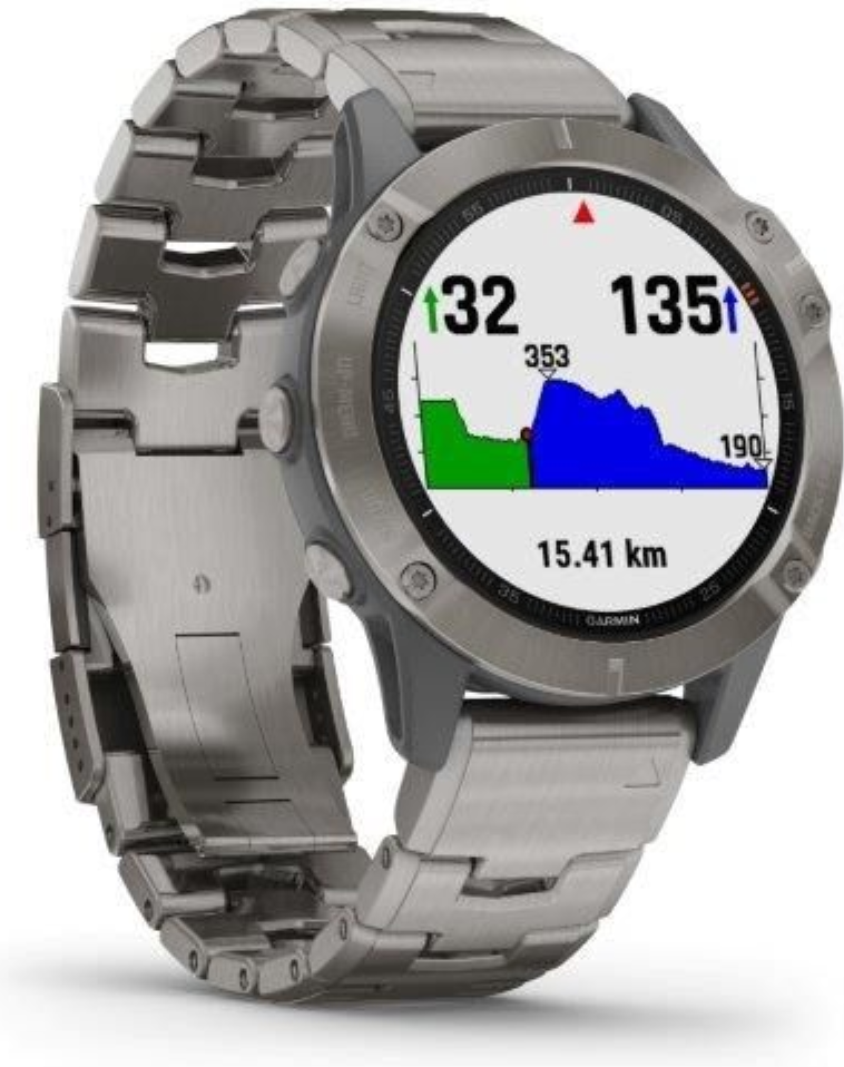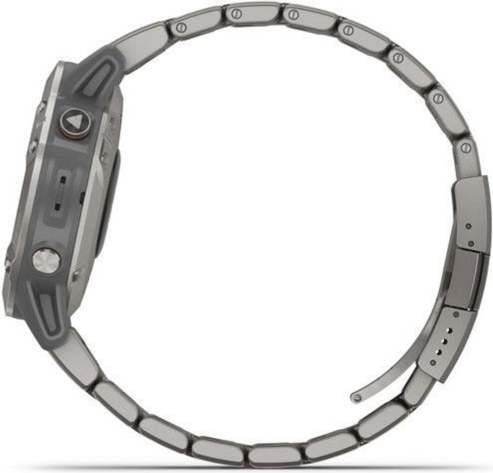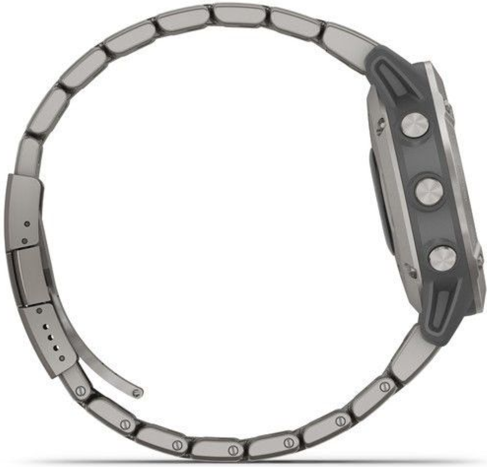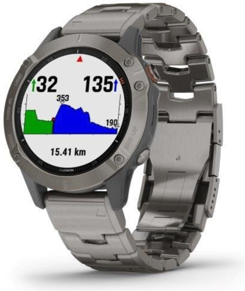 Garmin fenix6 Sapphire, Titanium/Titanium Band (MAP/Music) je model se střední velikostí těla (Fénix6) a displeje. Průměr displeje je 1,3“ (oproti předchozí generaci Fénix5 Plus došlo ke zvětšení plochy displeje o 18%). Hodinky jsou chráněné odolným safírovým sklíčkem. Stříbrně šedá luneta je vyrobena z lehkého titanu. Hodinky mají černý, měkký silikonový řemínek vhodný jak na sport, tak i na běžné nošení, plus navíc celokovový titanový řemínek v barvě poudra hodinek. Hodinky mají v paměti předinstalované mapy s možností automatické navigace, jsou vybavené WiFi konektivitou a nabízejí přehrávání hudby z vlastní paměti (32GB), do které je možné nahrát jak vlastní hudební soubory, tak i seznamy skladeb ze streamovacích hudebních služeb, jako je Spotify nebo Deezer. Vestavěný LiIon akumulátor nabízí extrémně dlouhou výdrž hodinek na 1 nabití: