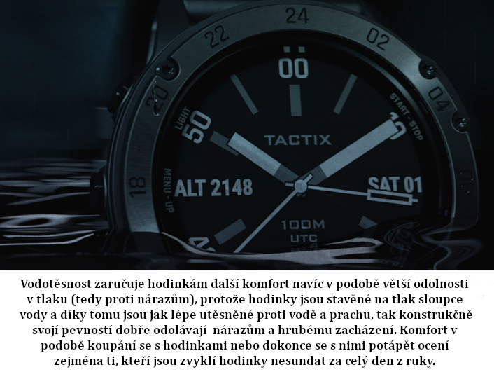 Vodotěsnost?Water resistant - hodinky stakovýmto označením na číselníku nebo víčku hodinek jsou určené na denní nošení a do společnosti. Tyto hodinky jsou utěsněné proti prachu a zvýšené vlhkosti např. dešti apod. S hodinkami s tímto označením není vhodné se koupat ani celkově hodinky ponořovat do vody. Hodinky nejsou vyrobené pro přímý styk s vodou.