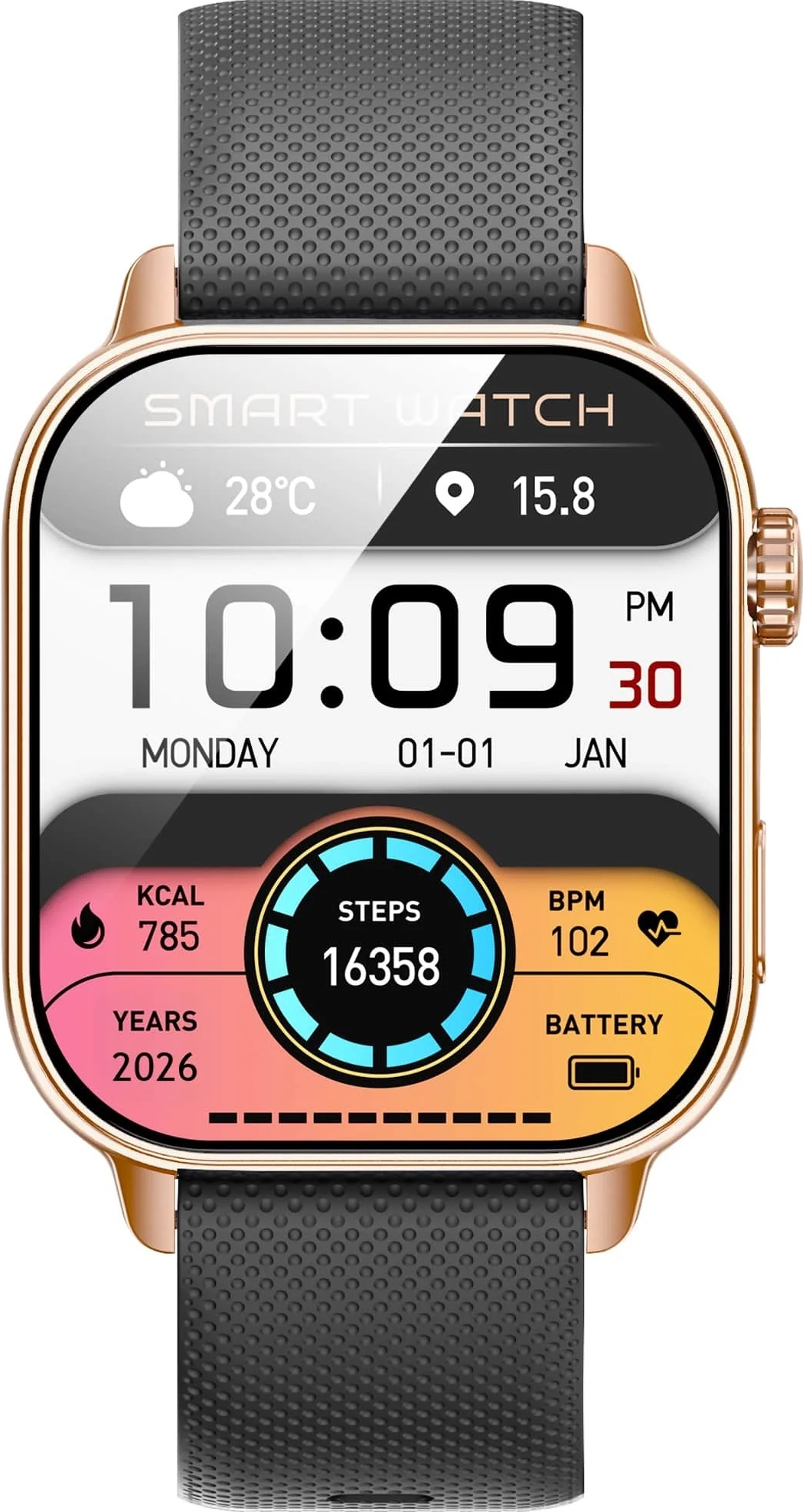 • Funkce a popis: Dotykový AMOLED displej – vysoké rozlišení 390 × 450 px, velikost displeje cca 1,85″. Kompatibilita s mobilními zařízeními (Android i iOS) – můžete hodinky propojit se svým telefonem. Notifikace a hovory – příchozí hovory, oznámení z telefonu.  Hlasový asistent (AI Voice Assist) – umožňuje ovládat hodinky hlasem. Správa hudby, počasí, ovládání fotoaparátu telefonu nebo nalezení telefonu pomocí hodinek.  Sledování aktivity a tréninkových režimů – kroky, spálené kalorie, běh, skákání, cyklistika. Monitorování zdravotních údajů – tepová frekvence, krevní tlak, hladina kyslíku v krvi (SpO₂) a sledování spánku.  Výdrž baterie – rychlé magnetické nabíjení (2-3 hodiny), pohotovostní doba až cca 30 dní, aktivní provozní doba až cca 6 dní.