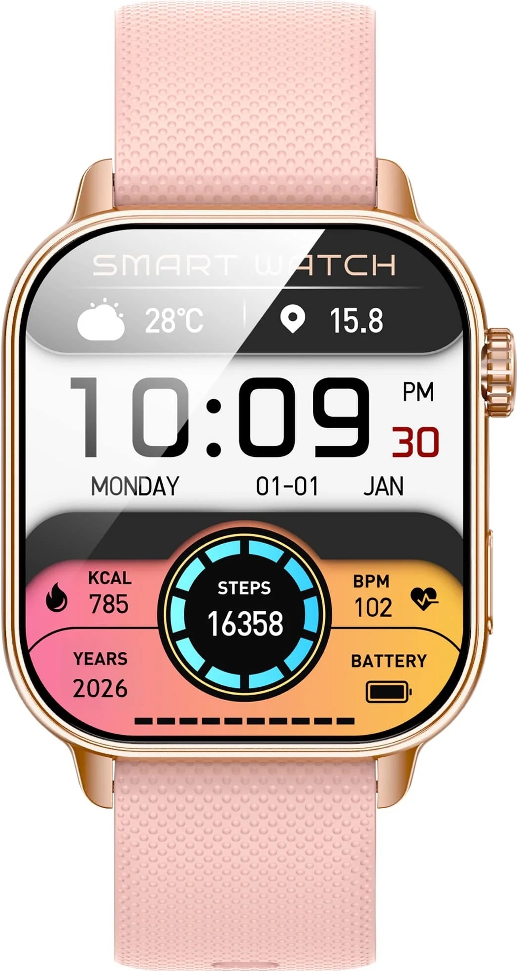 • Funkce a popis: Dotykový AMOLED displej – vysoké rozlišení 390 × 450 px, velikost displeje cca 1,85″. Kompatibilita s mobilními zařízeními (Android i iOS) – můžete hodinky propojit se svým telefonem. Notifikace a hovory – příchozí hovory, oznámení z telefonu.  Hlasový asistent (AI Voice Assist) – umožňuje ovládat hodinky hlasem. Správa hudby, počasí, ovládání fotoaparátu telefonu nebo nalezení telefonu pomocí hodinek.  Sledování aktivity a tréninkových režimů – kroky, spálené kalorie, běh, skákání, cyklistika. Monitorování zdravotních údajů – tepová frekvence, krevní tlak, hladina kyslíku v krvi (SpO₂) a sledování spánku.  Výdrž baterie – rychlé magnetické nabíjení (2-3 hodiny), pohotovostní doba až cca 30 dní, aktivní provozní doba až cca 6 dní.