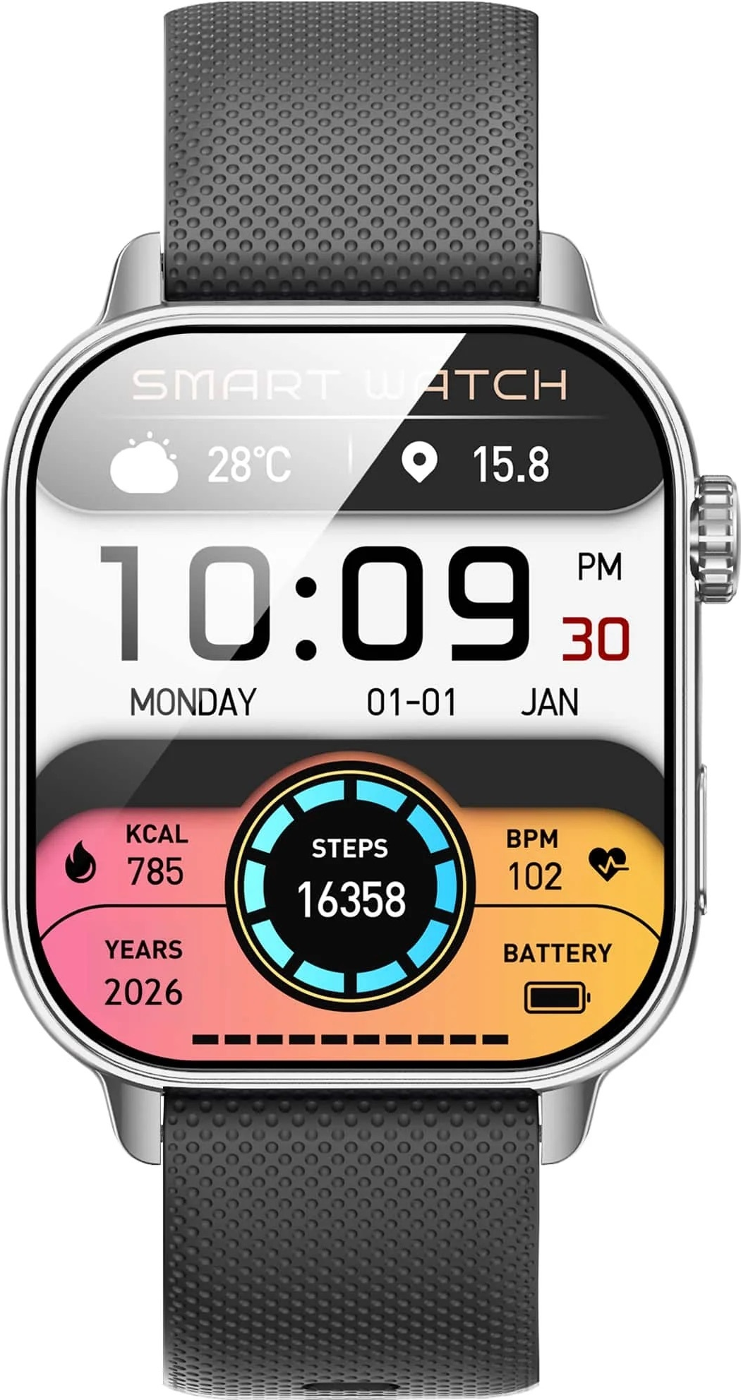 • Funkce a popis: Dotykový AMOLED displej – vysoké rozlišení 390 × 450 px, velikost displeje cca 1,85″. Kompatibilita s mobilními zařízeními (Android i iOS) – můžete hodinky propojit se svým telefonem. Notifikace a hovory – příchozí hovory, oznámení z telefonu.  Hlasový asistent (AI Voice Assist) – umožňuje ovládat hodinky hlasem. Správa hudby, počasí, ovládání fotoaparátu telefonu nebo nalezení telefonu pomocí hodinek.  Sledování aktivity a tréninkových režimů – kroky, spálené kalorie, běh, skákání, cyklistika. Monitorování zdravotních údajů – tepová frekvence, krevní tlak, hladina kyslíku v krvi (SpO₂) a sledování spánku.  Výdrž baterie – rychlé magnetické nabíjení (2-3 hodiny), pohotovostní doba až cca 30 dní, aktivní provozní doba až cca 6 dní.