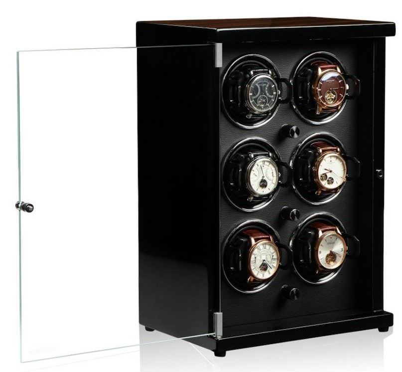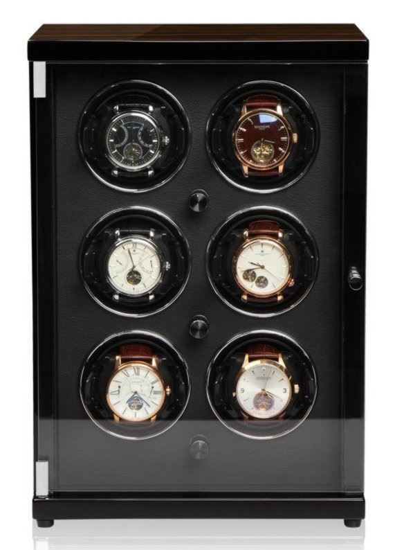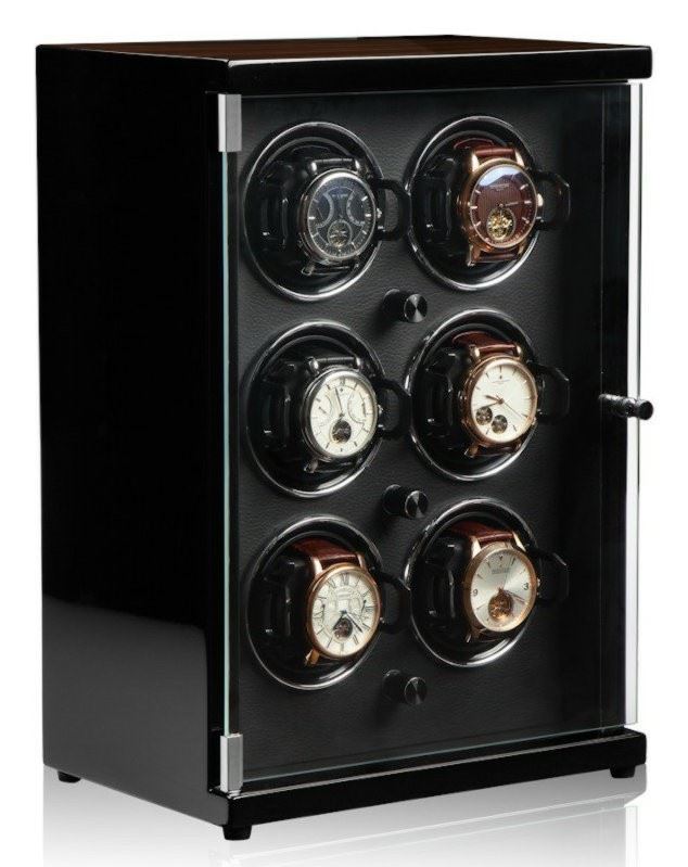 • Funkce a popis:Velmi tichý natahovač na hodinky Sei 160-51 MCS-BK (watch winder) značky KRAFF, natahovač k natažení šesti kusů mechanických hodinek s lesklým lakovaným mahagónovo - černým povrchem