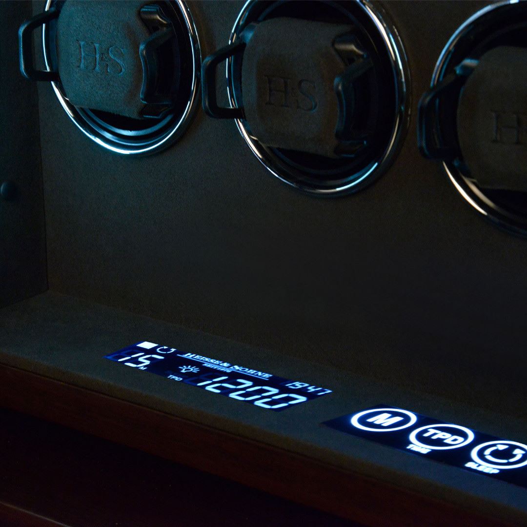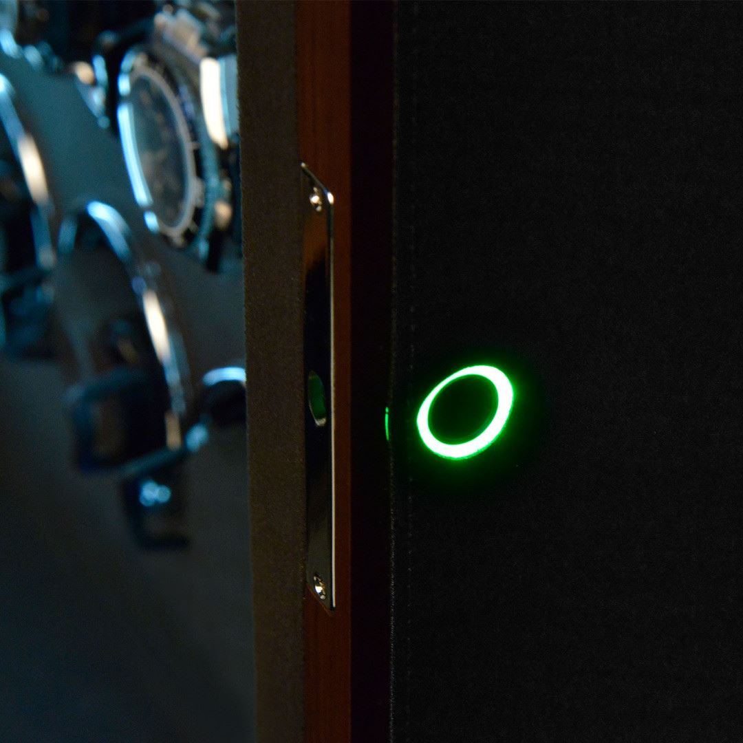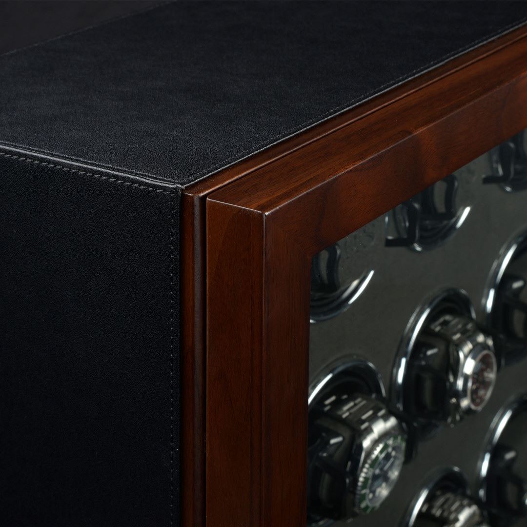 • Funkce a popis:Dřevěný natahovač na 16 hodinek, hnědý potažen syntetickou černou kůží, LCD podsvícený display pro příjemné ovládání, materiál interiéru je velur, každý rotor lze samostatně naprogramovat, otáčení lze nastavit po směru ručiček, proti směru a také oboustranně, volba počtu denních otáček od 450 až 1500, vnitřní LED osvětlení které lze přepínat i zcela vypnout, mód "sleep phase", natahovač je uzamykatelný - bezpečnostní zámek otisku prstu, adaptér je součástí balení, váha 17,5kg, rozměr 43,5x61x21cm