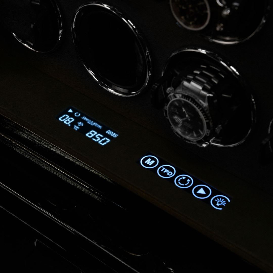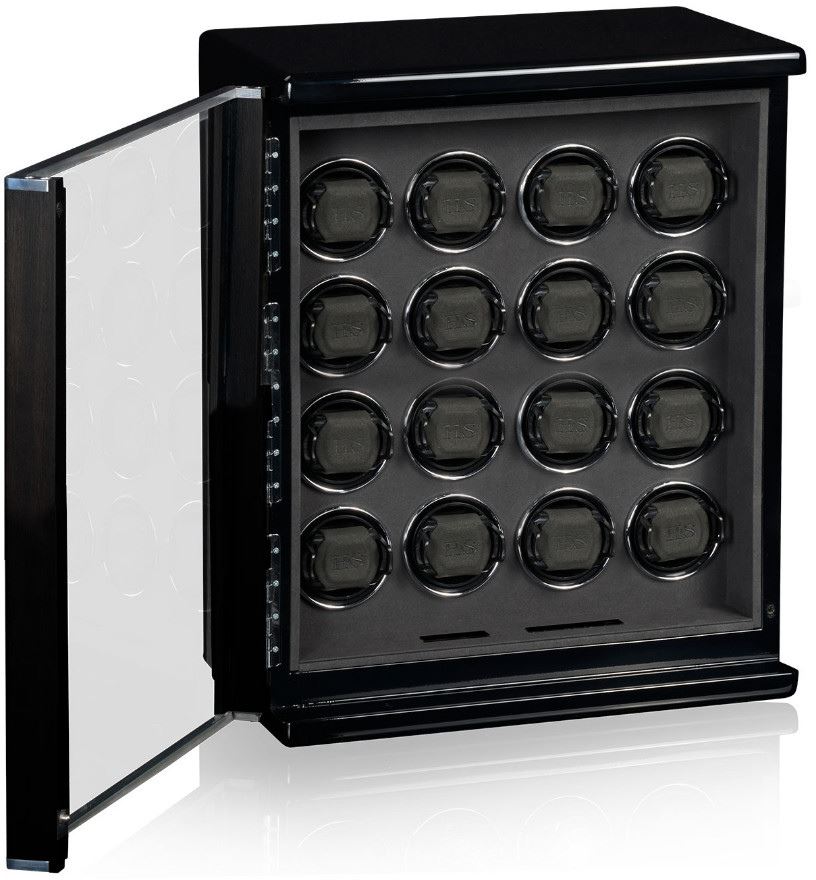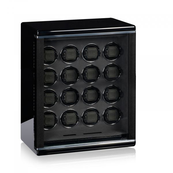 • Funkce a popis:Dřevěný natahovač v černém piano lesku na 16 hodinek, LCD display pro pohodlné ovládání, materiál interiéru je velur, každý rotor lze samostatně naprogramovat, otáčení lze nastavit po směru ručiček, proti směru a také oboustranně, volba počtu denních otáček od 450 až 1500, vnitřní LED osvětlení které lze přepínat i zcela vypnout, mód "sleep phase", adaptér je součástí balení, váha 15kg