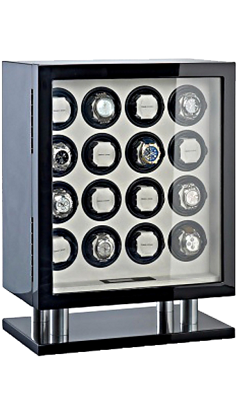 • Funkce a popis:Dřevěný natahovač v černém piano lesku na 16 hodinek, LCD ovládání, interiér je ve světlé kůži, každý rotor lze samostatně naprogramovat, otáčení lze nastavit po směru ručiček, proti směru a také oboustranně, volba počtu denních otáček od 650, 900, 1350 a 1800, vnitřní LED osvětlení, které lze vypnout, natahovač je uzamykatelný, adaptér je součástí balení, váha 15.5kg