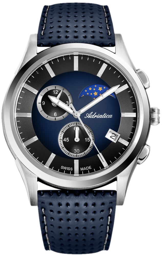 • Funkce a popis:Čas, datum, fáze měsíce, chronograf = stopky, svítící ručky a indexy