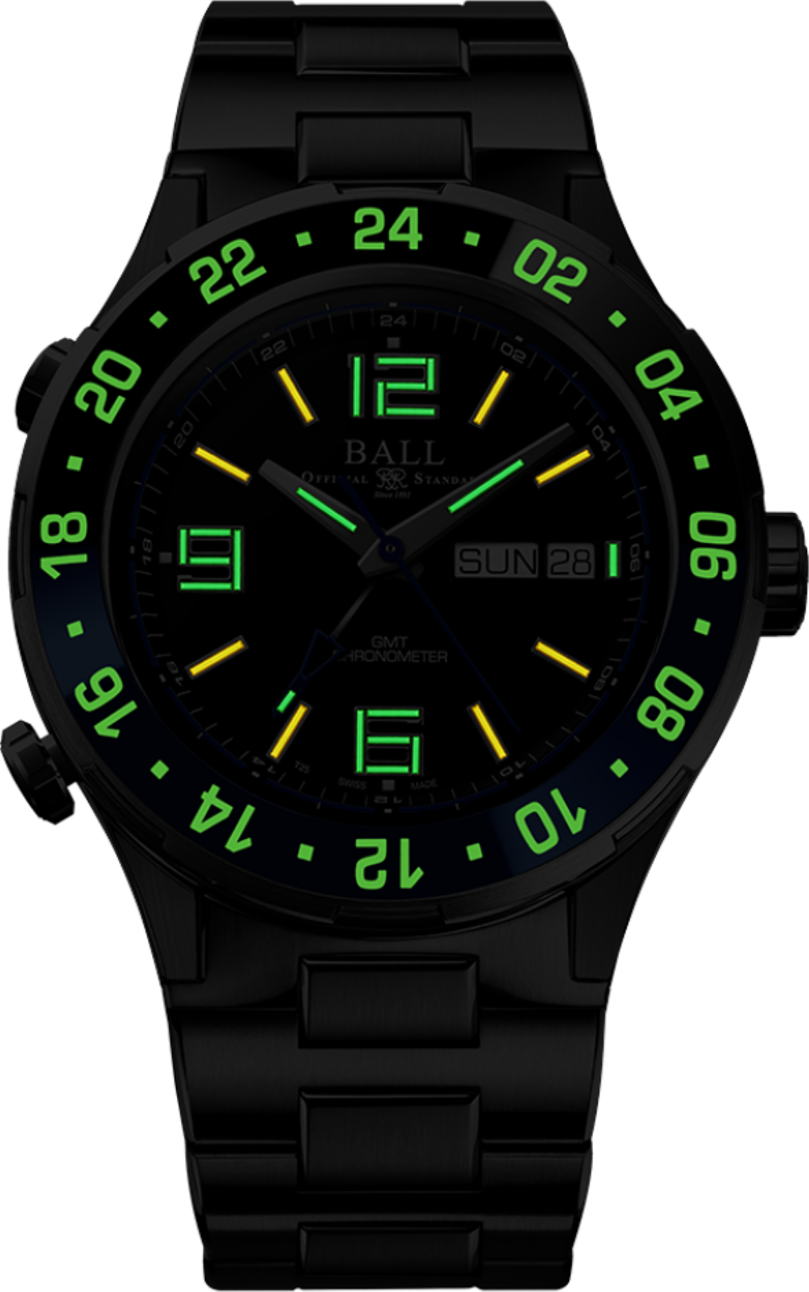 • Funkce a popis:Čas, datum, den v týdnu, GMT - indikace tří časových pásem s patentovaným mechanismem rychlého nastavení, jednosměrně otočná keramická luminisceční luneta (číslice/indexy na lunetě v noci svítí - SuperLuminova), strojek Ball calibre RR1103-C (základ swiss ETA 2836-2) - rezerva chodu 38 hodin, automatický nátah (pohybem ruky) + ruční nátah (hodinky lze natáhnout i mechanicky - ručně), 28.800 polokmitů setrvačky za hodinu, COSC certifikát přesnosti strojku - přesnost chodu 0 - 3 vteřiny/den, 25 kamenových uložení, šroubovací vodotěsná korunka, odolnost vůči magnetickému poli 4 800 A/m (takto označené hodinky už se označují jako antimagnetické, odolávají běžnému magnetickému poli), odolnost nárazu 5 000 Gs = možný pád hodinek až z jednoho metru bez poškození strojku (hodinky jsou tímto zároveň odolné podobným nárazům identické síly), zadní víčko pouzdra hodinek je prosklené pro náhled na strojek. V číselníku jsou indexy a ručičky plněny mikroampulkami se svítícím plynem, který má schopnost svítit nonstop 25 let. Díky tomu uvidíte kdykoliv a kdekoliv ve tmě, jaký je správný čas
