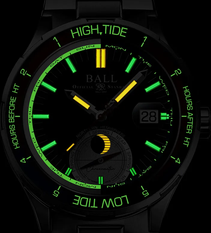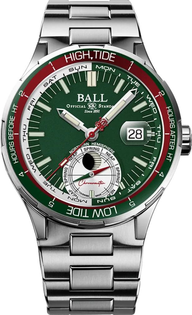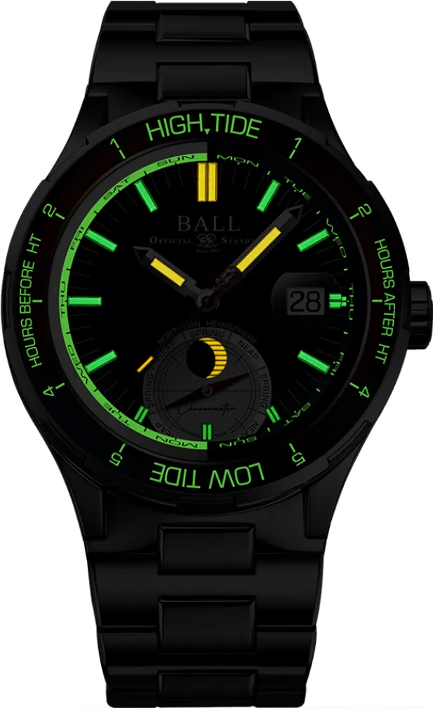• Funkce a popis:Čas, datum, indikace přílivu a odlivu po dobu dvou týdnů, indikace přílivu a odlivu na jaře, zvětšovací lupa nad datumem pro lepší čitelnost data, šroubovací korunka, strojek Swiss Ball calibre RR1803-C (základ swiss Eta 2824) - rezerva chodu 38 hodin, automatický nátah (hodinky se natahují pohybem ruky) + ruční nátah (hodinky lze natáhnout/dotáhnout dle potřeby i ručně korunkou), 28.800 polokmitů setrvačky za hodinu, COSC certifikát přesnosti strojku - přesnost chodu 0 - 3 vteřiny/den, 25 kamenových uložení, odolnost vůči magnetickému poli 4 800 A/m (takto označené hodinky už se označují jako antimagnetické, odolávají běžnému magnetickému poli - mezi strojkem a pouzdrem je druhé vnitřní pouzdro Mumetal, které poskytuje stínění a odolnost magnetickému poli), odolnost nárazu 5 000 Gs = možný pád hodinek až z jednoho metru bez poškození strojku (hodinky jsou tímto zároveň odolné podobným nárazům identické síly), v číselníku jsou indexy a ručičky plněny mikroampulkami se svítícím plynem (tritium) - díky tomu uvidíte kdykoliv a kdekoliv ve tmě, jaký je správný čas (svítivost vydrží nonstop 25 let, poté Ball vymění nový číselník a ručičky na dalších 25 let svítivosti), zadní průhledné víčko pouzdra ze safírového skla pro náhled na krásu automatického strojku