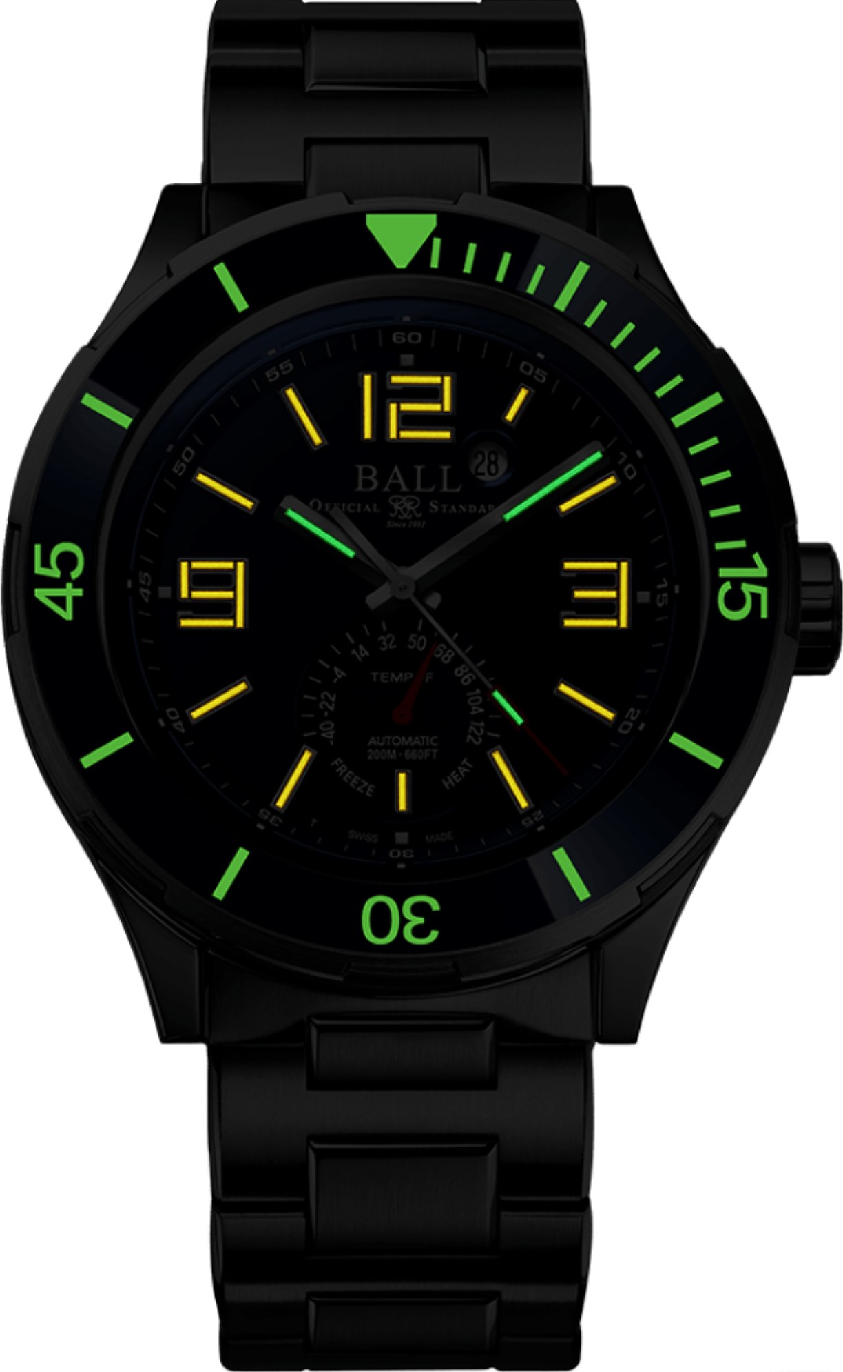 • Funkce a popis:Čas, datum, šroubovací korunka, strojek Swiss Ball calibre RR1601 (základ swiss Eta 2824) - rezerva chodu 38 hodin, automatický nátah (hodinky se natahují pohybem ruky) + ruční nátah (hodinky lze natáhnout/dotáhnout dle potřeby i ručně korunkou), 28.800 polokmitů setrvačky za hodinu - přesnost chodu 2 - 4 vteřiny/den, 25 kamenových uložení, speciální hodinářský olej = vydrží -45 ° C / -49 ° F, patentovaná mechanická termometrická indikace (rozsah: od -31°F do 113°F), odolnost vůči magnetickému poli 4 800 A/m (takto označené hodinky už se označují jako antimagnetické, odolávají běžnému magnetickému poli - mezi strojkem a pouzdrem je druhé vnitřní pouzdro Mumetal, které poskytuje stínění a odolnost magnetickému poli),odolnost nárazu 5 000 Gs = možný pád hodinek až z jednoho metru bez poškození strojku (hodinky jsou tímto zároveň odolné podobným nárazům identické síly), v číselníku jsou indexy a ručičky plněny mikroampulkami se svítícím plynem (tritium) - díky tomu uvidíte kdykoliv a kdekoliv ve tmě, jaký je správný čas (svítivost vydrží nonstop 25 let, poté Ball vymění nový číselník a ručičky na dalších 25 let svítivosti)