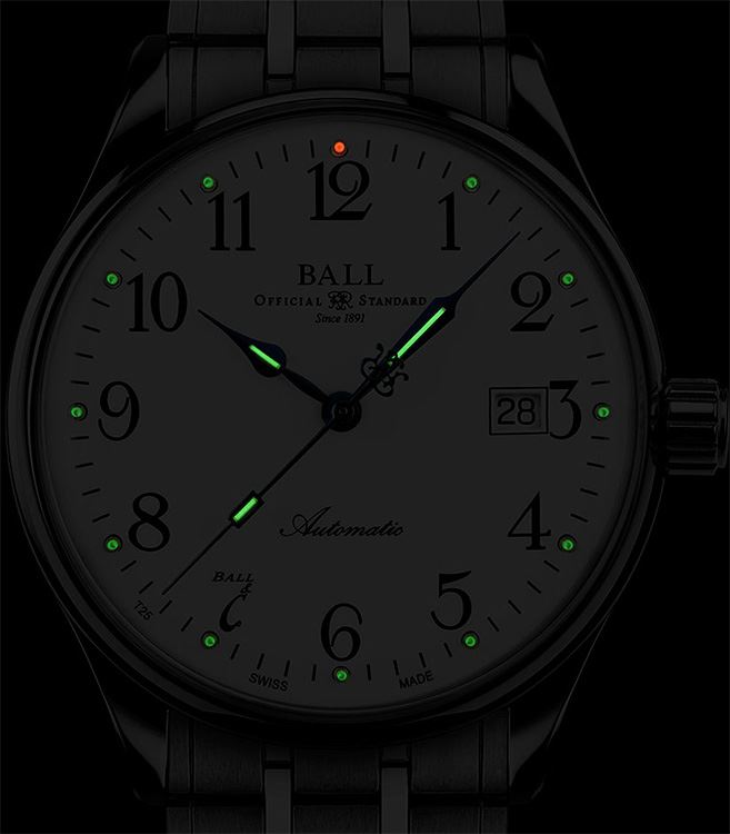 • Funkce a popis:Čas, datum, šroubovací korunka, průhledné zadní víčko pro náhled na strojek, strojek Ball calibre RR1101 (základ swiss Eta 2892) - rezerva chodu 42 hodin (+ ruční nátah), 28.800 polokmitů setrvačky za hodinu - přesnost chodu 3 - 4 vteřiny denně, 25 kamenových uložení,  odolnost nárazu 5 000Gs = možný pád hodinek až z jednoho metru bez poškození strojku (hodinky jsou tímto zároveň odolné nárazům identické síly). V číselníku jsou indexy a ručičky plněny svítícím plynem, který má schopnost svítit nonstop 24 hodin. Díky tomu uvidíte kdykoliv a kdekoliv ve tmě, jaký je správný čas.