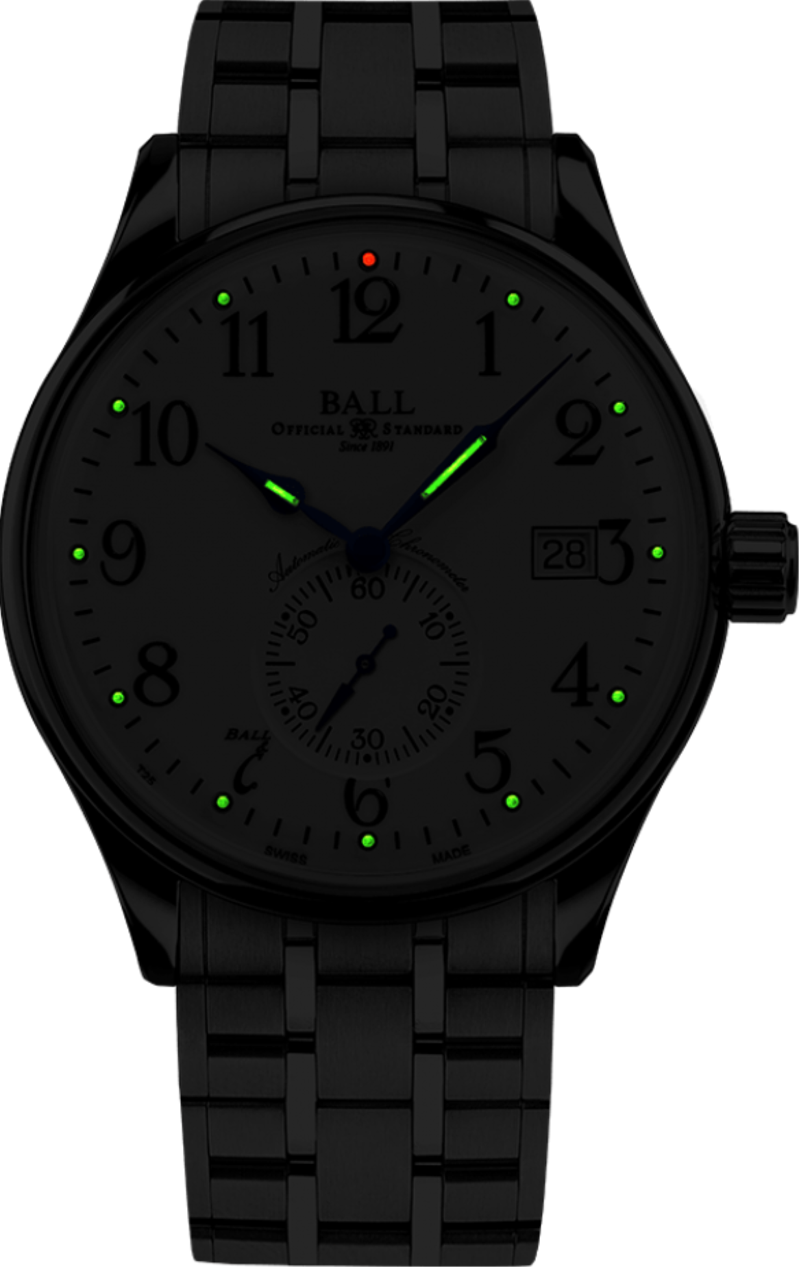 • Funkce a popis:Čas, datum, mimostředná vteřinová ručka, strojek Ball calibre RR1105-C (základ swiss Eta 2892) - rezerva chodu 42 hodin, automatický nátah (pohybem ruky) + ruční nátah (hodinky lze natáhnout i mechanicky - ručně), 28.800 polokmitů setrvačky za hodinu, COSC certifikát přesnosti strojku - přesnost chodu 0 - 3 vteřiny/den, 25 kamenových uložení, šroubovací vodotěsná korunka, odolnost vůči magnetickému poli 4 800 A/m (takto označené hodinky už se označují jako antimagnetické, odolávají běžnému magnetickému poli), odolnost nárazu 5 000 Gs = možný pád hodinek až z jednoho metru bez poškození strojku (hodinky jsou tímto zároveň odolné podobným nárazům identické síly), v číselníku jsou indexy a ručičky plněny mikroampulkami se svítícím plynem (tritium) - díky tomu uvidíte kdykoliv a kdekoliv ve tmě, jaký je správný čas (svítivost vydrží nonstop 25 let, poté Ball vymění nový číselník a ručičky na dalších 25 let svítivosti)