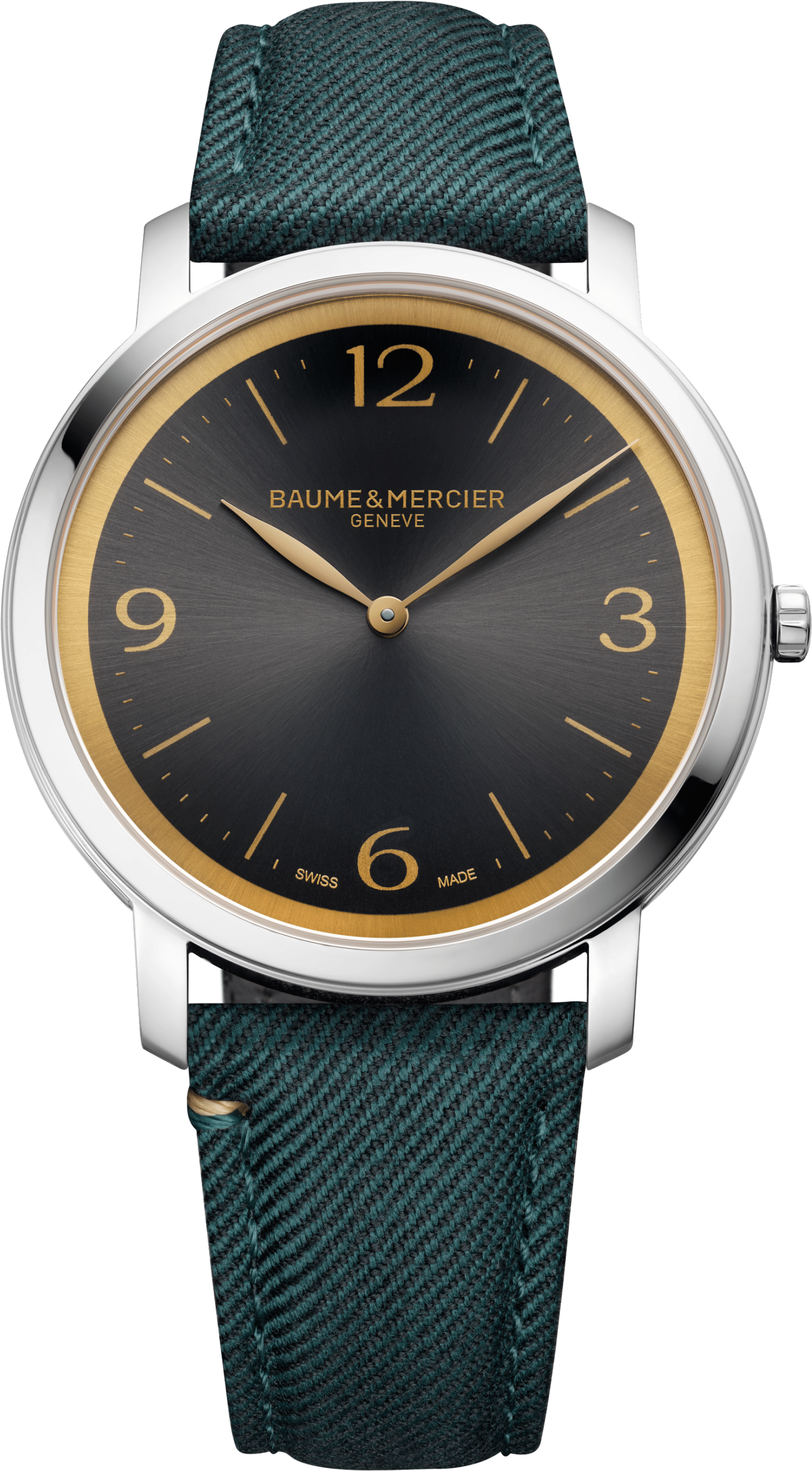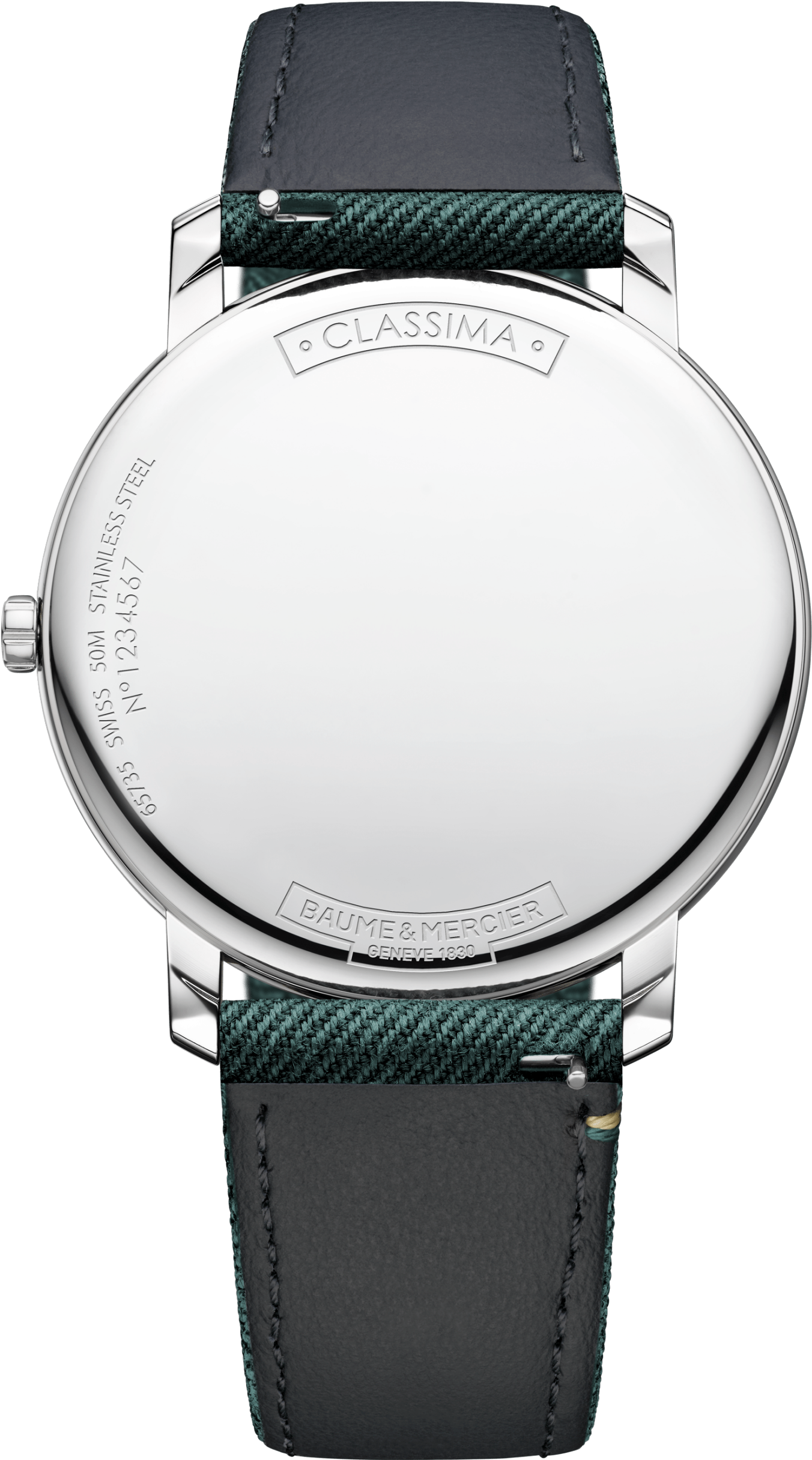 Model M0A10704 je vybaven saténovým ciferníkem v barvě meteor grey sun a je vylepšený o přírubu, arabské číslice, indexy a listové ručky, které jsou všechny pozlacené. Pásky jsou vyrobeny ze zelené látky (Super 120) a černé aligátoří kůže. Tloušťka těchto hodinek je pouhých 5 mm.