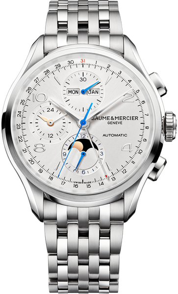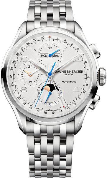 • Funkce a popis:Čas, datum, den v týdnu, fáze měsíce, chronograf = stopky, strojek swiss ETA 7751 (25 kamenů), rezerva chodu 42 hodin, kmity setrvačky 28.800/h = přesnost chodu 3 - 4 vteřiny denně, průhledné zadní víčko pro náhled na strojek. Firma Baume et Mercier Vám vyrobí na zakázku kožený řemínek ke každým hodinkám své produkce, který si vyberete z palety jejich vzorníku (modrý, modrý s bílým prošitím, modrý s modrým prošitím, modrý s béžovým prošitím a takto i další barvy kůže - viz.obrázek ve fotkách hodinek). Baume et Mercier je natolik prestižní firma, že opraví každé hodinky, které vyrobili od počátku svého vzniku, tedy od roku 1830. Baume & Mercier si vyrábí svoje vlastní hodinářské oleje, které vynikají svojí dlouhou životností - díky tomu je prodloužena doba pravidelného celkového servisu(vyčištění a namazání strojku) na 10 let.