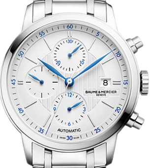 • Funkce a popis:Čas, datum, chronograf = stopky, strojek swiss ETA 7750 (25 kamenů), rezerva chodu 42 hodin, kmity setrvačky 28.800/h = přesnost chodu 3 - 4 vteřiny denně, průhledné zadní víčko pro náhled na strojek. Firma Baume et Mercier Vám vyrobí na zakázku kožený řemínek ke každým hodinkám své produkce, který si vyberete z palety jejich vzorníku (modrý, modrý s bílým prošitím, modrý s modrým prošitím, modrý s béžovým prošitím a takto i další barvy kůže - viz.obrázek ve fotkách hodinek). Baume et Mercier je natolik prestižní firma, že opraví každé hodinky, které vyrobili od počátku svého vzniku, tedy od roku 1830. Baume & Mercier si vyrábí svoje vlastní hodinářské oleje, které vynikají svojí dlouhou životností - díky tomu je prodloužena doba pravidelného celkového servisu(vyčištění a namazání strojku) na 10 let.