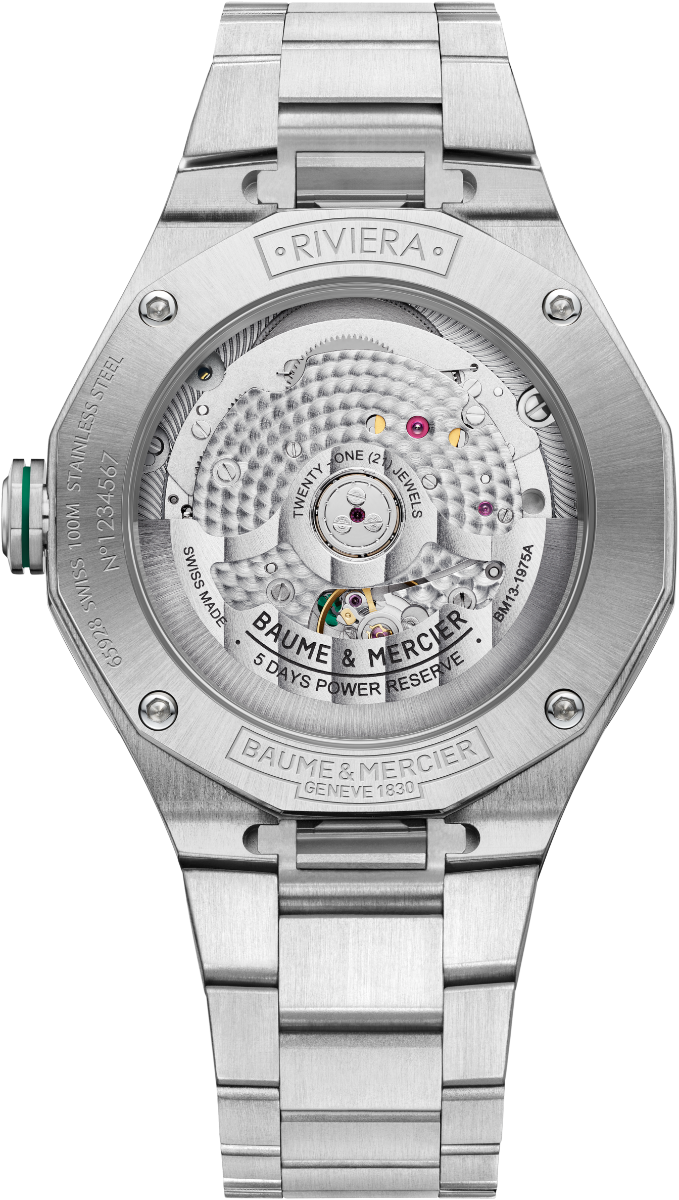 Pánské hodinky Riviera Baumatic M0A10770, poháněná prestižním výrobním kalibrem Baumatic, jsou špičkové švýcarské hodinky pro všechny Vaše cesty. Jejich průhledný kouřově zelený safírový číselník, jejich vyměnitelný kovový náramek a otevřené zadní pouzdro dotvářejí sportovní vzhled těchto švýcarských hodinek. V balení je dodáván kožený pásek z aligátora (na vnitřní straně pogumovaný pro delší výdrž.