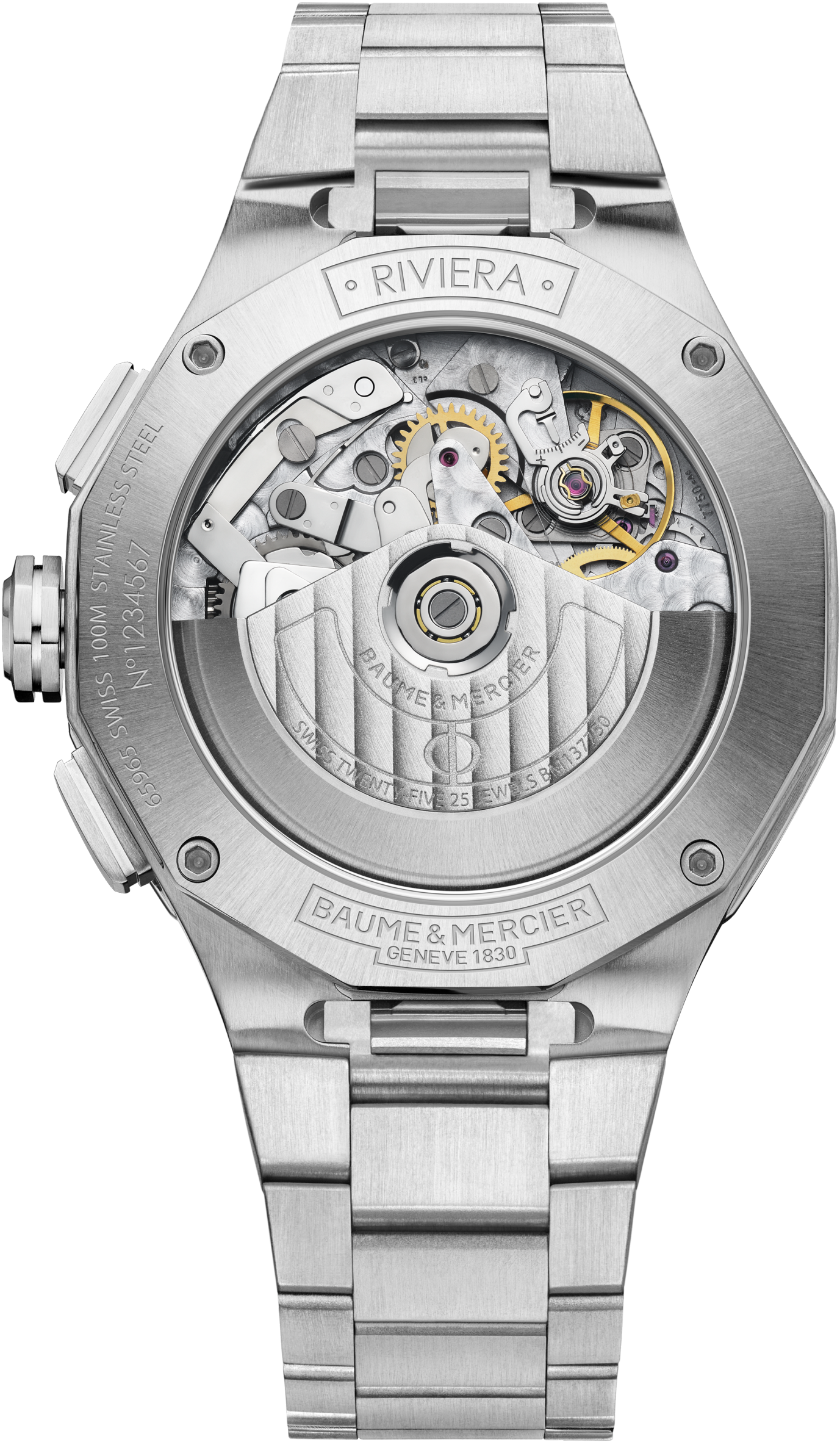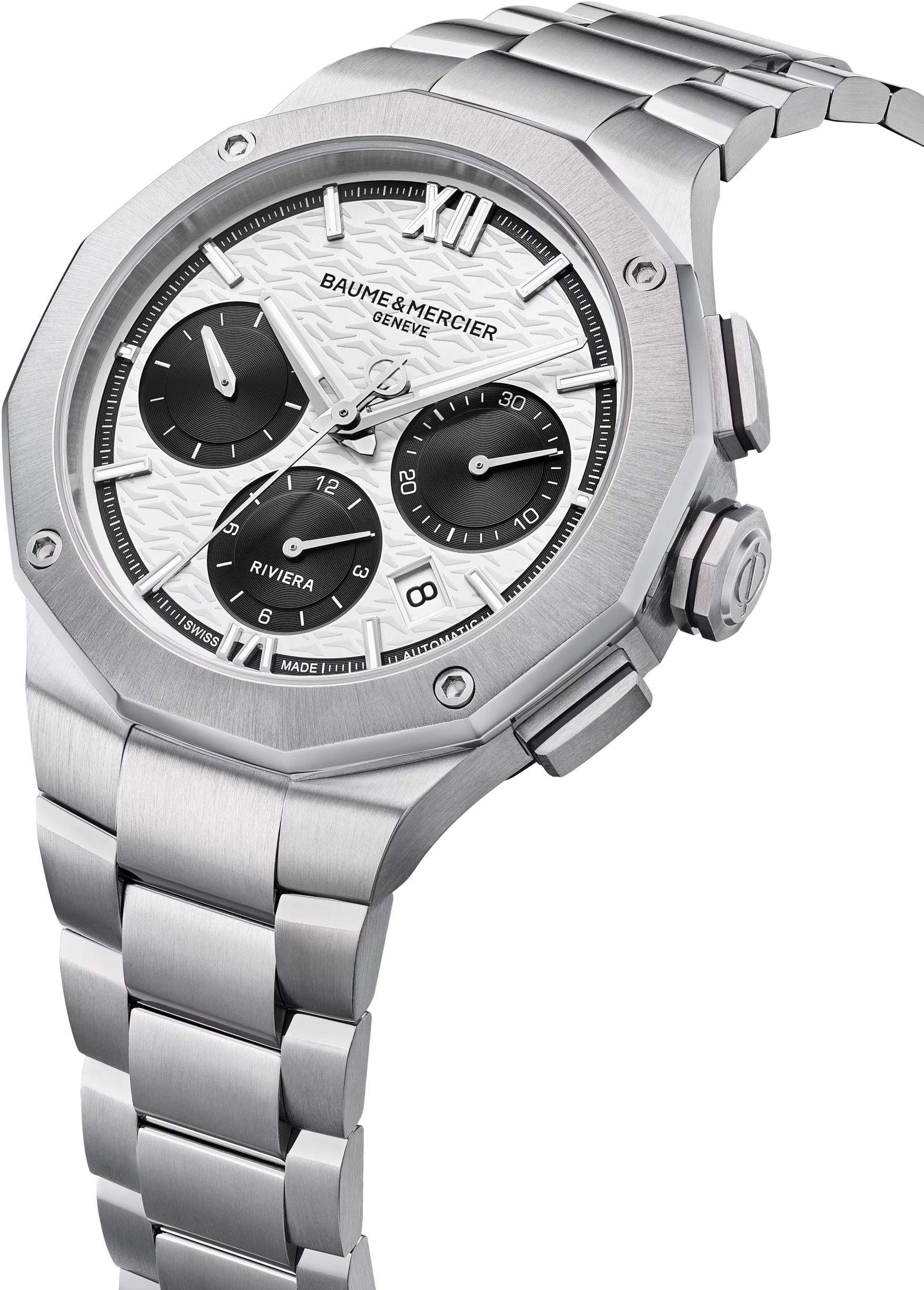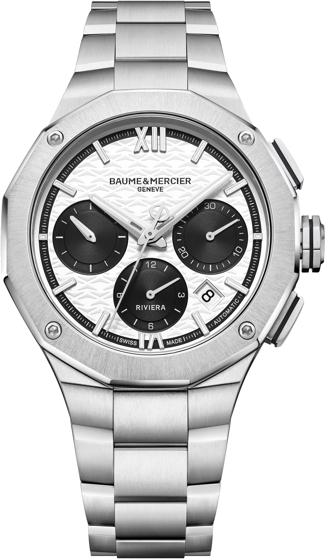 Tyto hodinky Baume & Mercier Riviera jsou vybaveny automatickým švýcarským strojkem Sellita 500 (základ Valjoux 7750) Valjoux a ztělesňují klasický nadčasový design s moderními prvky. Tento model je osazen číselníkem v barevném designu, kterému se říká Panda.