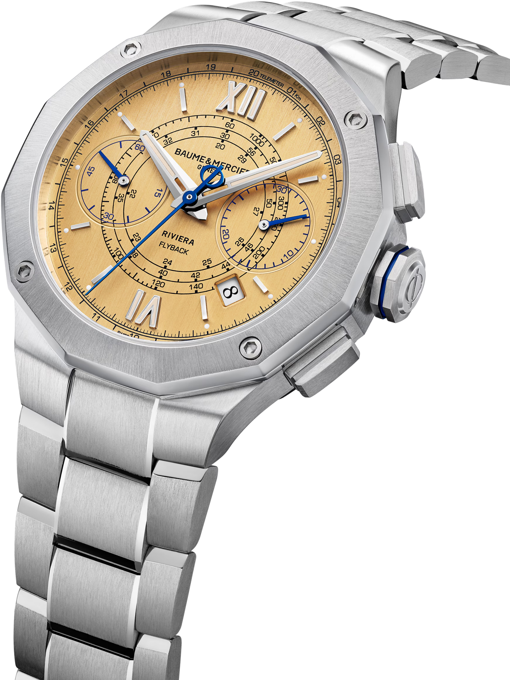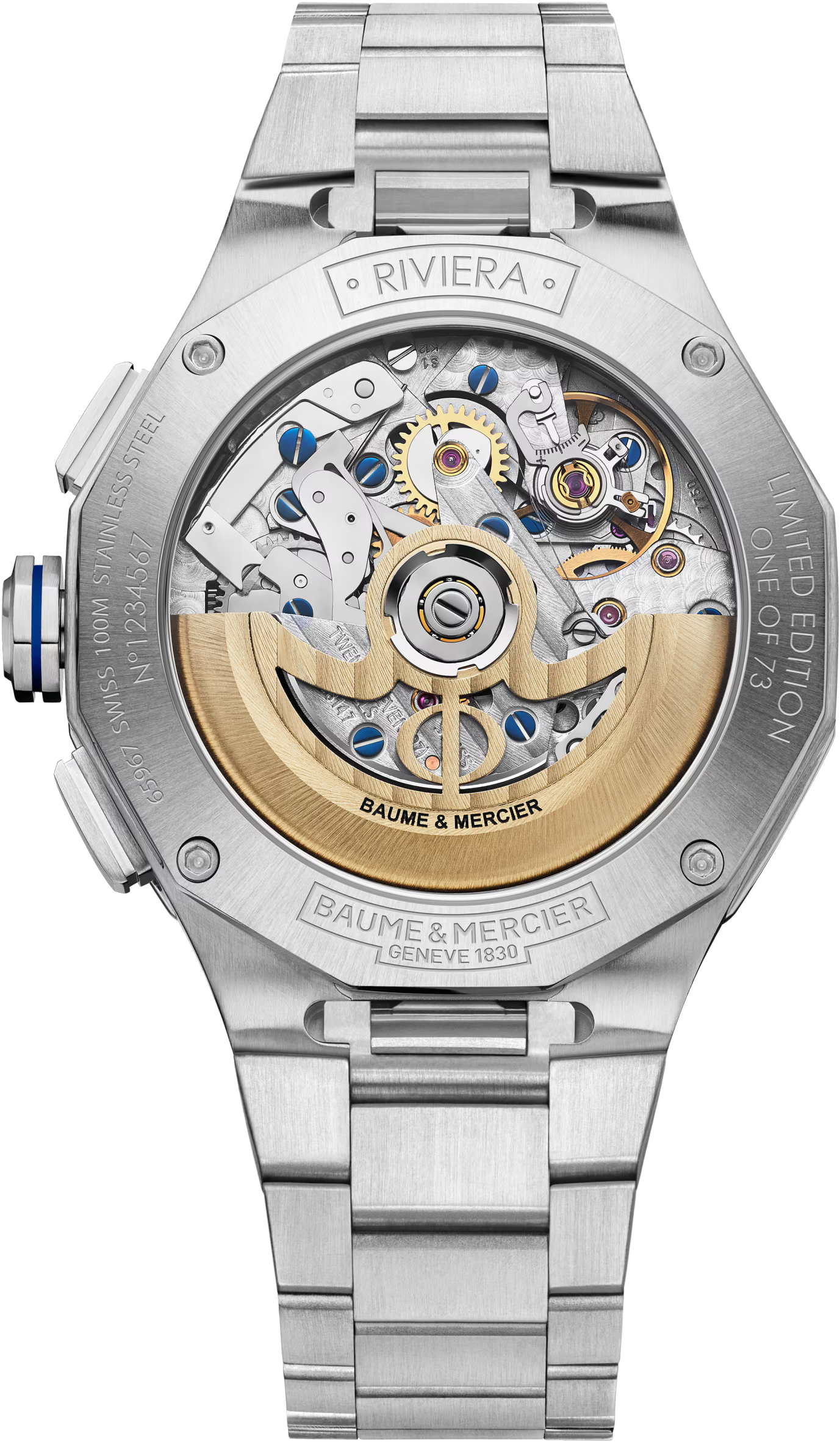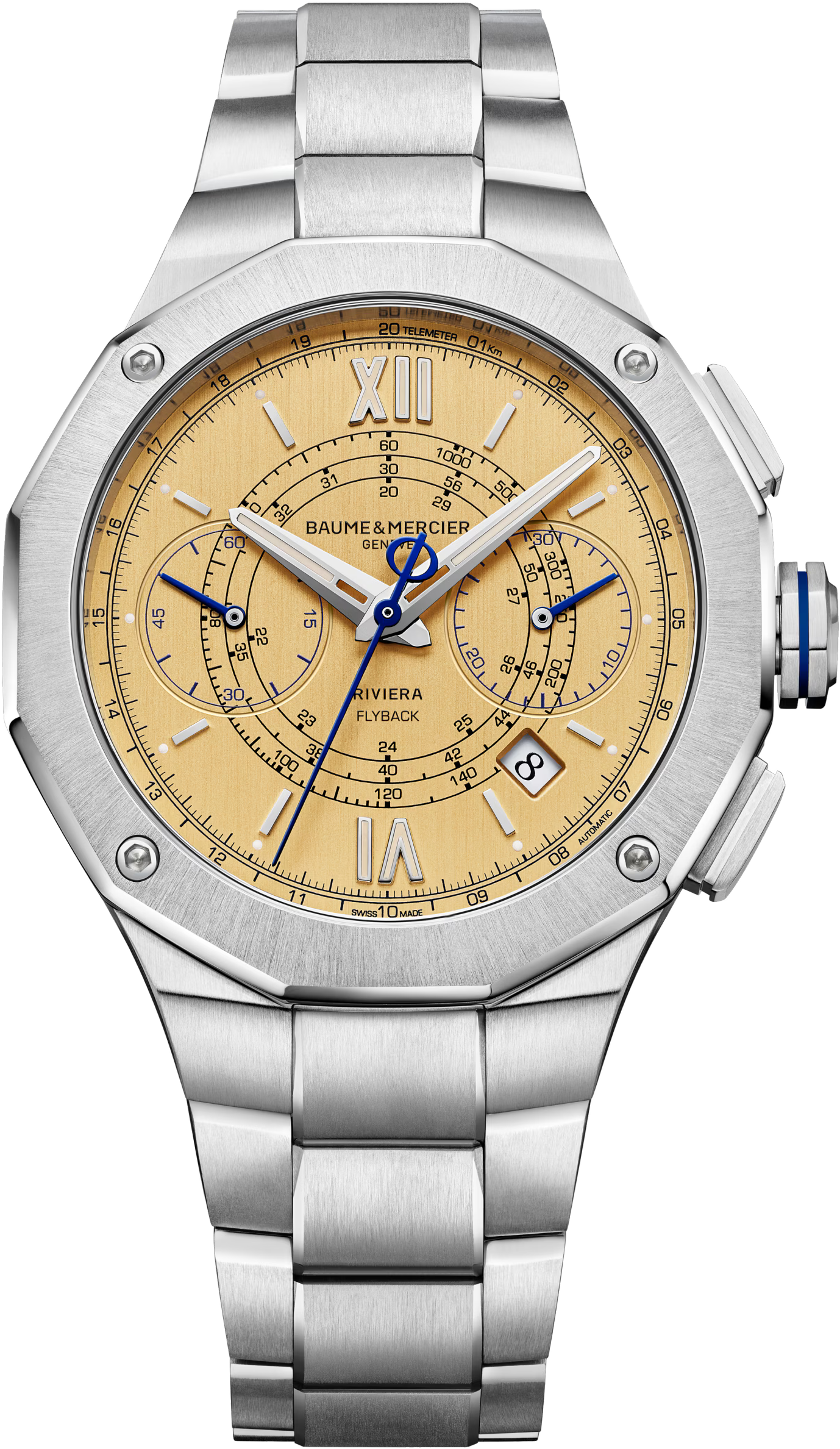 Tyto hodinky Baume & Mercier Riviera jsou vybaveny automatickým švýcarským strojkem Sellita 500 (základ Valjoux 7750) Valjoux a ztělesňují klasický nadčasový design s moderními prvky. Tento model je osazen vertikálním broušeným zlaceným číselníkem se speciálním retronadčasovým vzorem.