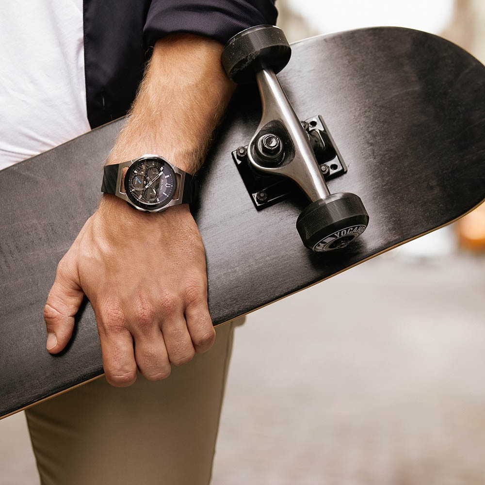 Quartz znamená latinsky krystal. Je tedy zřejmé, že hodinky nemohou být poháněny krystalem - jsou jím, jak již bylo zmíněno výše, řízeny pro maximální přesnost chodu. Krystal je Alfa a Omega přesnosti hodinek - respektive jeho kvalita. Čím je krystal kvalitnější, tím lépe usměrňuje frekvenci kmitů a impulsy jdoucí k magnetickému rotoru jsou stabilnější a chod hodinek je poté přesnější. Kvalita krystalu není úplně směrodatná pouze u hodinek rádiem řízených či hodinek řízených signálem GPS, jelikož tyto hodinky jsou každý den seřizovány signálem pro naprosto přesný čas (obvykle 2x denně). Časový rozdíl, který může vzniknout v mezidobí příjmu signálu je díky dnešním kvalitním krystalům tak nepatrný (cca. setiny vteřiny), že není možné tuto diferenci okem zaznamenat. U hodinek řízených krystalem je pohon zajišťován baterií - napájecím článkem nebo akumulátorem, který se dobíjí např. světlem. Baterie v hodinkách vydrží - dle typu elektroniky a celkově sestrojení strojku - 2 - 10 let. Je důležité vědět, že nejmenší spotřebu napájecího článku (baterie) mají hodinky digitální. Je to proto, protože zde není žádný velký spotřební přísun energie - nasvicuje se zde "pouze" tekutý krystal. Naopak největší spotřebu mají quartzové hodinky v případě zapnutí ručkového chronografu, kdy spolu s časem nám hodinky stopují. Zde je odběr baterie podstatně vyšší, nedoporučuje se tedy mít stále chronograf akční - pouze... (číst více)