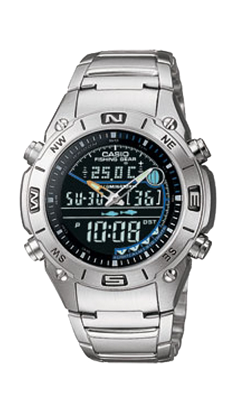 • Funkce a popis:Čas, datum, chronograf = stopky s přesností 1/100 vteřiny max. 24 hodin, celoplošné podsvícení displeje manuálně i náklonem ruky,budíček, hodinový signál, 12/24 hodinový cyklus, fáze měsíce, indikace času pro rybolov, světové časy, teploměr