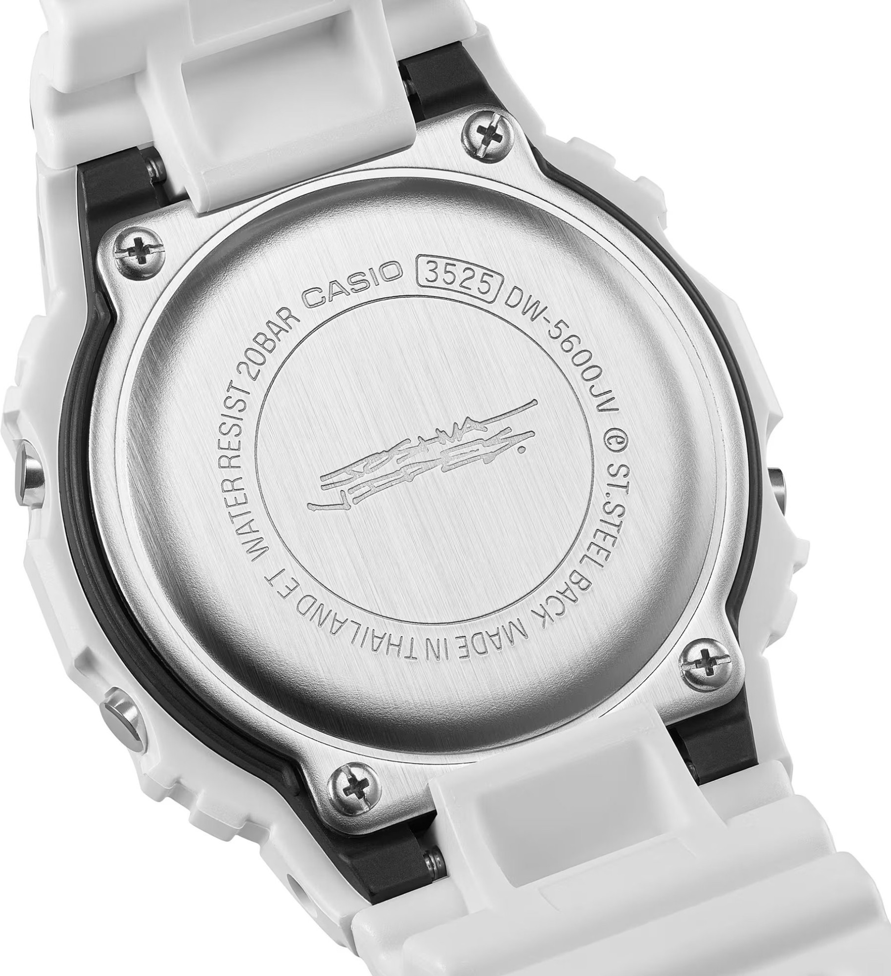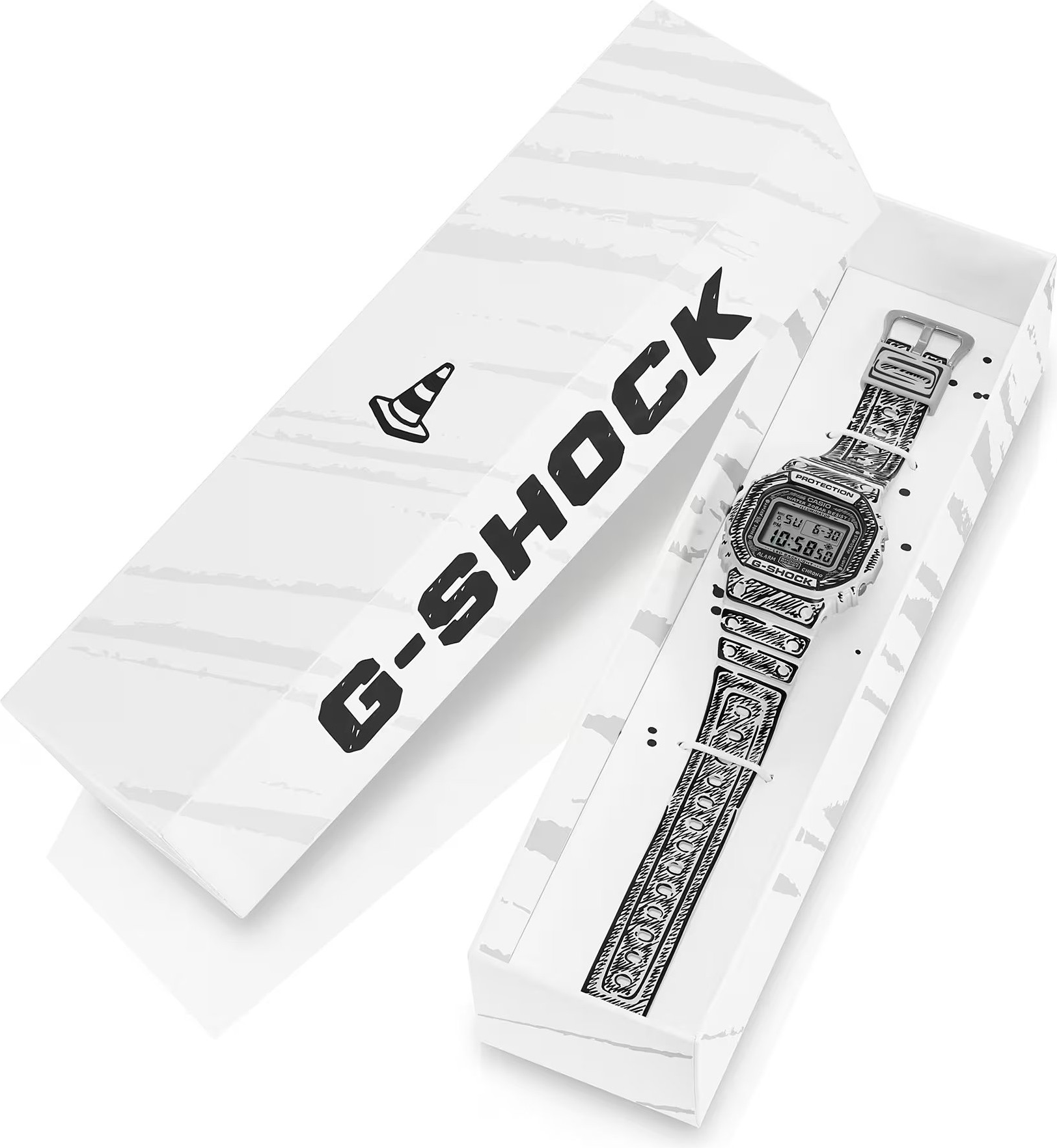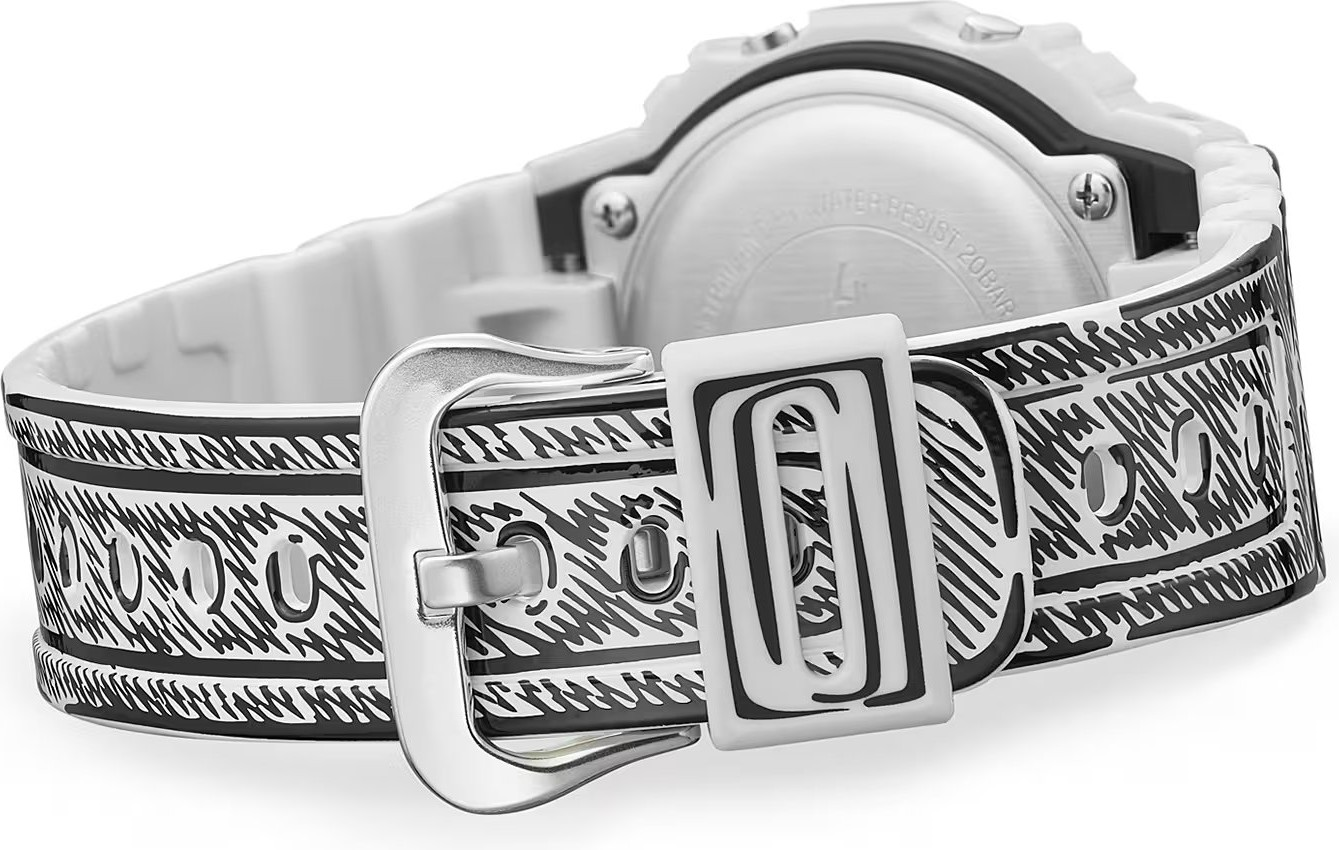 Casio G-SHOCK DW-5600JV-7ER je limitovaná kolaborace s umělcem Joshua Vides, která z ikonického hranatého „square“ designu dělá nepřehlédnutelný doplněk. Monochromatický komiksový styl se propisuje od číselníku přes lunetu až po pásek - bílé plochy doplňují černé linky a lesklejší povrch pro výrazný kontrast. Po aktivaci podsvícení se na displeji objeví motiv „Cone“, typický pro Joshua Vides, a celek doplňuje i speciální balení a rytina na dýnku.
