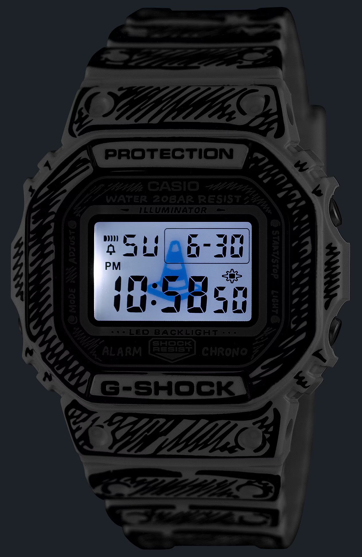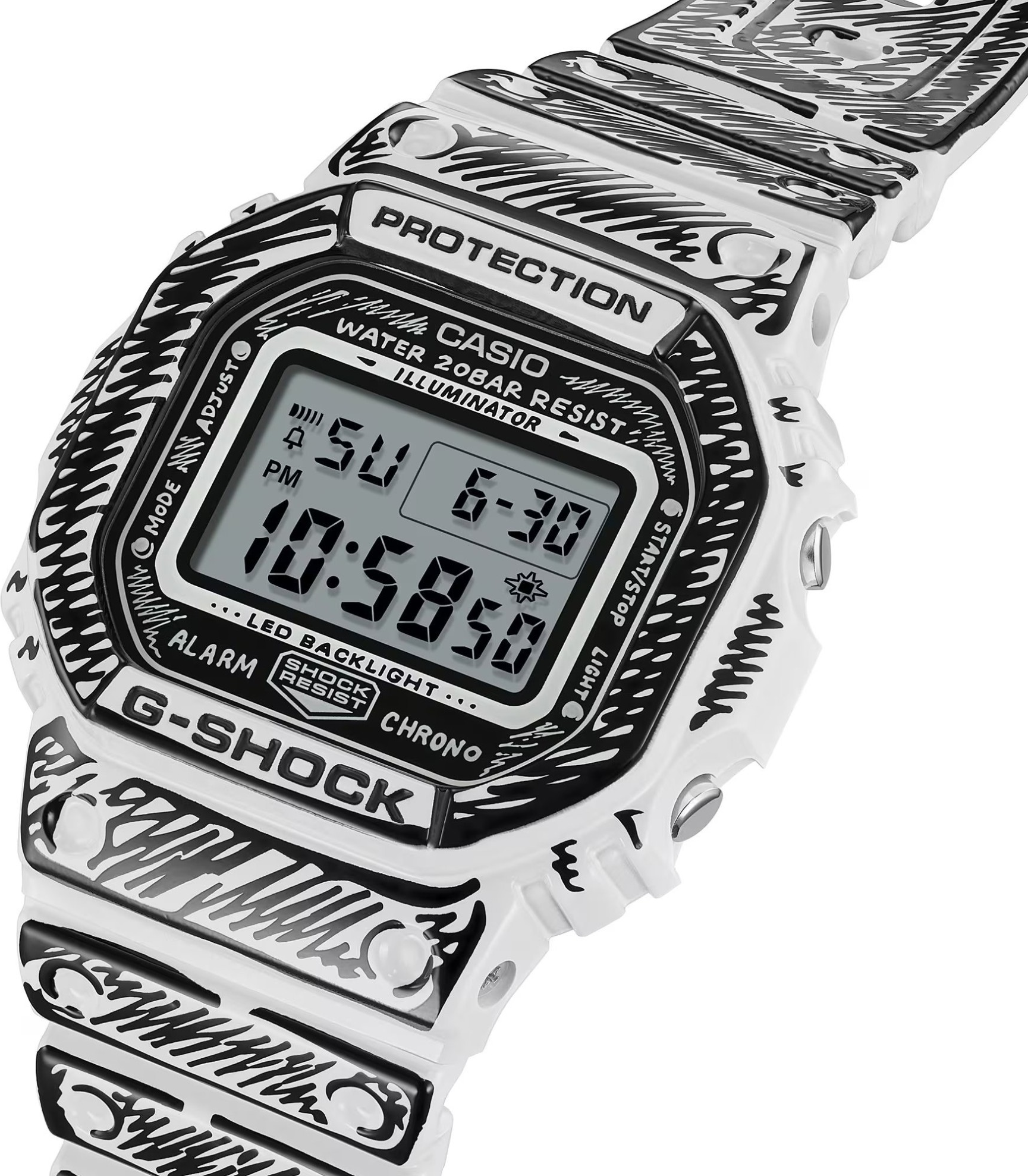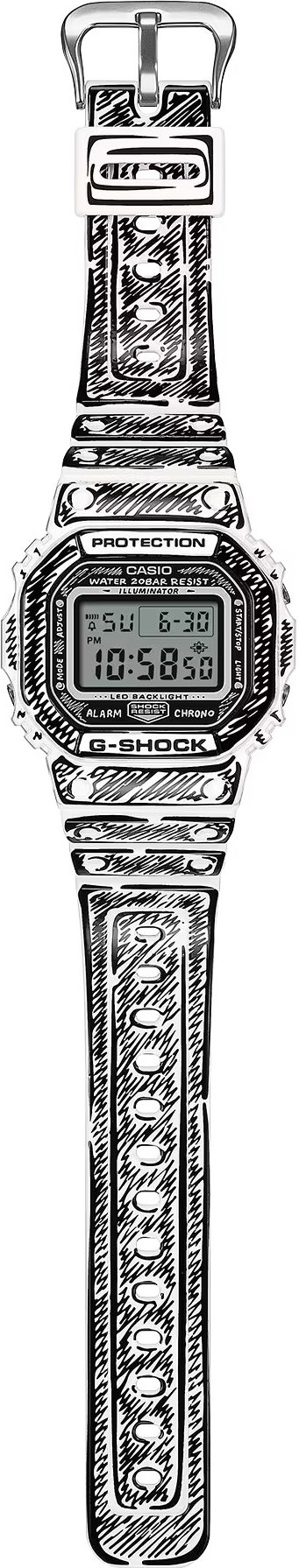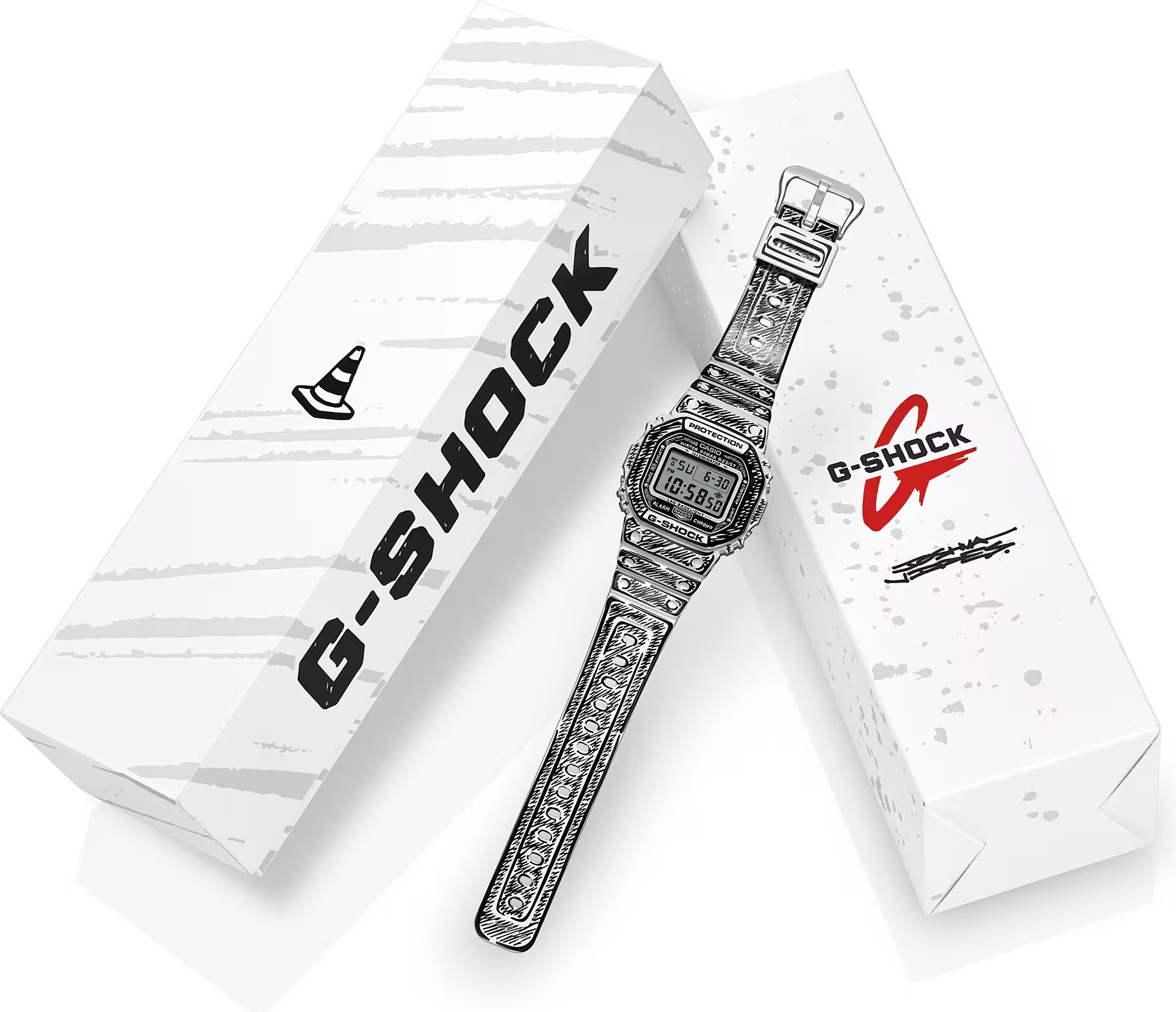 Casio G-SHOCK DW-5600JV-7ER je limitovaná kolaborace s umělcem Joshua Vides, která z ikonického hranatého „square“ designu dělá nepřehlédnutelný doplněk. Monochromatický komiksový styl se propisuje od číselníku přes lunetu až po pásek - bílé plochy doplňují černé linky a lesklejší povrch pro výrazný kontrast. Po aktivaci podsvícení se na displeji objeví motiv „Cone“, typický pro Joshua Vides, a celek doplňuje i speciální balení a rytina na dýnku.